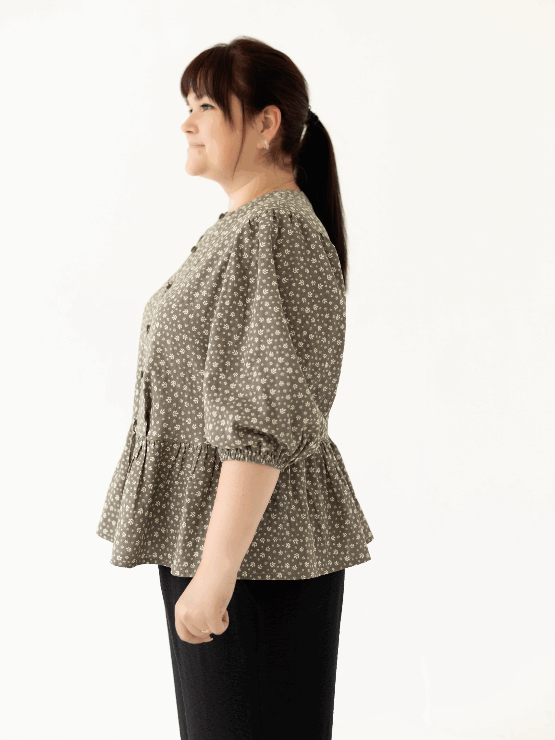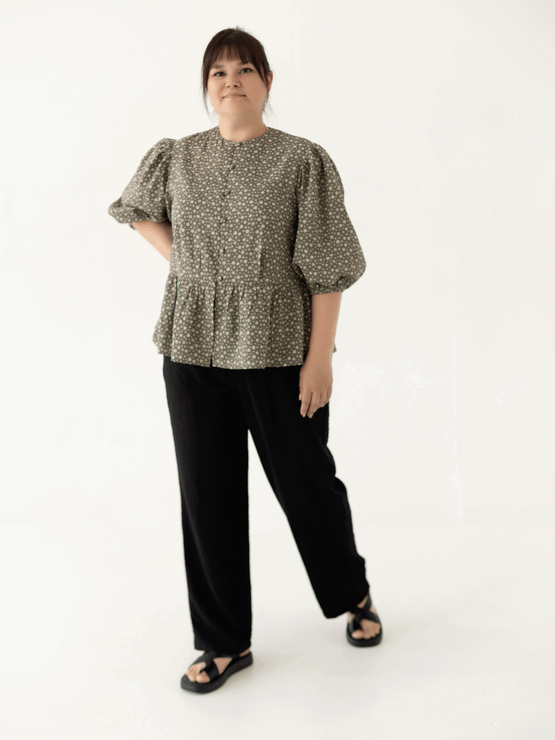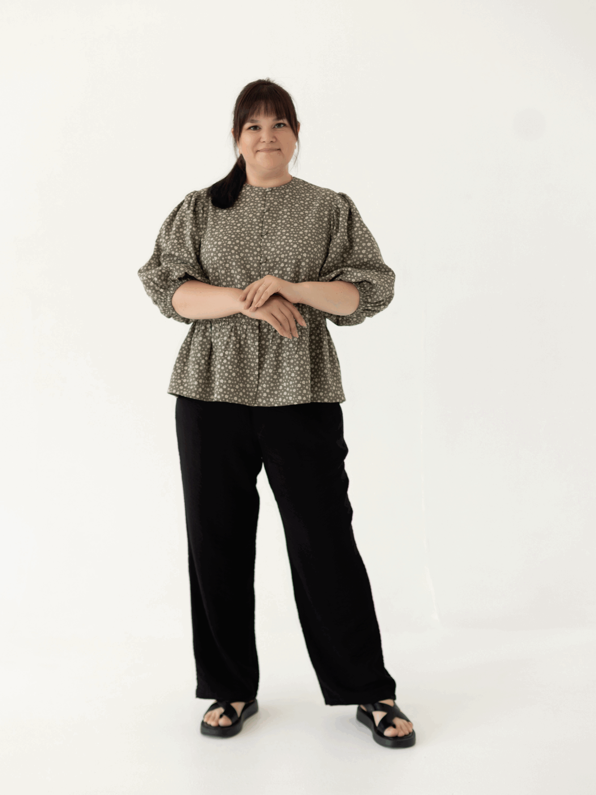 Модель Виктория, блуза 56 размера рост 176 см, реальный размер (на момент фотосессии) 56 рост 173 см. Параметры тела: ОГ 112 см, ОТ 98,5 см, ОБ 120,5 см. Размер выбран по обхвату груди. Сшита из двойного гладкого муслина. Также на Виктории брюки по выкройке «Брук».
