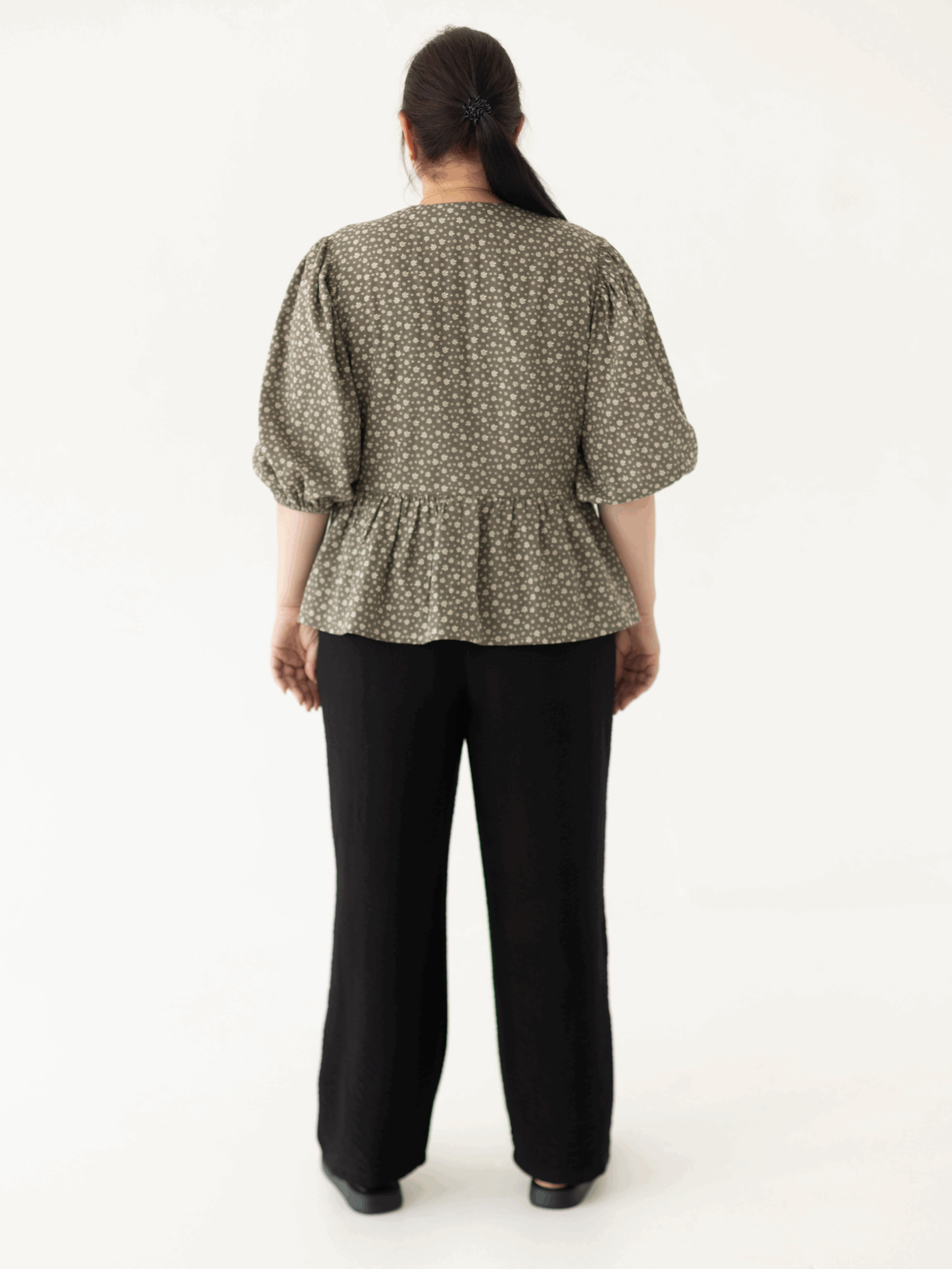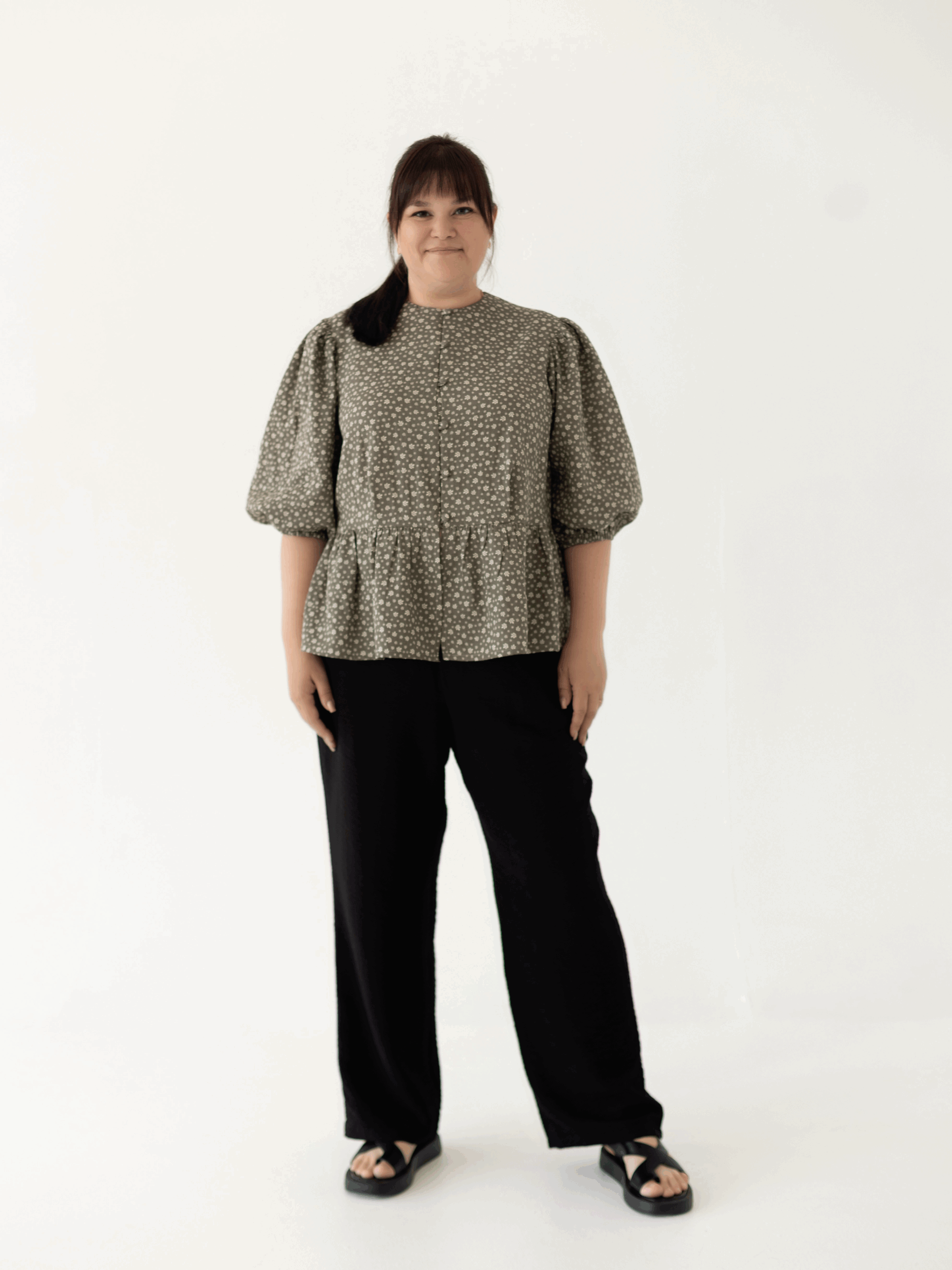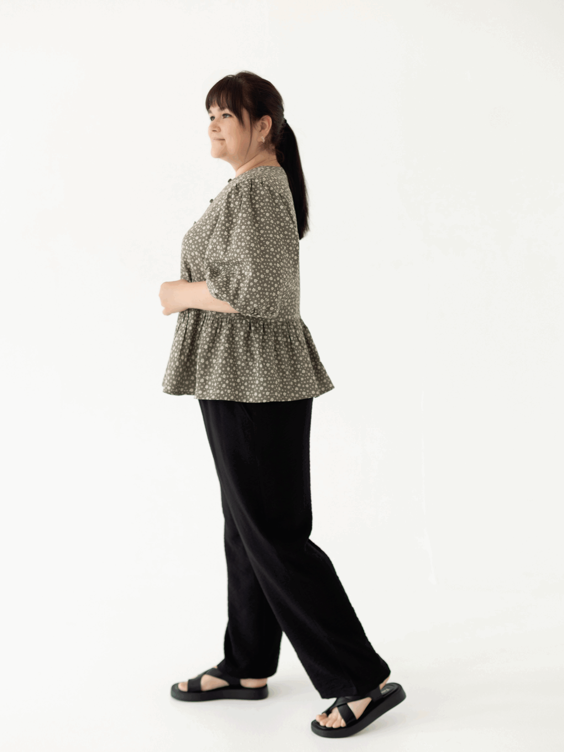 Модель Виктория, блуза 56 размера рост 176 см, реальный размер (на момент фотосессии) 56 рост 173 см. Параметры тела: ОГ 112 см, ОТ 98,5 см, ОБ 120,5 см. Размер выбран по обхвату груди. Сшита из двойного гладкого муслина. Также на Виктории брюки по выкройке «Брук».