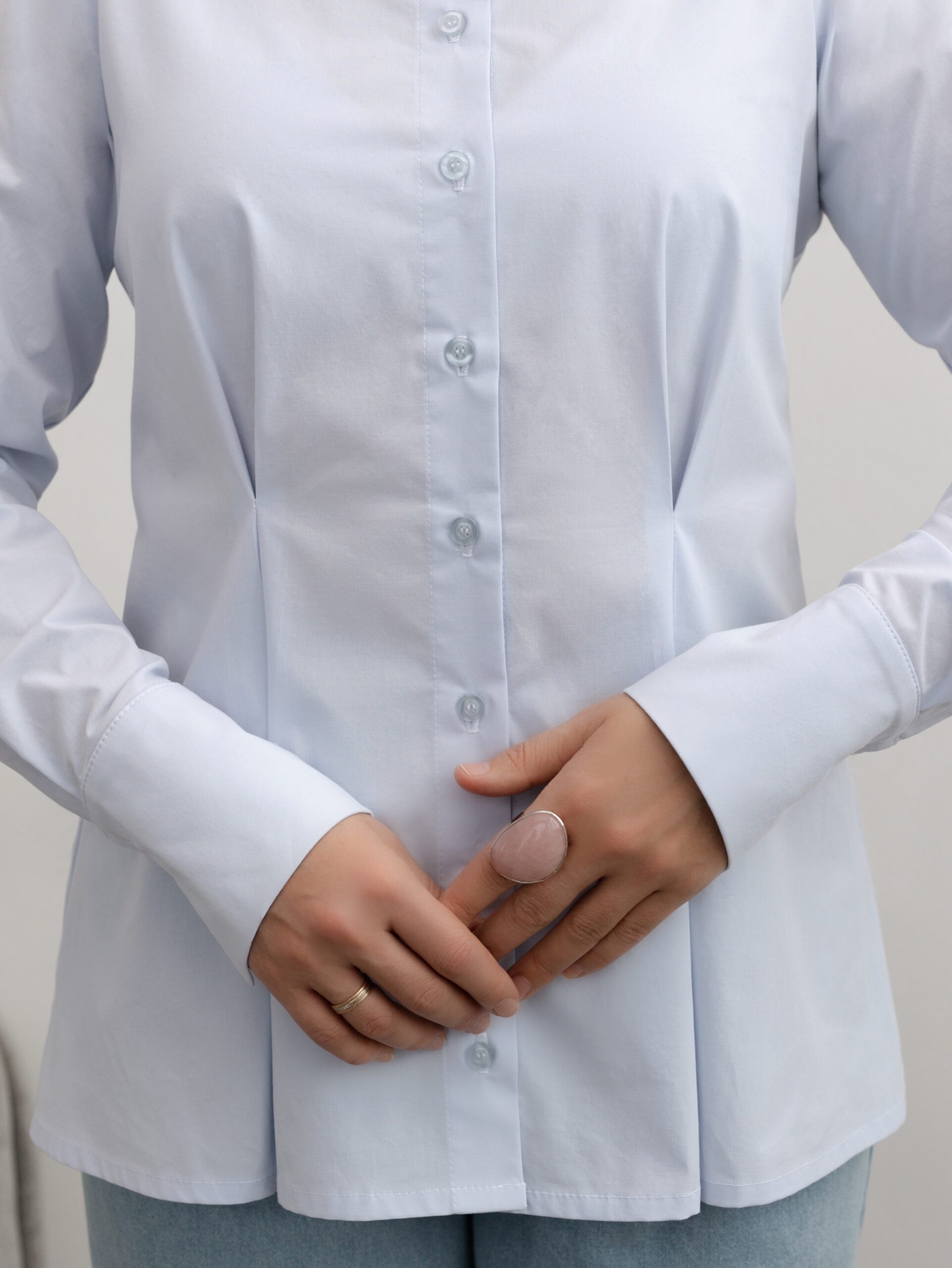 Женская блуза среднего объема, полуприлегающего силуэта, на полочках и спинке в районе талии защипы, длинный втачной рукав, низ рукава обработан двойной притачной манжетой, которая застегивается на пробивную петлю/пуговицу, горловина оформлена воротником на отрезной стойке, центральная застежка на цельнокроенную планку на пришивные пуговицы и пробивные петли.