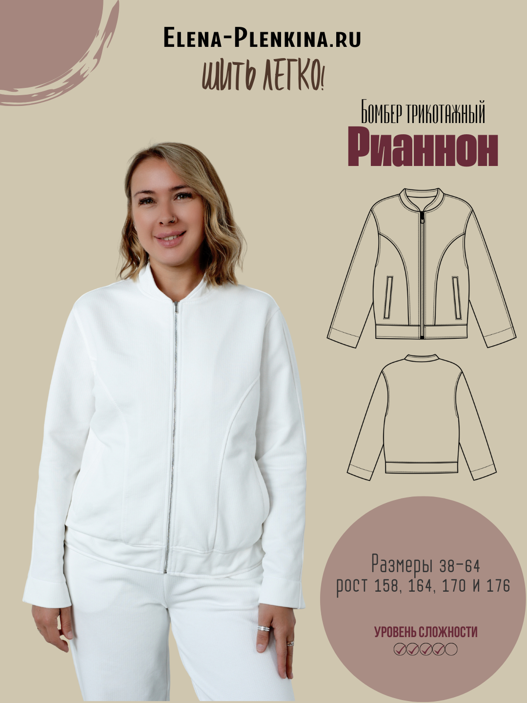 Модель Елена, бомбер 44 размера рост 170 см, реальный размер (на момент фотосессии) 44 рост 167 см. Параметры тела: ОГ 88 см, ОТ 74 см, ОБ 98 см. Размер выбран по обхвату груди. Сшит из трикотажа пике двухнитка, плотность: 295 гр/м2, состав: хлопок 65%, лайкра 2%, пэ 33%. Также на Елене брюки по выкройке «Богдана».