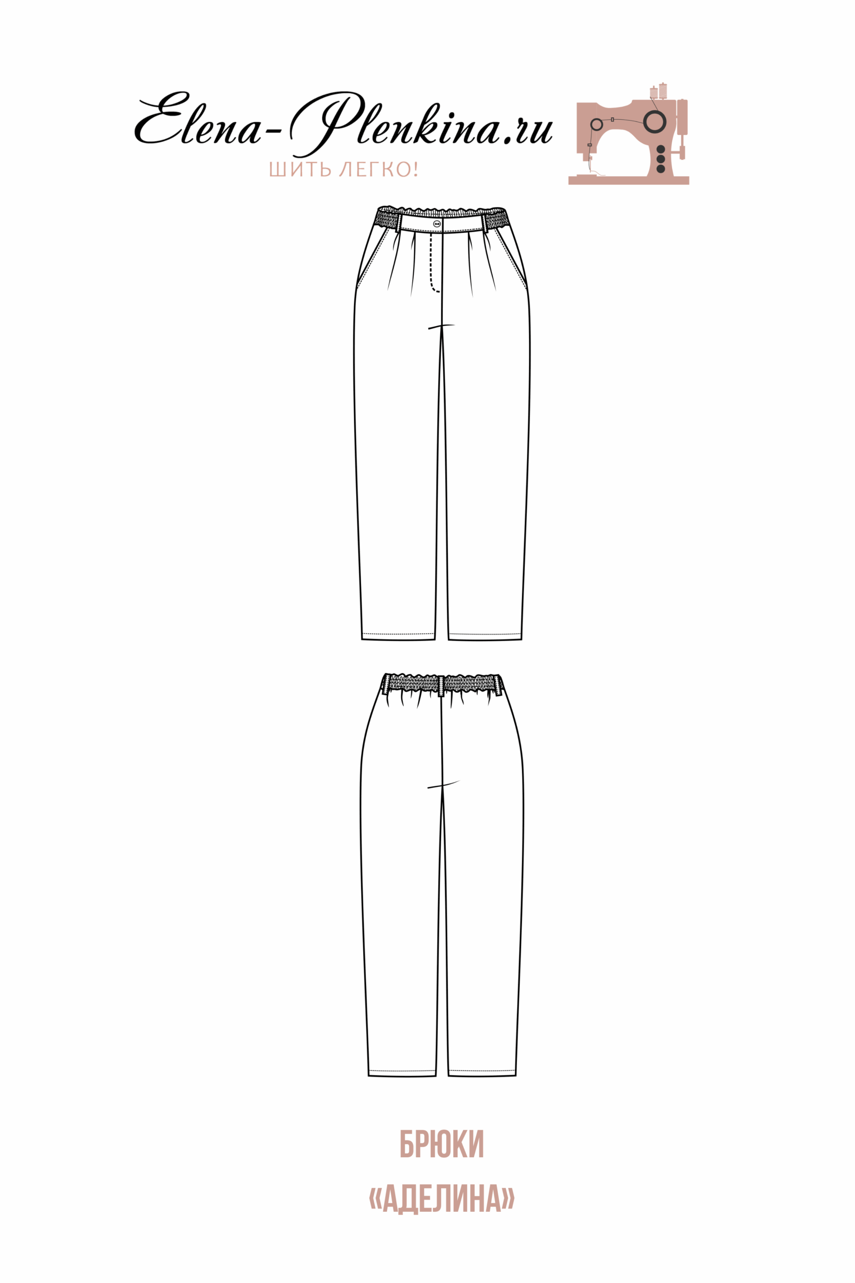 Также вам понадобится брючная молния, одна пуговица, дублерин для укрепления некоторых деталей (см. видеоинструкцию по пошиву), эластичная тесьма для пояса шириной 5 см, длина резинки указана на детали пояса на каждом размере (если ваш обхват талии больше, чем в таблице мерок, длину резинки лучше увеличить, чтобы пояс не перетягивал талию).