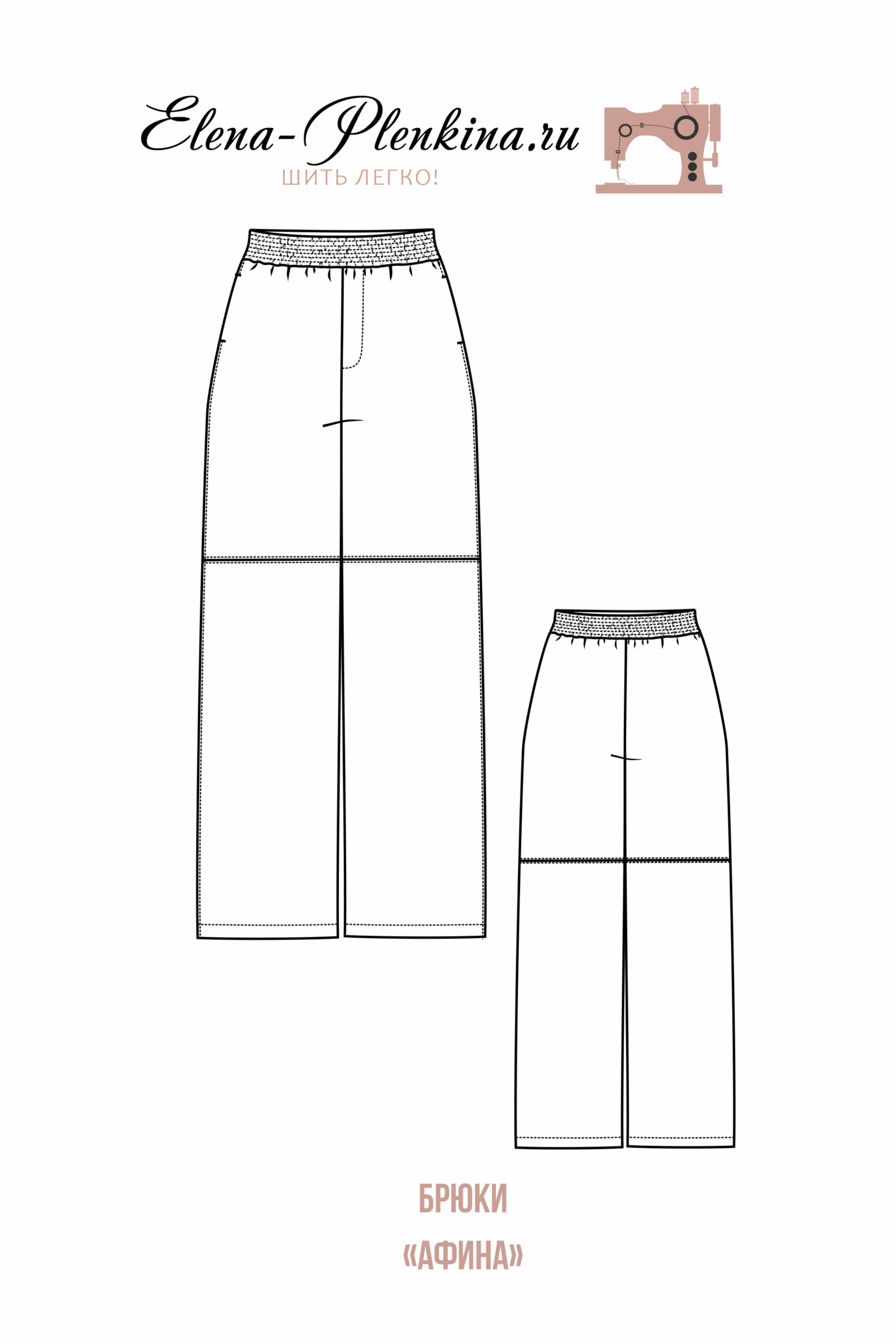 Женские брюки свободного кроя, немного зауженные к низу, средняя посадка чуть ниже линии талии, передние и задние части брюк составные по линии немного выше колена, ложный гульфик, карманы в боковых швах, цельнокроенный с передними и задними частями пояс, внутри пояса широкая эластичная тесьма, пояс отстрочен несколькими строчками, по желанию на пояс можно установить люверсы для шнурка.