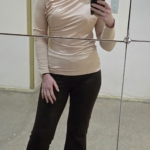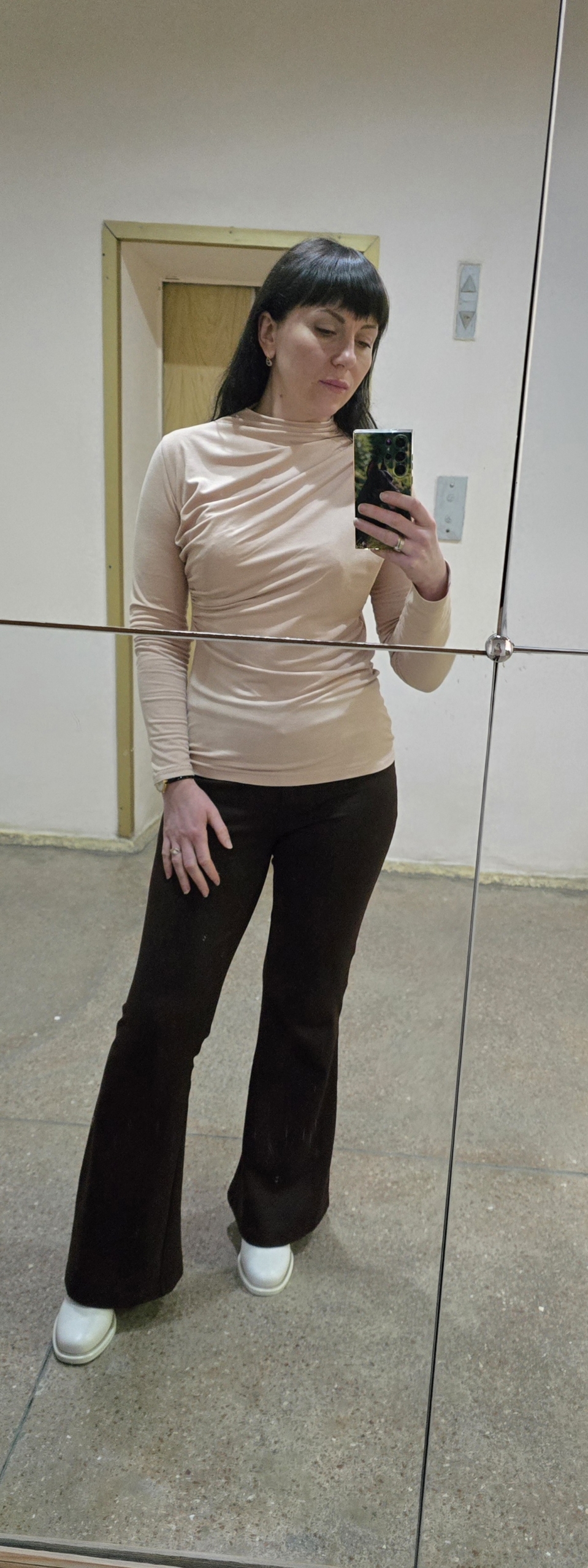 Модель Елена, брюки 44 размера рост 170 см, реальный размер (на момент фотосессии) по обхвату бедер 44-46 рост 167 см. Параметры тела: ОГ 88 см, ОТ 74 см, ОБ 98 см. Выбран 44 размер . Сшиты из трикотажа джерси плотностью 400 гр., состав: 67% вискоза, 28% нейлон, 5% спандекс. Также на Елене блуза по выкройке «Дария», свитер по выкройке «Зина». и лонгслив по выкройке «Изольда».