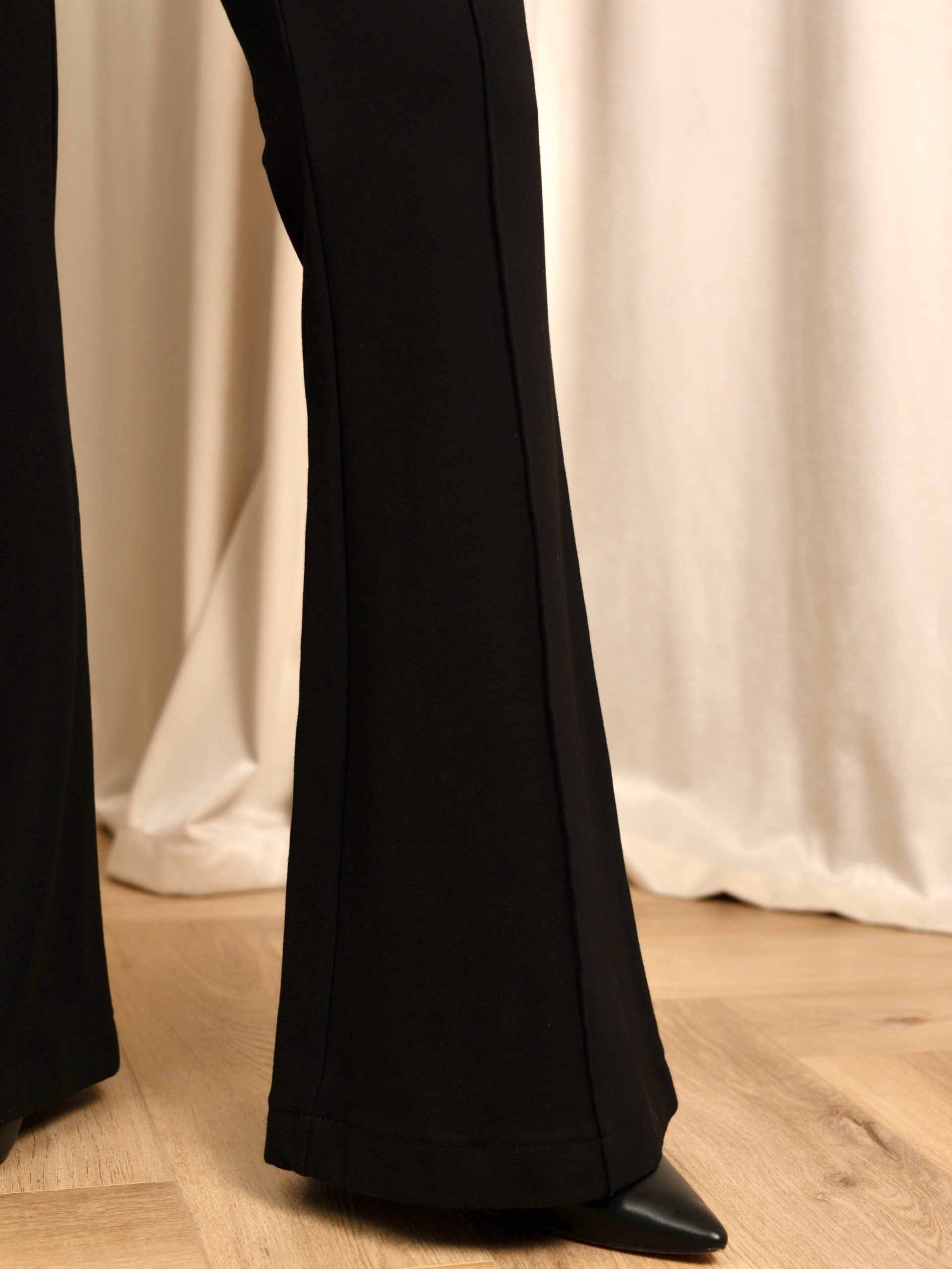 Женские трикотажные облегающие брюки, расклешенные к низу от колена, на передних половинках отстрочены стрелки, верх брюк оформлен подкройной обтачкой, застежка на потайную молнию в боковом шве, длина брюк рассчитана на каблук.