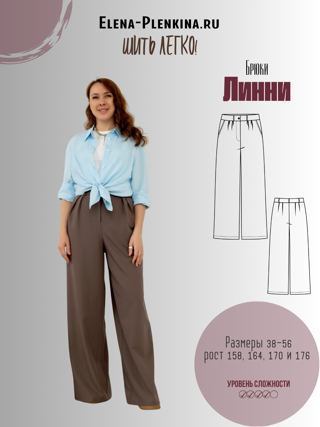Модель Елена, брюки 44 размера рост 170 см, реальный размер (на момент фотосессии) 44 рост 167 см. Параметры тела: ОГ 87 см, ОТ 72 см, ОБ 96 см. Размер выбран по обхвату бедер. Сшиты из костюмной ткани. Состав: 45% вискоза, 50 %п/э, 5% эластан. Также на Елене рубашка по выкройке «Аурика».