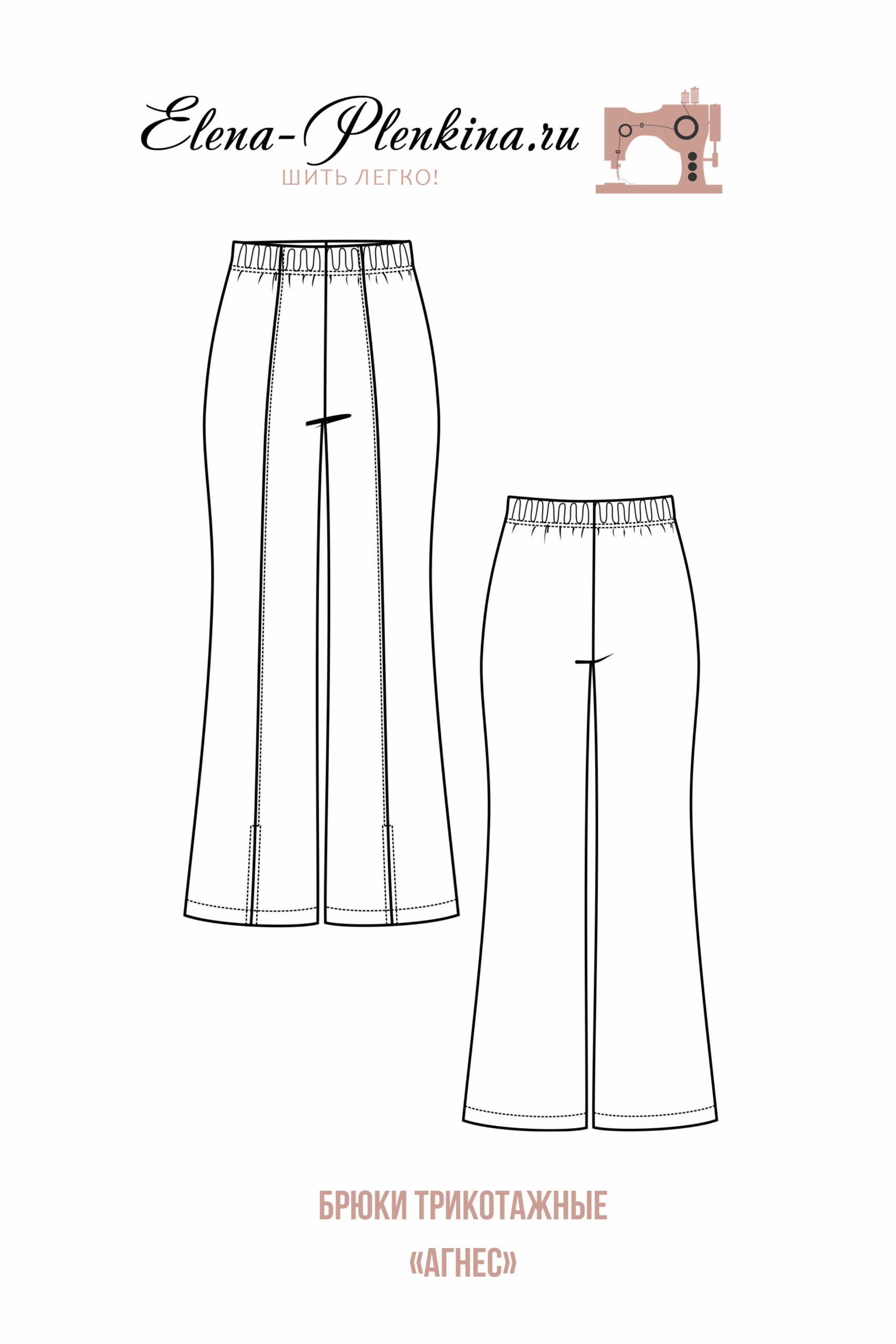 Женские трикотажные брюки умеренного объема, расклешенные к низу от колена, высокая посадка, по верху брюк цельнокроеный пояс с резинкой, передняя половинка брюк состоит из двух деталей, по низу передней части разрез, длина брюк в пол (для обуви на толстой подошве).