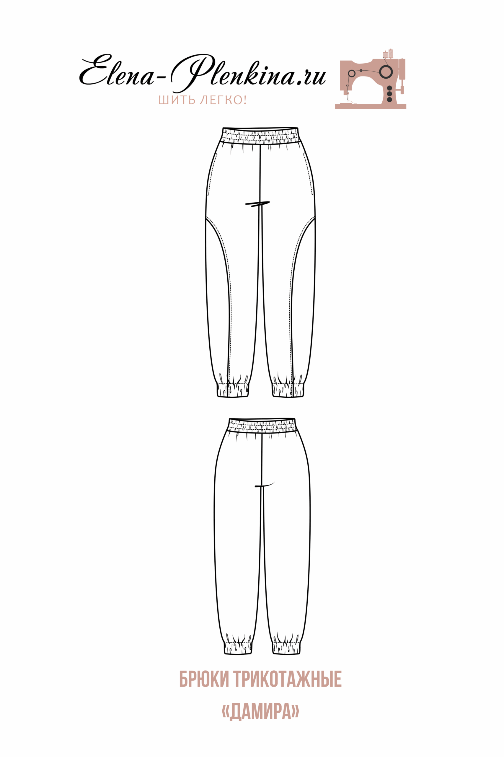 Женские трикотажные брюки умеренного объема, прямого силуэта, высокая посадка до линии талии, карманы в боковых швах, передняя половинка брюк состоит из двух деталей, верх брюк обработан цельнокроеным поясом с эластичной тесьмой внутри, по низу брюк цельнокроеные манжеты с эластичной тесьмой внутри.