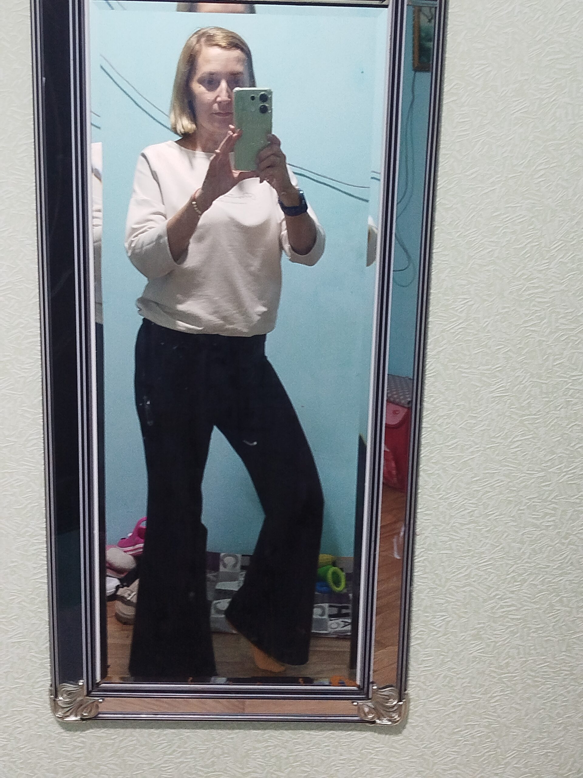 Выкройка понравилась. Брюки сшились легко, за пару часов. Единственное для меня оказался очень широкий клеш, в следующий раз чуть убавлю. И в области бедер спереди образуются небольшие складки, хотя размер выбран норм, 46. В пояс можно вставить широкую резинку. Эти брюки шила из трикотажа найк спорт.