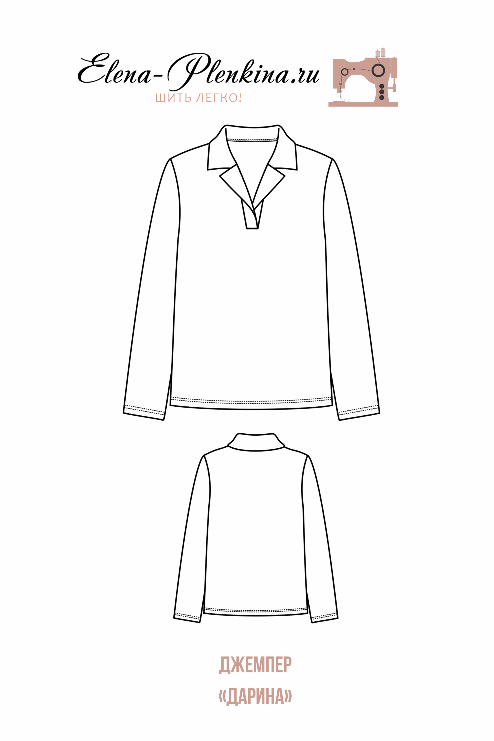 Женский трикотажный джемпер среднего объема, прямого силуэта, застежка-поло с отложным воротником (по желанию можно установить рубашечные кнопки или пришить пуговицы и пробить петли), длинный втачной рукав, длина изделия чуть выше линии бедра.