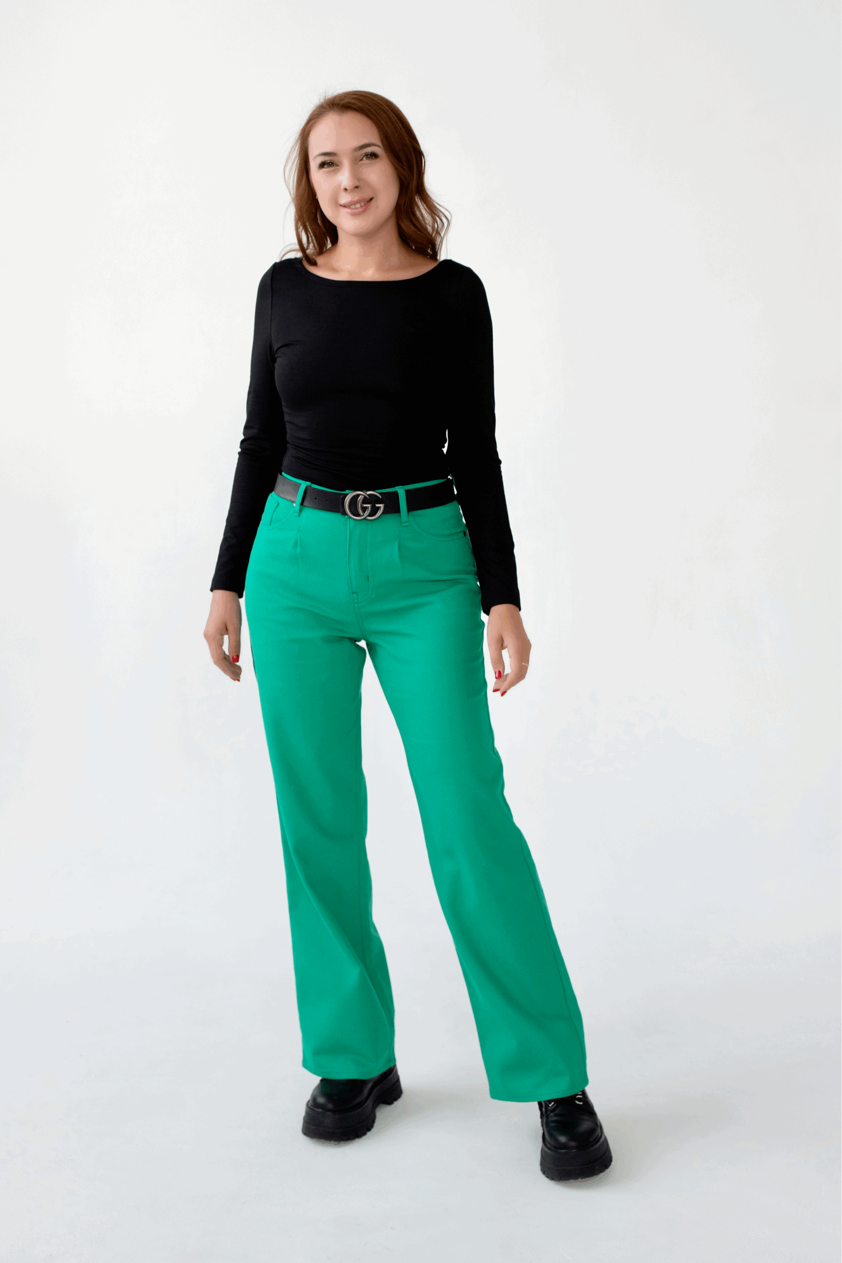 Женские прямые джинсы умеренного объема, высокая посадка, линия талии немного занижена, на передних половинках по лилии талии заложены складки, на задних половинках вытачки и кокетка, на передних половинках карманы с круглым входом, на правом подзоре маленький кармашек, на задних половинках накладные карманы, застежка-гульфик на молнии, притачной пояс, на поясе шлёвки для ремня.