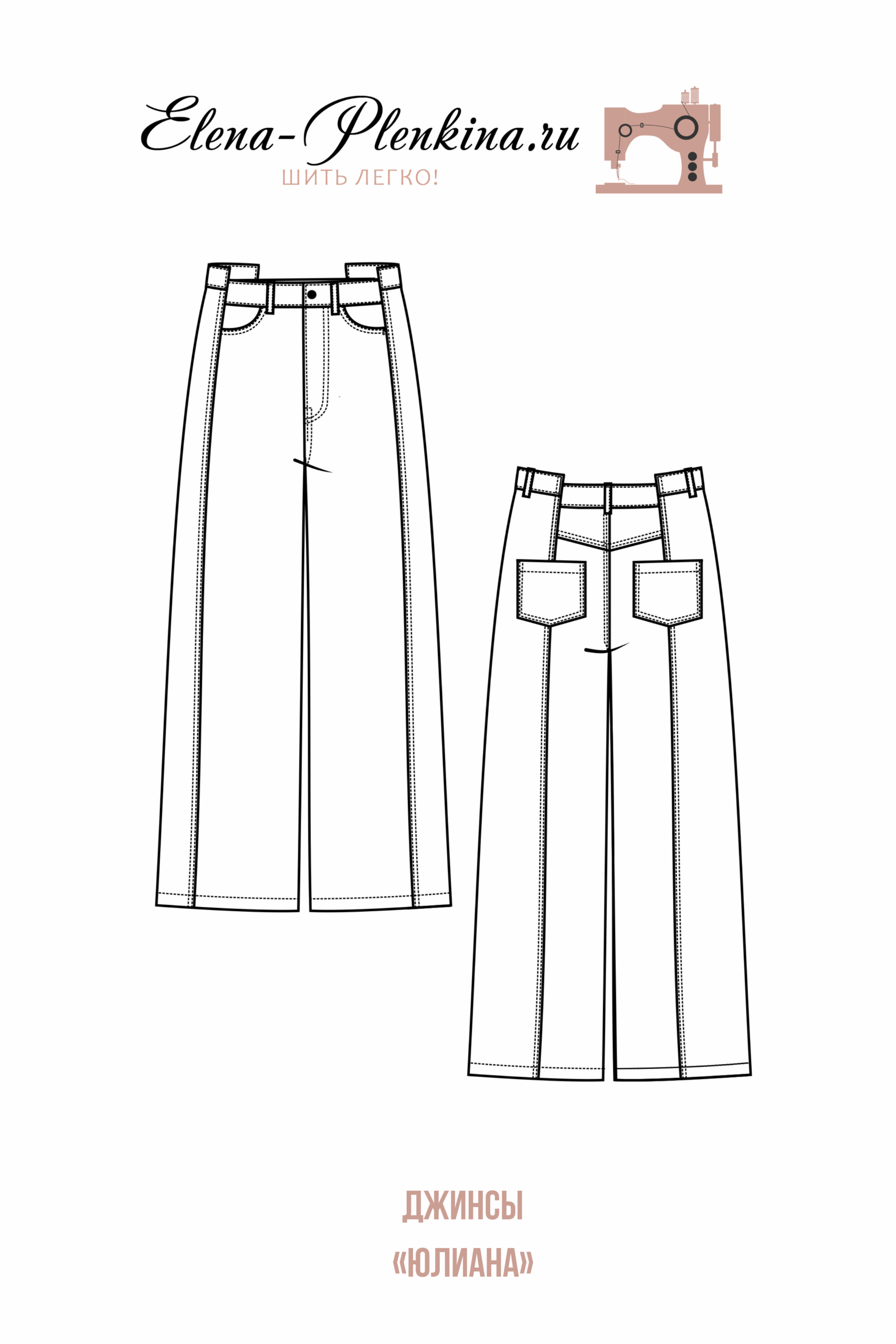 Женские прямые джинсы умеренного объема, высокая посадка до талии, передние и задние половинки состоят из двух частей, на передних половинках вертикальные швы, на задних половинках вертикальные швы, задняя часть с кокеткой, на передних половинках карманы с круглым входом, на задних половинках накладные карманы, застежка-гульфик на молнии, притачной ассиметричный пояс, на поясе шлёвки для ремня.