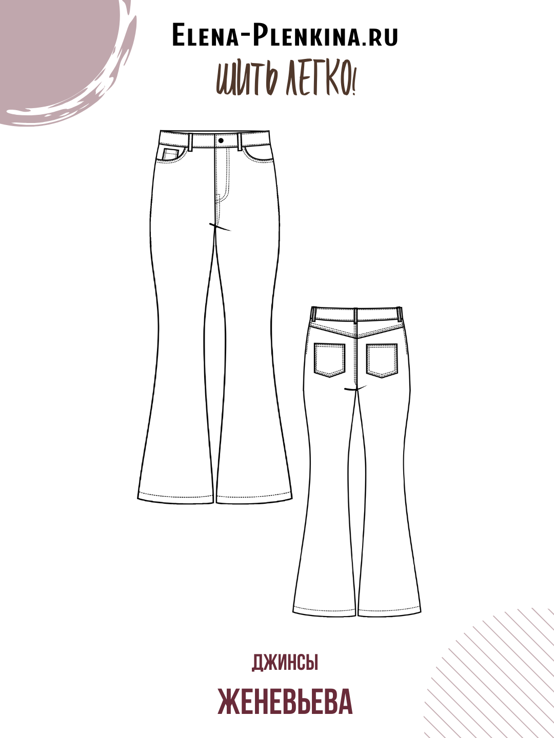 Женские джинсы, плотного прилегания до колена и расклешенные к низу от колена, высокая посадка, задние половинки с кокеткой, на передних половинках карманы с круглым входом, на правом подзоре кармана маленький кармашек, на задних половинках накладные карманы, застежка-гульфик на молнии, притачной пояс, на поясе шлевки для ремня.