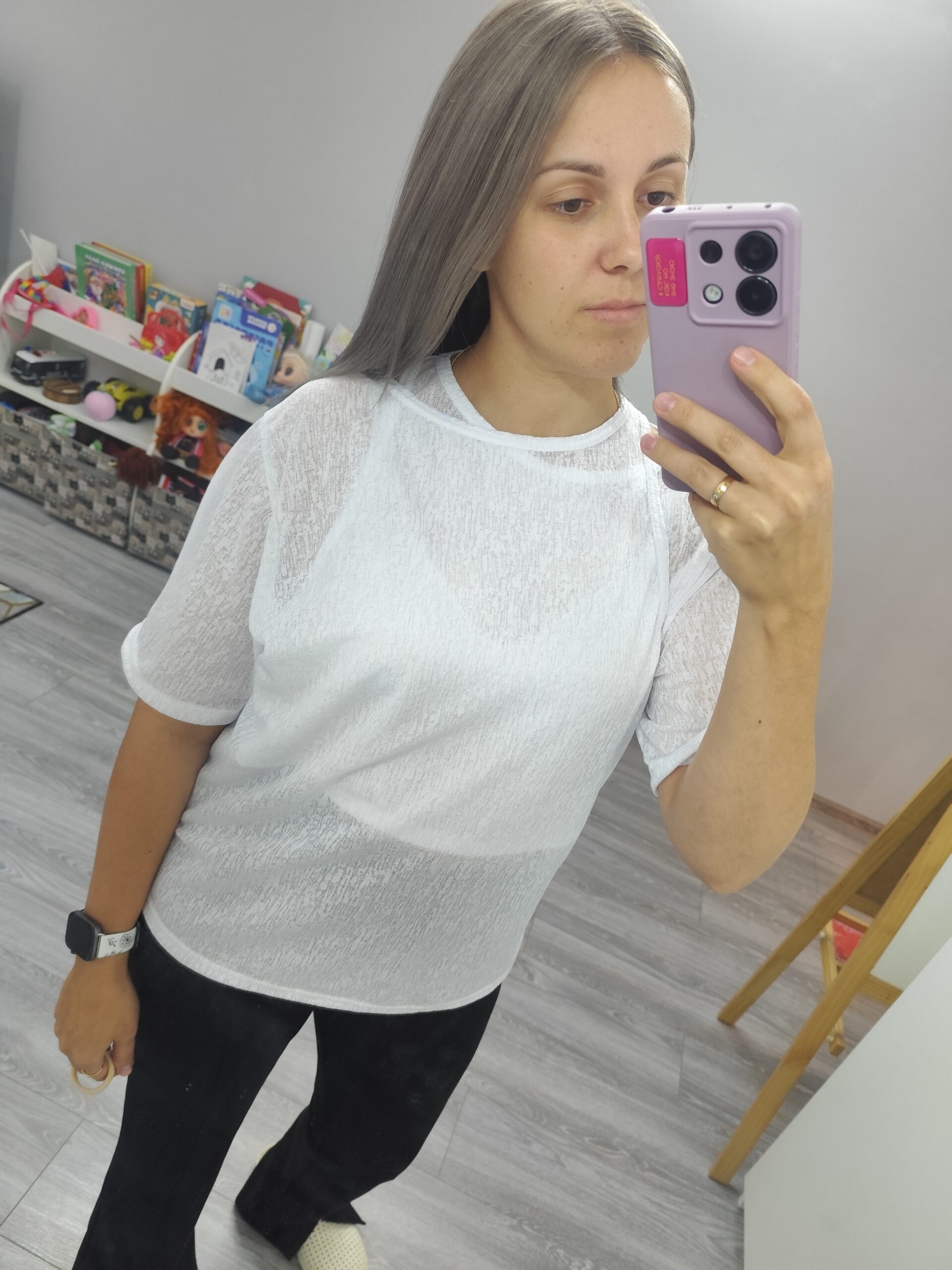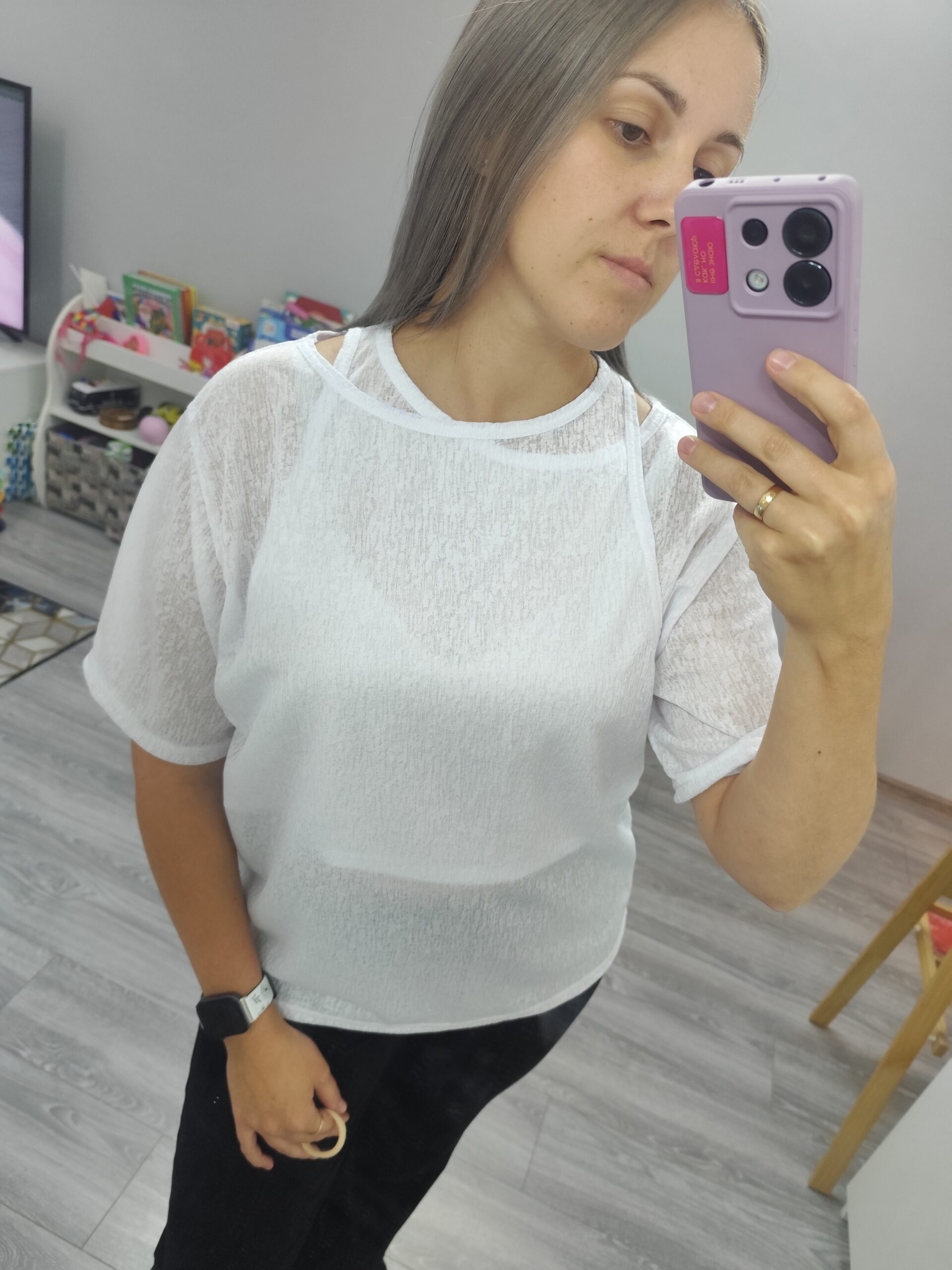 Очень классная футболка. Шила из полупрозрачного трикотажа, на ог 98 брала по сетке свой 50й, можно смело на размер больше, если не кулирка с лайкрой. Дочь требует такую же, будем шить) Спасибо)