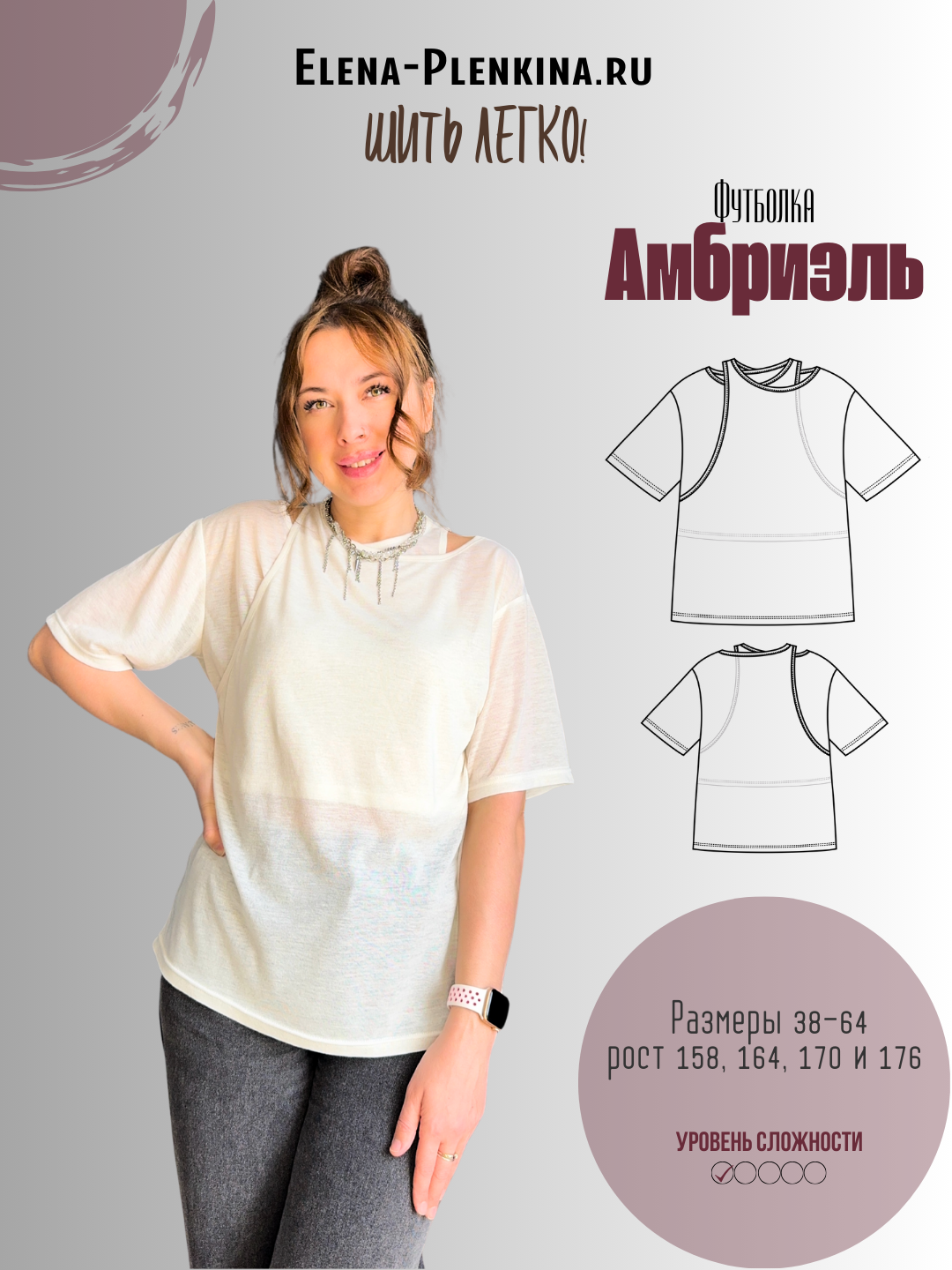 Выкройка представлена в размерах 38-64 на рост 158, 164, 170 и 176 см.