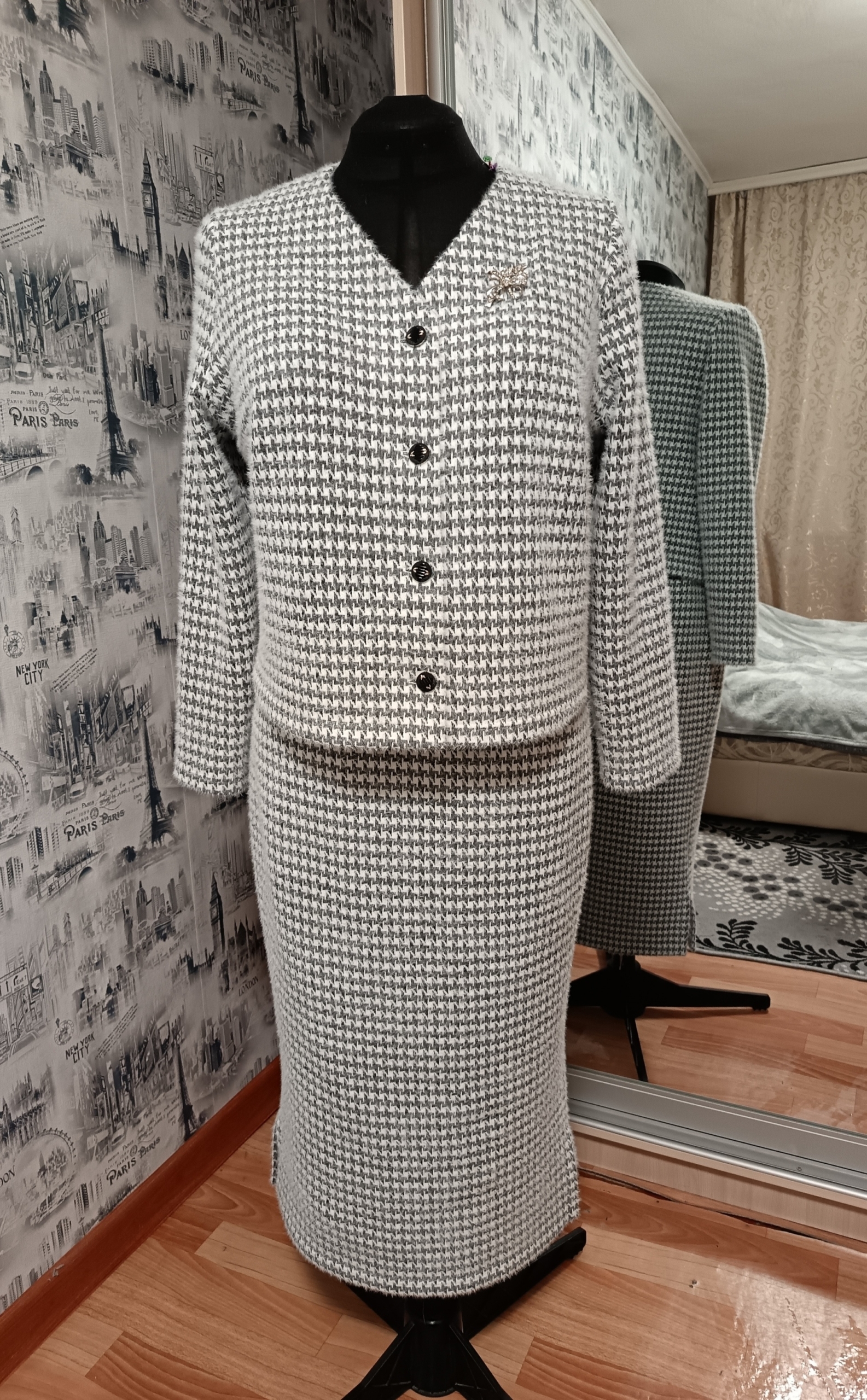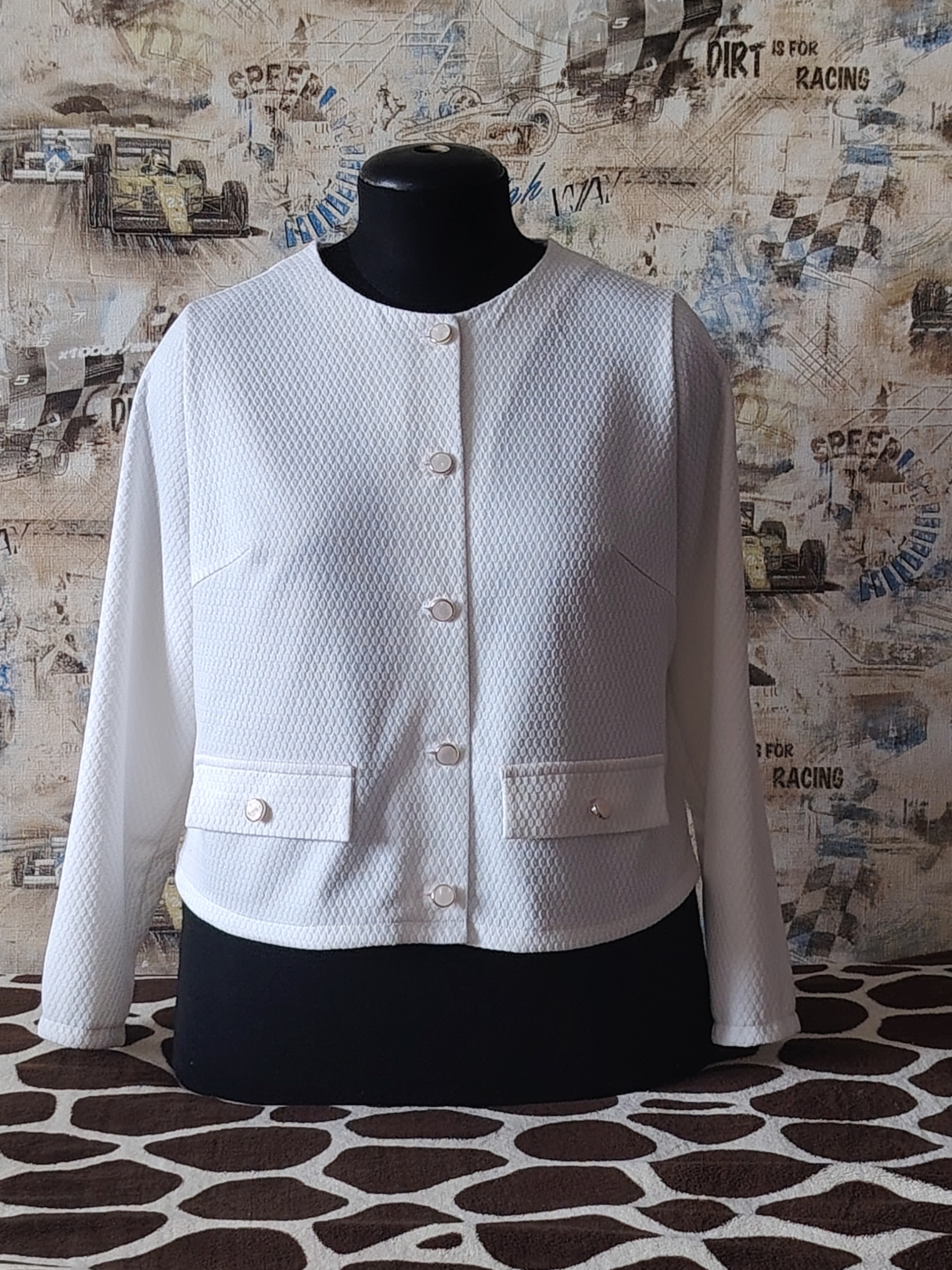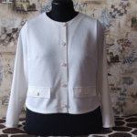 Рекомендуемые материалы – трикотажные полотна высокой плотности (разные виды вязаного трикотажа, плотное джерси). Также вам понадобится трикотажный дублерин, пуговицы – 7 штук.