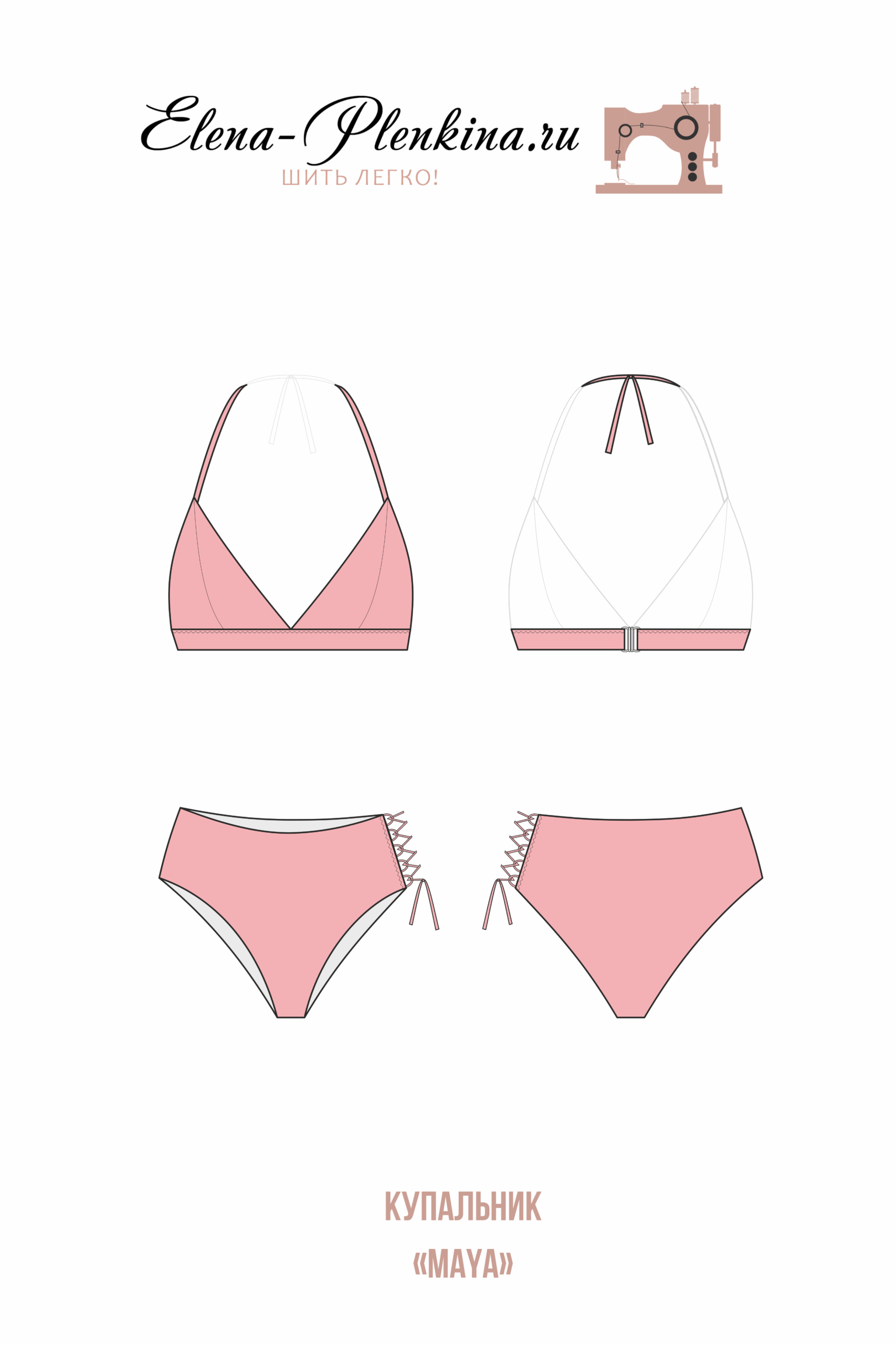 Женский раздельный купальник, состоящий из лифа и трусиков. Чашечки лифа треугольной формы, на подкладке и состоят из двух деталей, пояс лифа из основного трикотажа с металлической застежкой по спинке, по шее завязки из основного трикотажа. Купальные трусики со средней посадкой, на подкладке, в левый боковой шов вшиты навесные петли, через которые продет шнур из основного трикотажа.