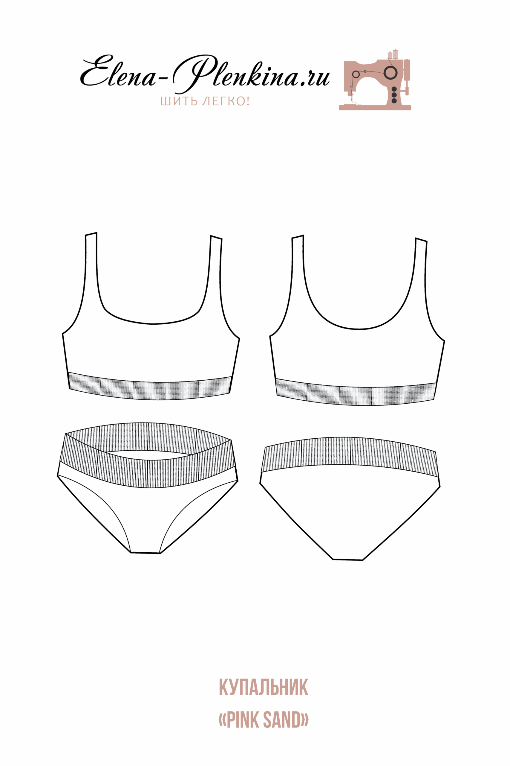 Женский раздельный купальник, состоящий из топа и трусиков. Топ на широких бретелях, на подкладке, по желанию в топ можно продеть съемные чашки, низ топа обработан широким притачным поясом с широкой резинкой внутри. Трусики со средней посадкой, на подкладке, верх трусиков обработан широким притачным поясом с широкой резинкой внутри.
