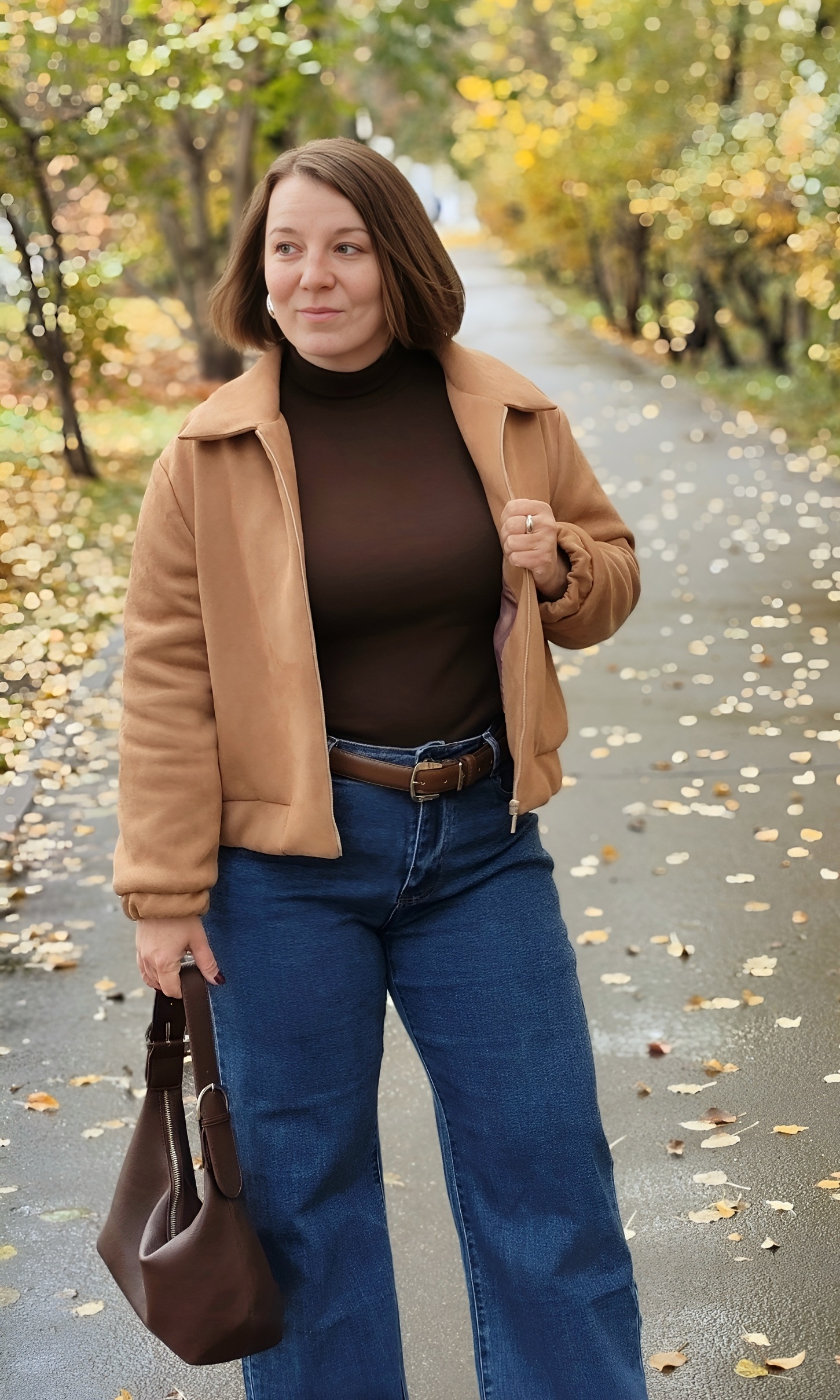 Сшила бомбер по выкройке Зарина, из Экозамши. Внесла свои изменения – вместо воротника – кашкорсе, карманы накладные, без манжет. Результат понравился.