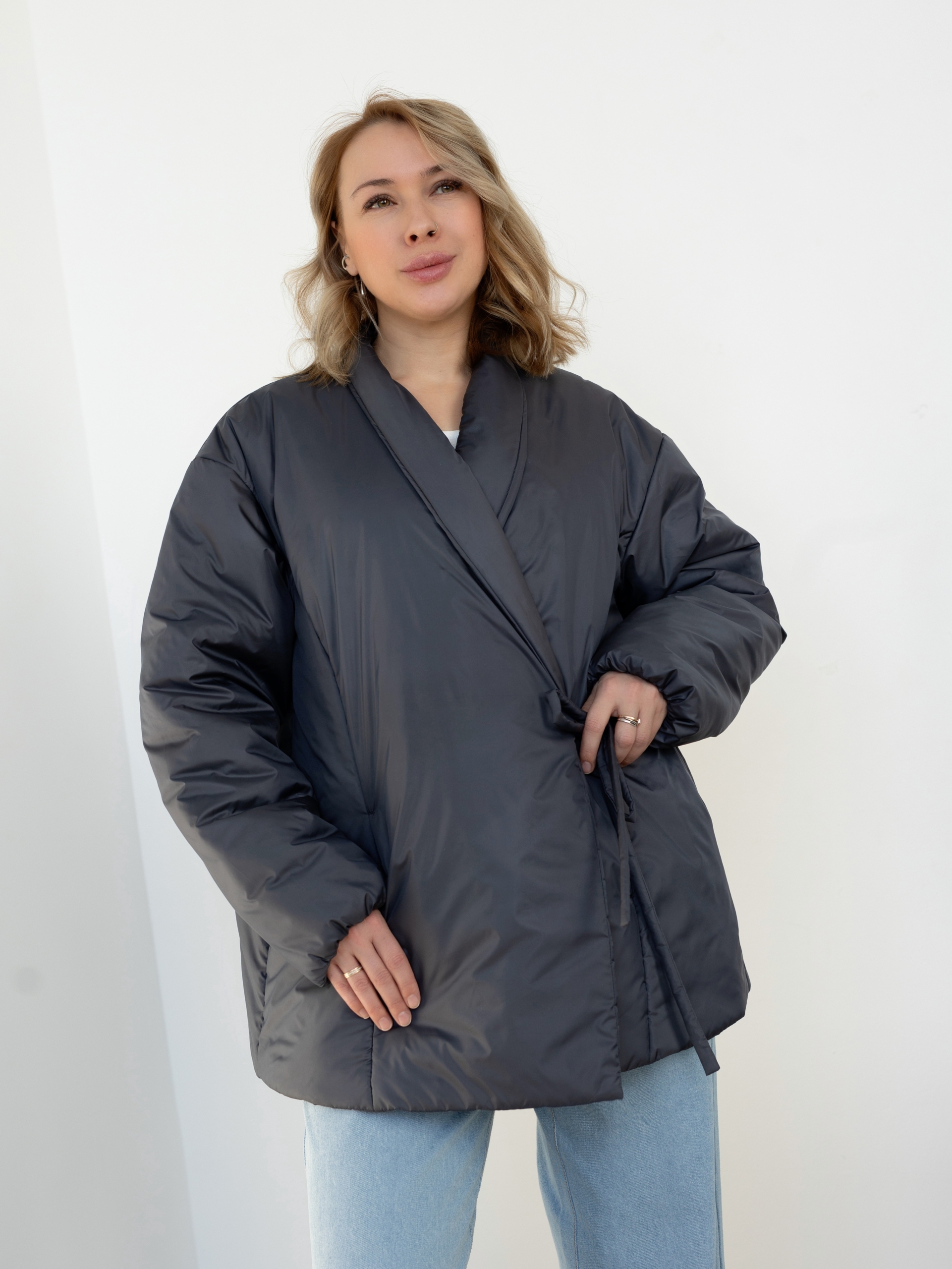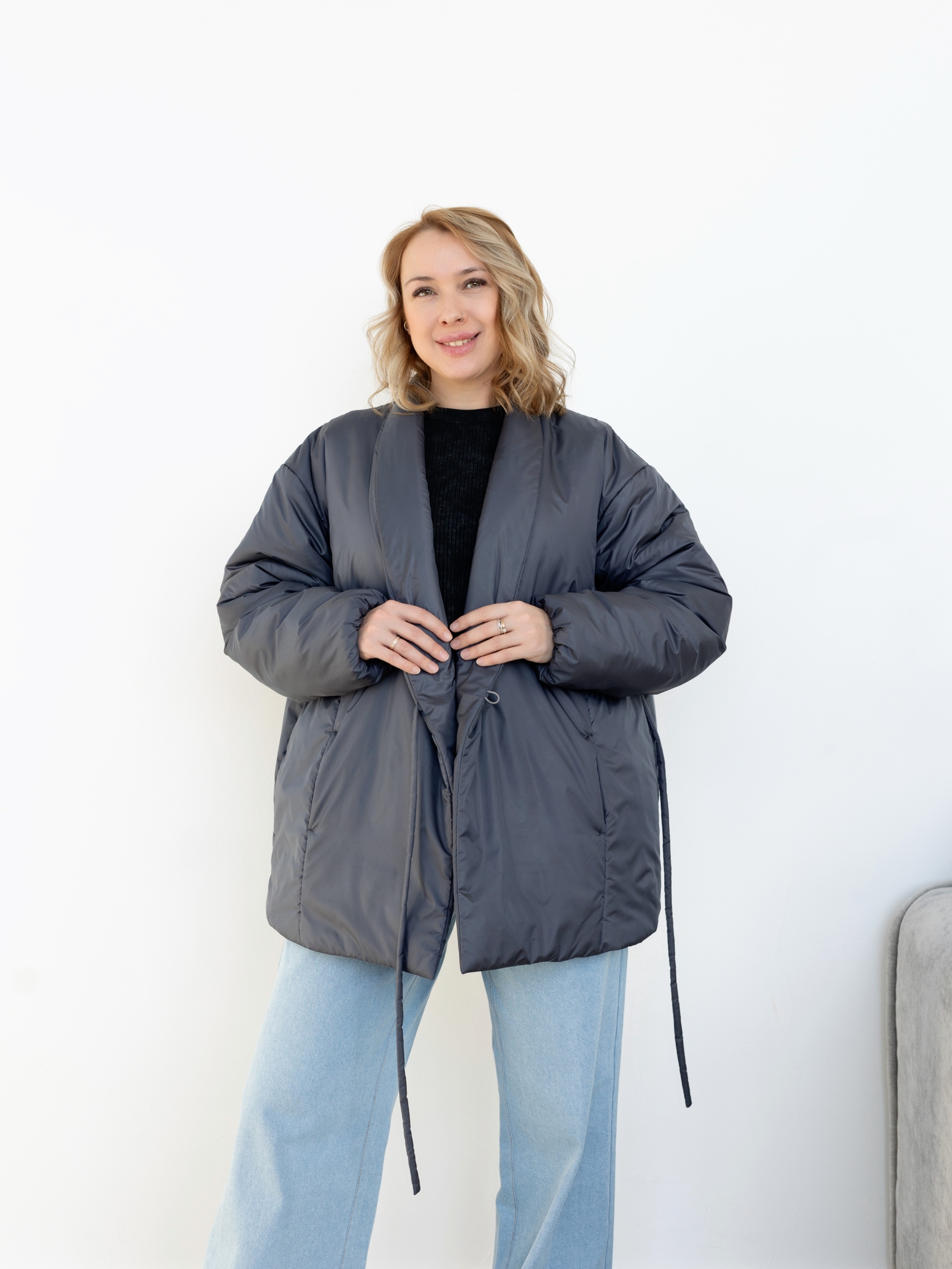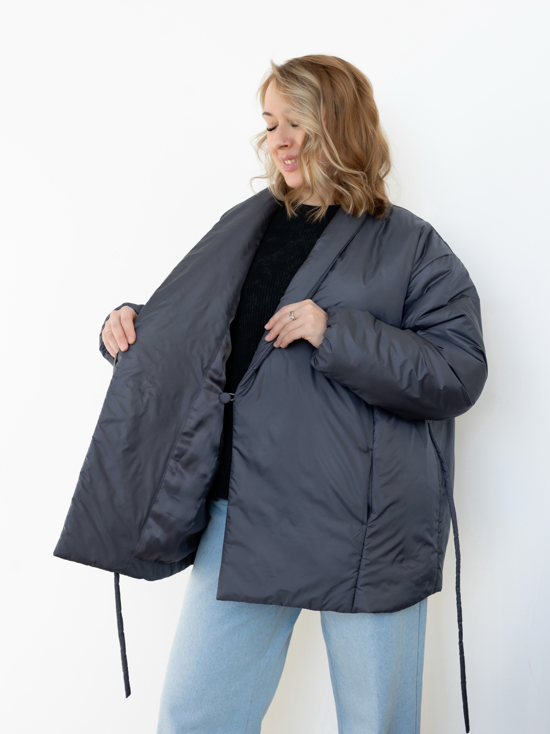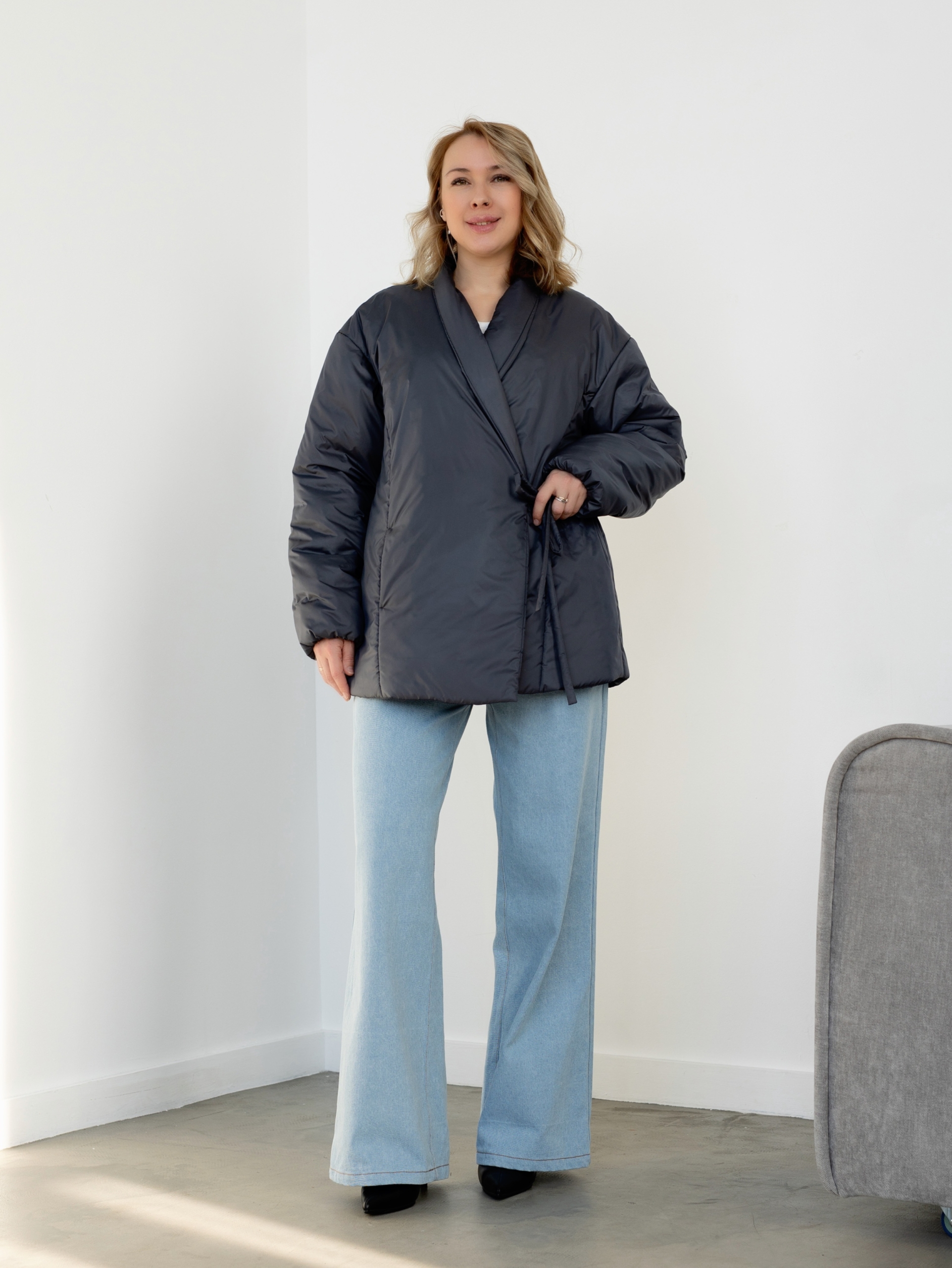 Модель Елена, куртка 44 размера рост 170 см, реальный размер (на момент фотосессии) по обхвату груди 44 рост 167 см. Параметры тела: ОГ 87 см, ОТ 72 см, ОБ 96 см. Размер выбран 44 по обхват груди. Ткань верха — курточная ткань стайл, утеплитель — слайтекс 150 гр, на подкладке поливискозная подкладочная ткань. Также на Елене джинсы по выкройке «Донна».
