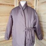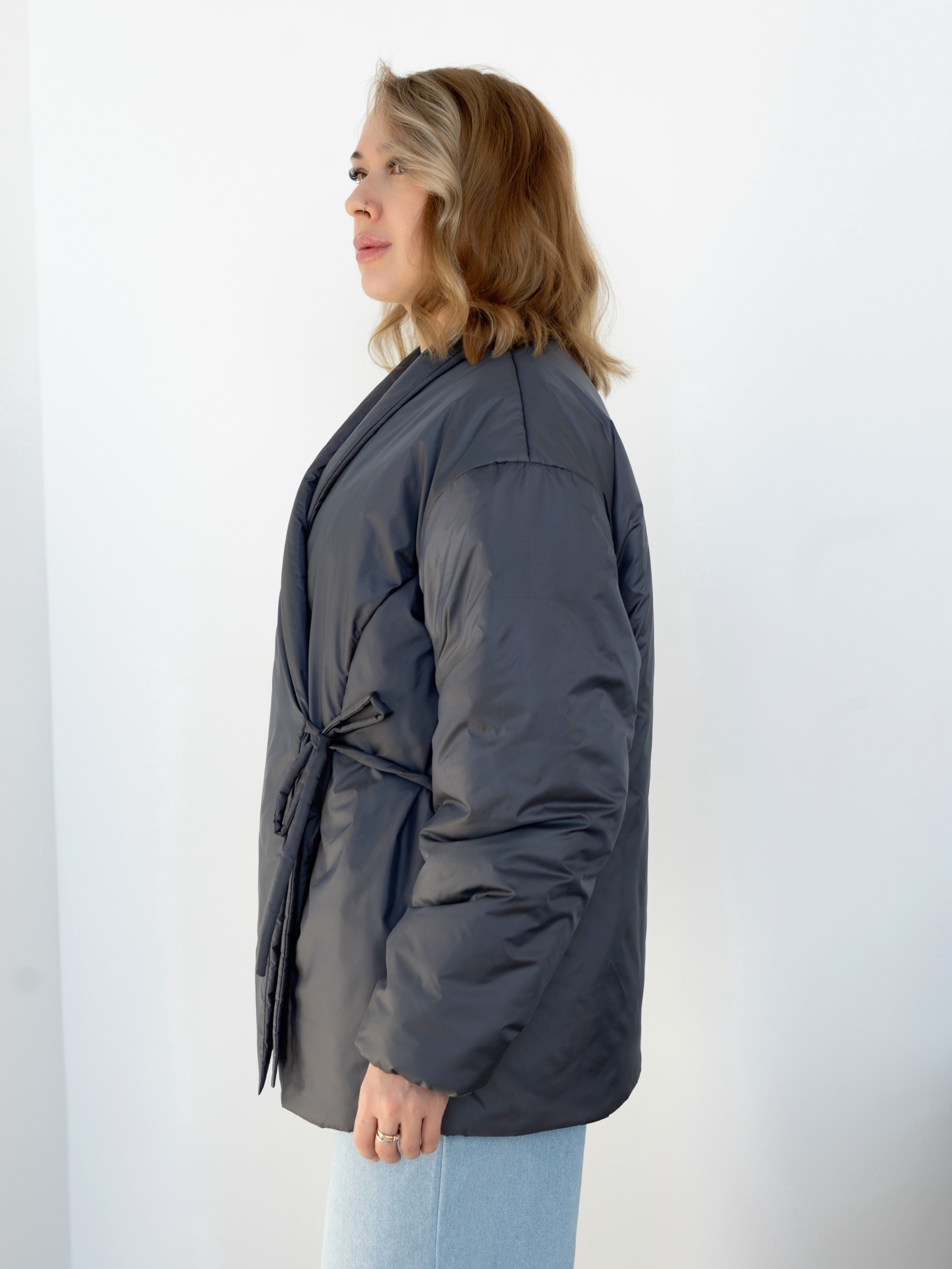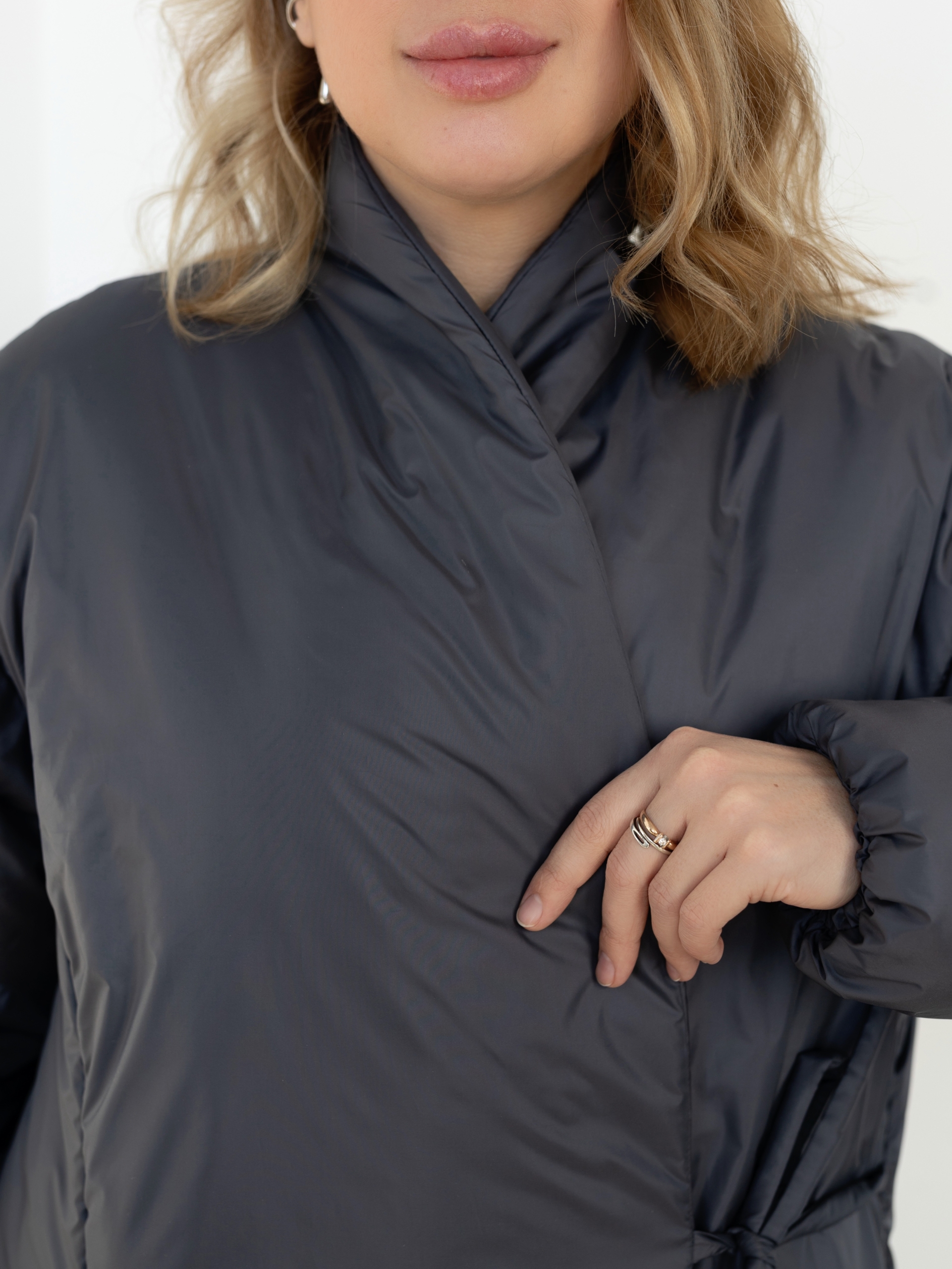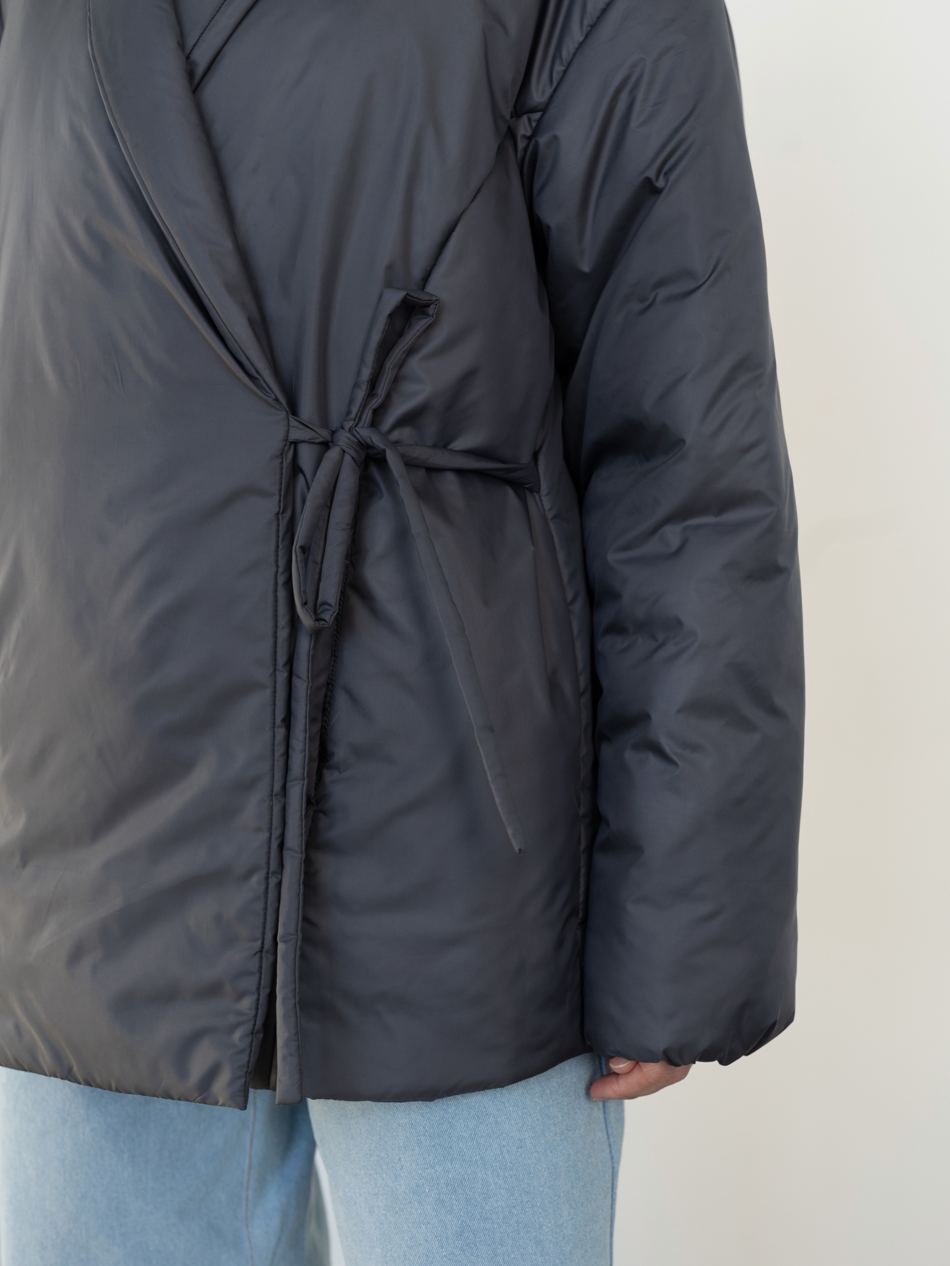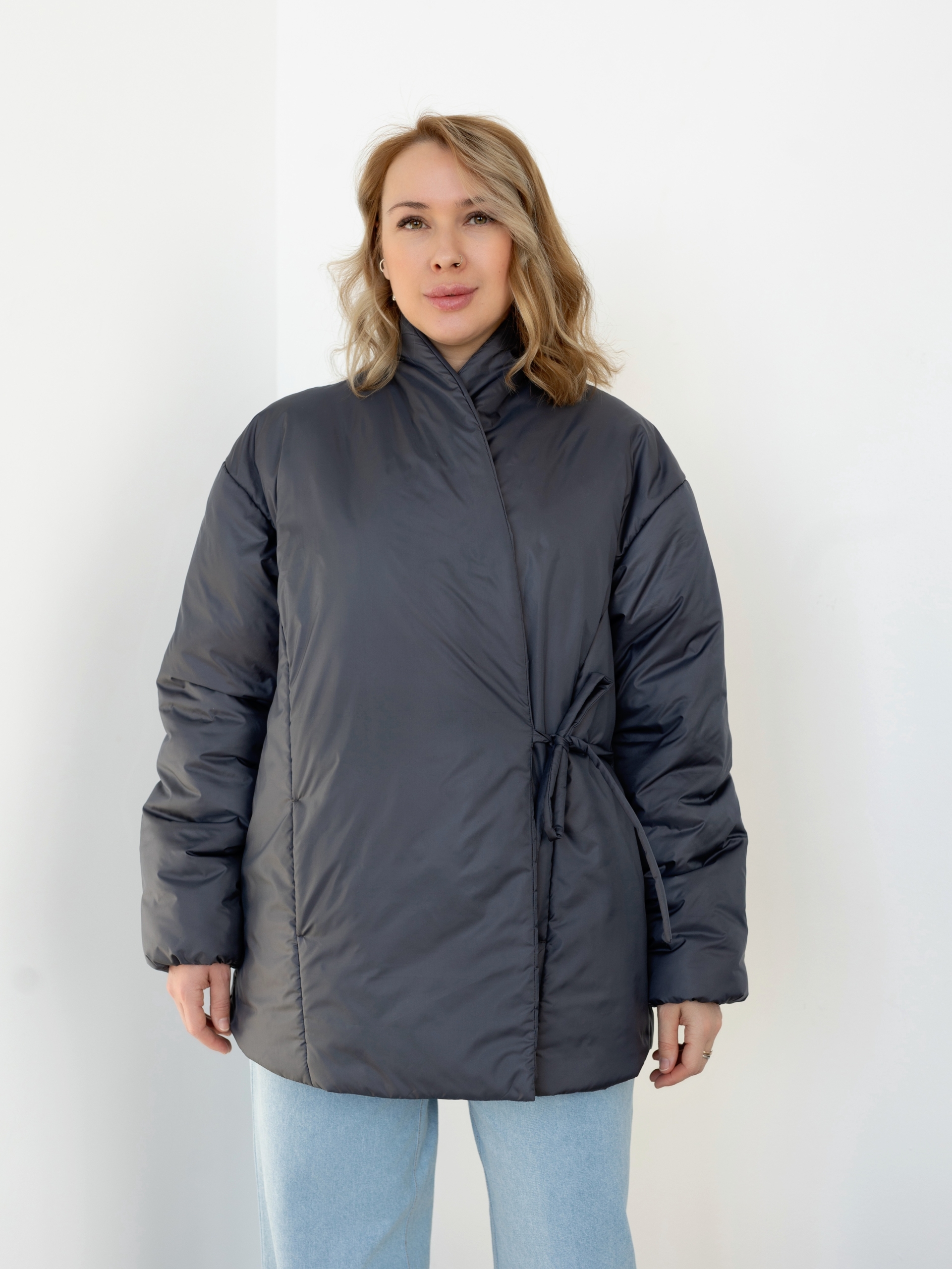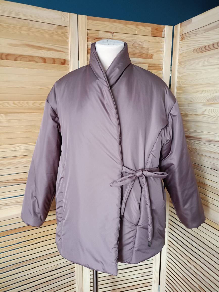 Женская утепленная куртка свободного кроя, прямого силуэта, шалевый воротник, линия плеча спущена, длинный рукав, низ рукава собран на резинку, на полочках нагрудные вытачки переведены в рельефные швы, в рельефных швах полочек карманы, застежка на запах, фиксируется двумя завязками снаружи, пуговицей и петлей внутри, длина куртки ниже линии бедер.