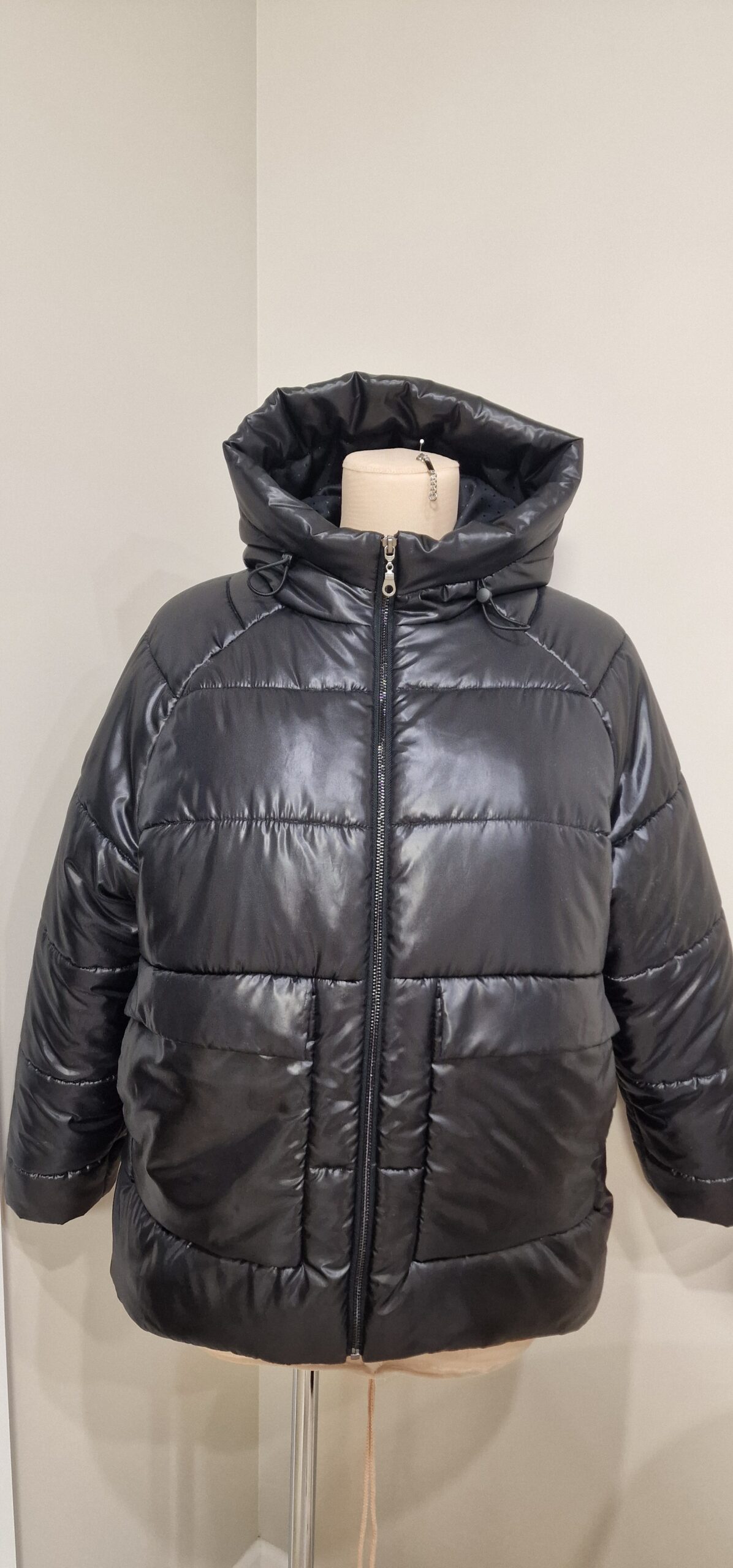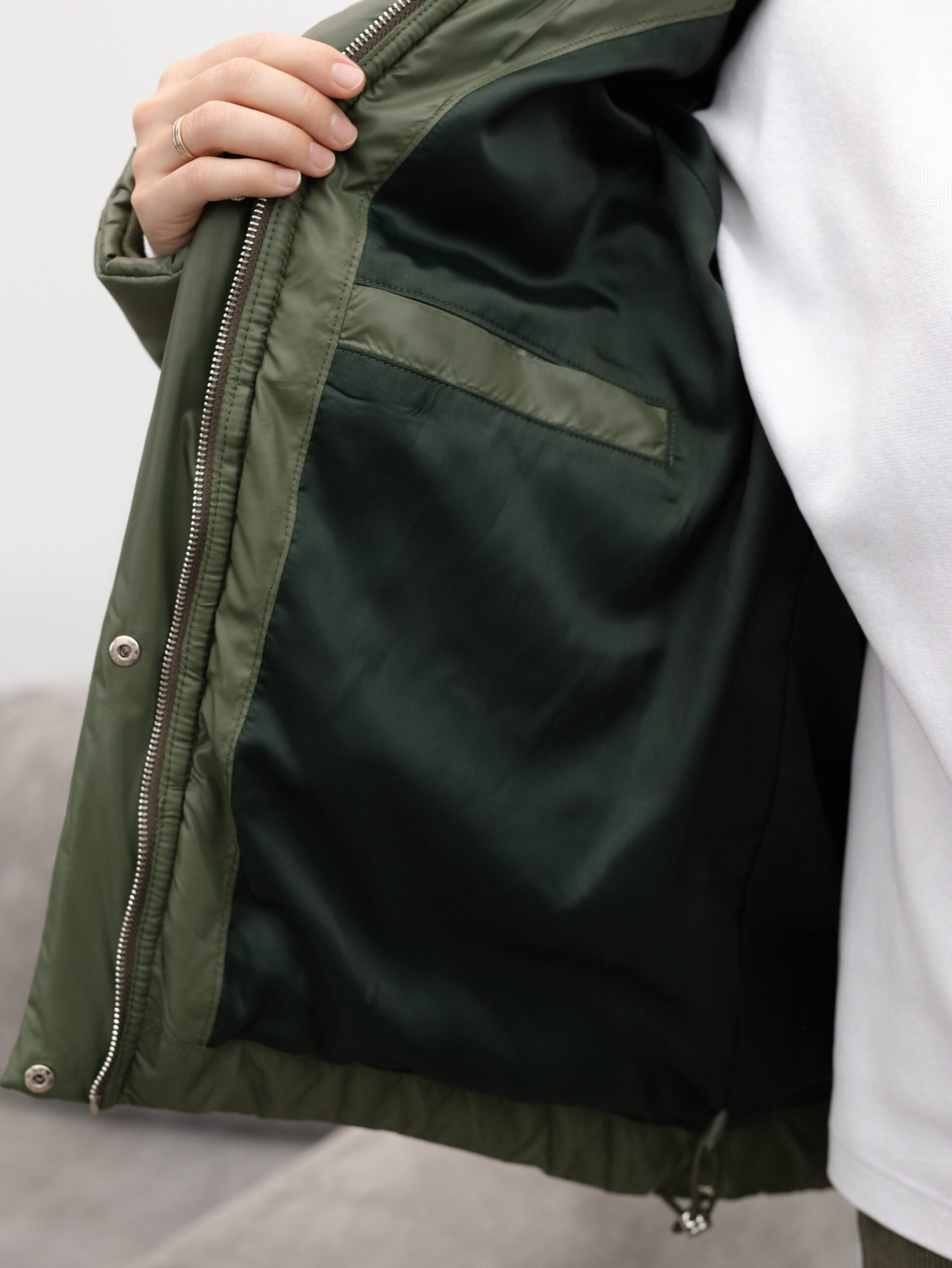 Утепленная женская куртка свободного кроя, прямого силуэта, спинка немного длиннее переда, длинный рукав покроя реглан, по низу рукава внутренняя ветрозащитная манжета из подвяза (кашкорсе), на полочках карманы с клапанами с двумя входами (сверху и сбоку), клапаны со скрытыми кнопками,  на полочках, спинке и рукавах горизонтальная стежка, горловина оформлена двухшовным капюшоном, по краю капюшона притачная обтачка, в шве притачивания обтачки сделаны две петли, через которые продета шляпная резинка с фиксаторами, центральная застежка на разъемную молнию, внешняя ветрозащитная планка со скрытыми кнопками, по низу изделия в районе боковых швов со стороны обтачки низа люверсы, через которые продета шляпная резинка с фиксаторами для утяжки, на подкладке полочки внутренний карман.