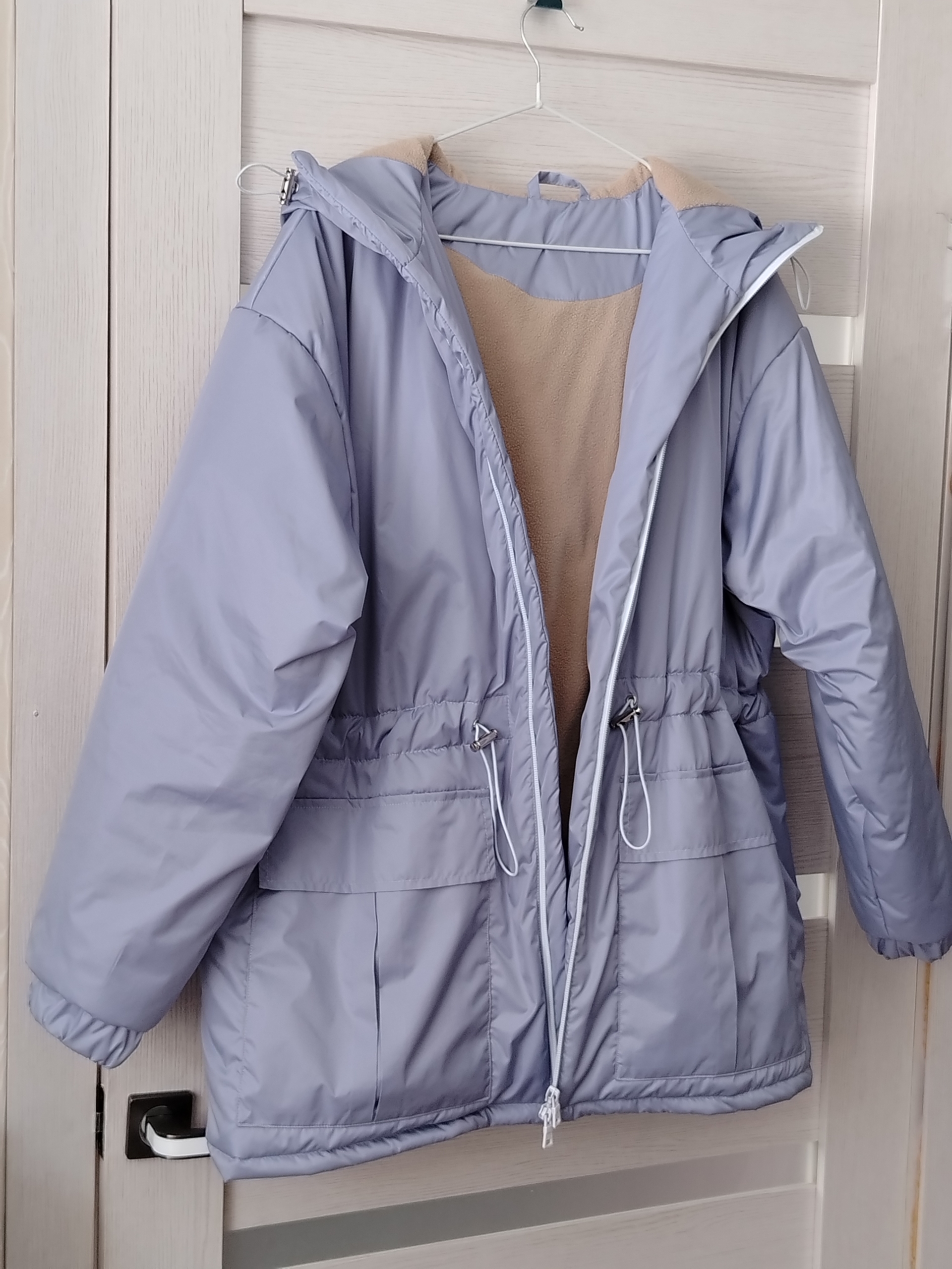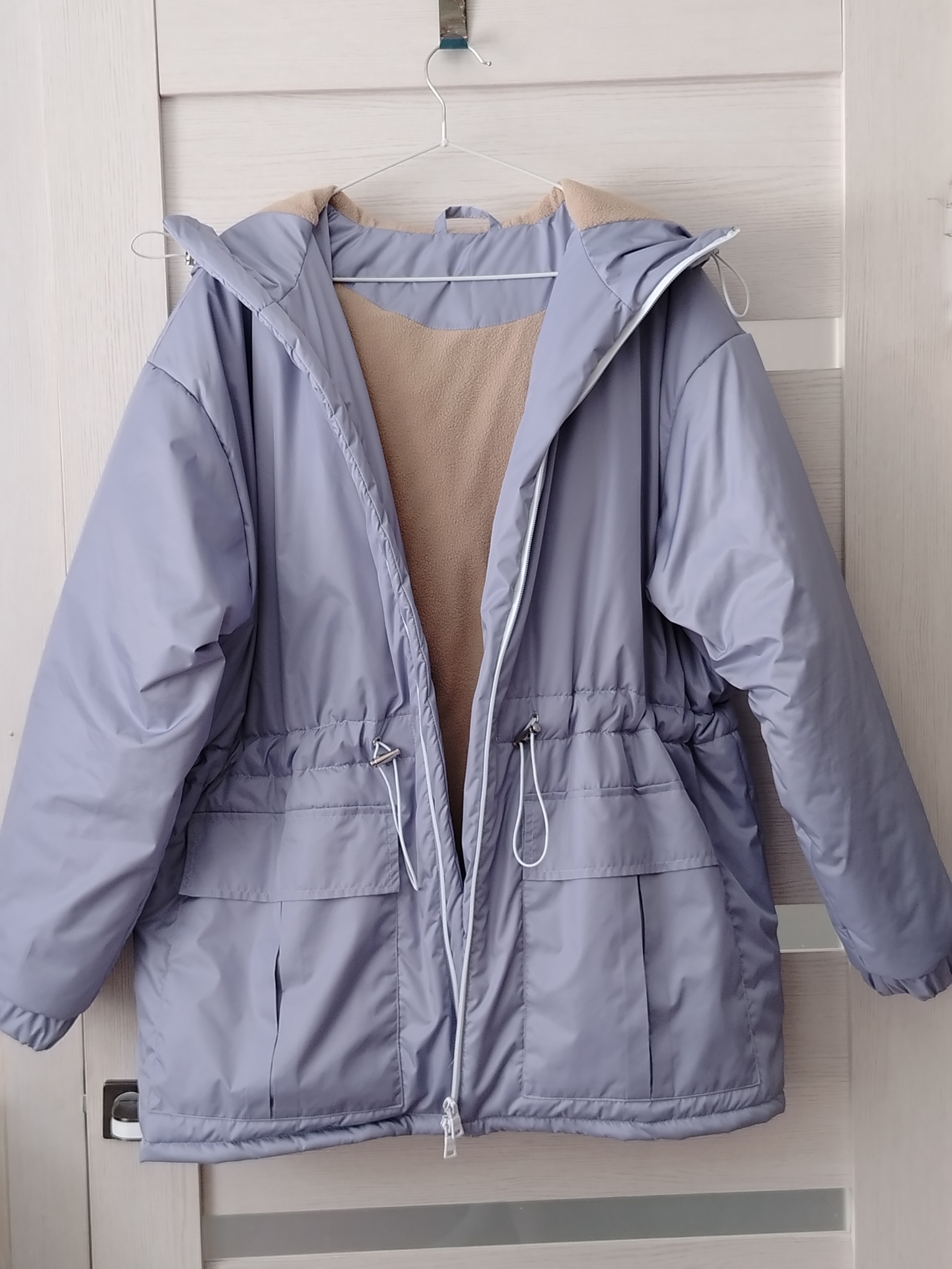 Сшила весеннюю куртку в 58 размере. Использовала Синтепон 100, дюспо и флис на подкладку. Брала свой размер, куртка села не оверсайз, а прям не сильно свободно, но и не туго.