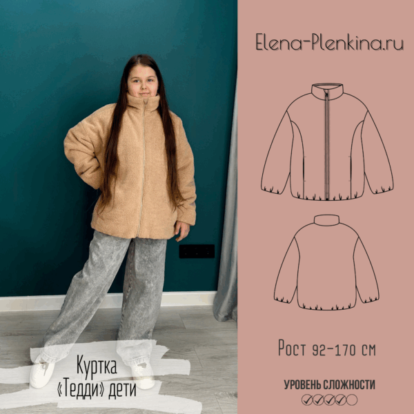Детская куртка свободного кроя, прямого силуэта, линия плеча спущена, длинный рукав, по низу рукава на обтачку настрочена резинка, на полочках вертикальные рельефы, в швах рельфов карманы, горловина оформлена воротником-стойкой, центральная застежка на разъемную молнию, ветрозащитная планка молнии с клапаном, на нижний припуск куртки настрочена резинка, длина куртки ниже линии бедер.