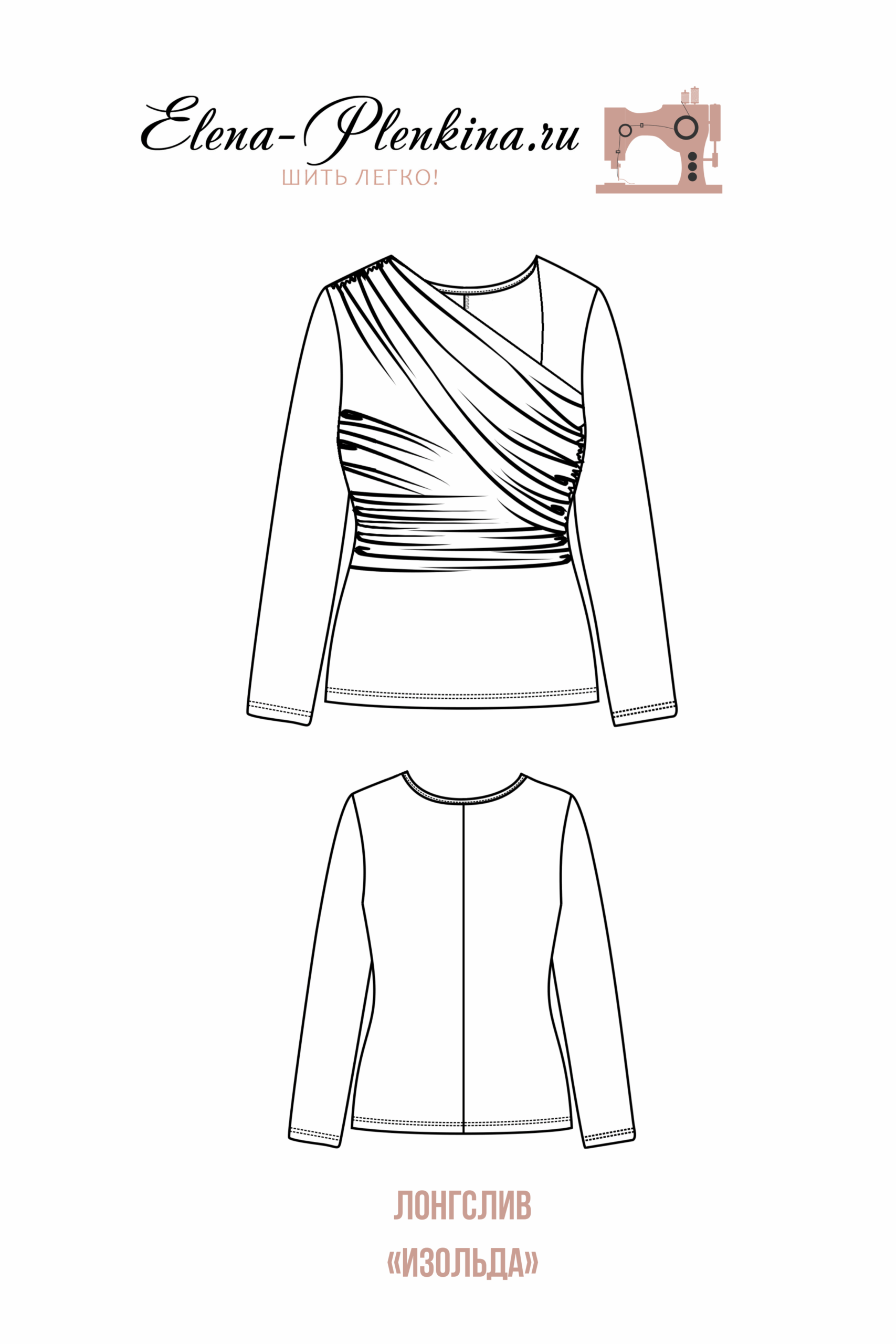 Женский лонгслив малого объема, прилегающего силуэта, вырез горловины переда ассиметричной формы, вырез горловины спинки округлой формы и окантован бейкой из основного трикотажа, перед с драпировкой и на подкладке, спинка со средним швом, длинный рукав.