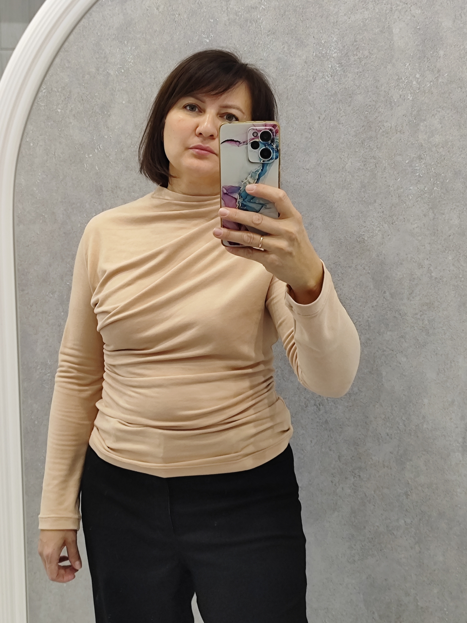 Модель Евгения, лонгслив 42 размера рост 164 см, реальный размер (на момент фотосессии) 42-44 рост 164 см.