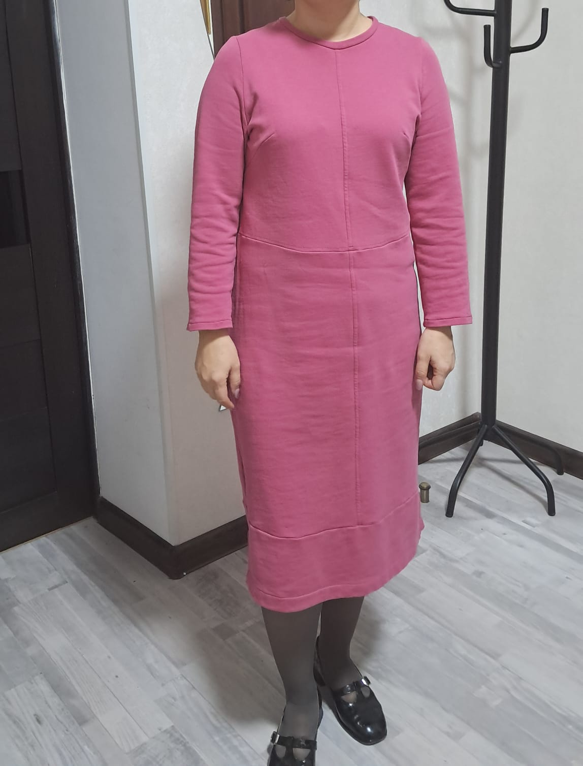 Платье из футера трехнитки. Все отлично, выкройка хорошая, платье легкое в пошиве. Только я допустила ошибку, постирала платье уже после пошива и оно подсело немного.