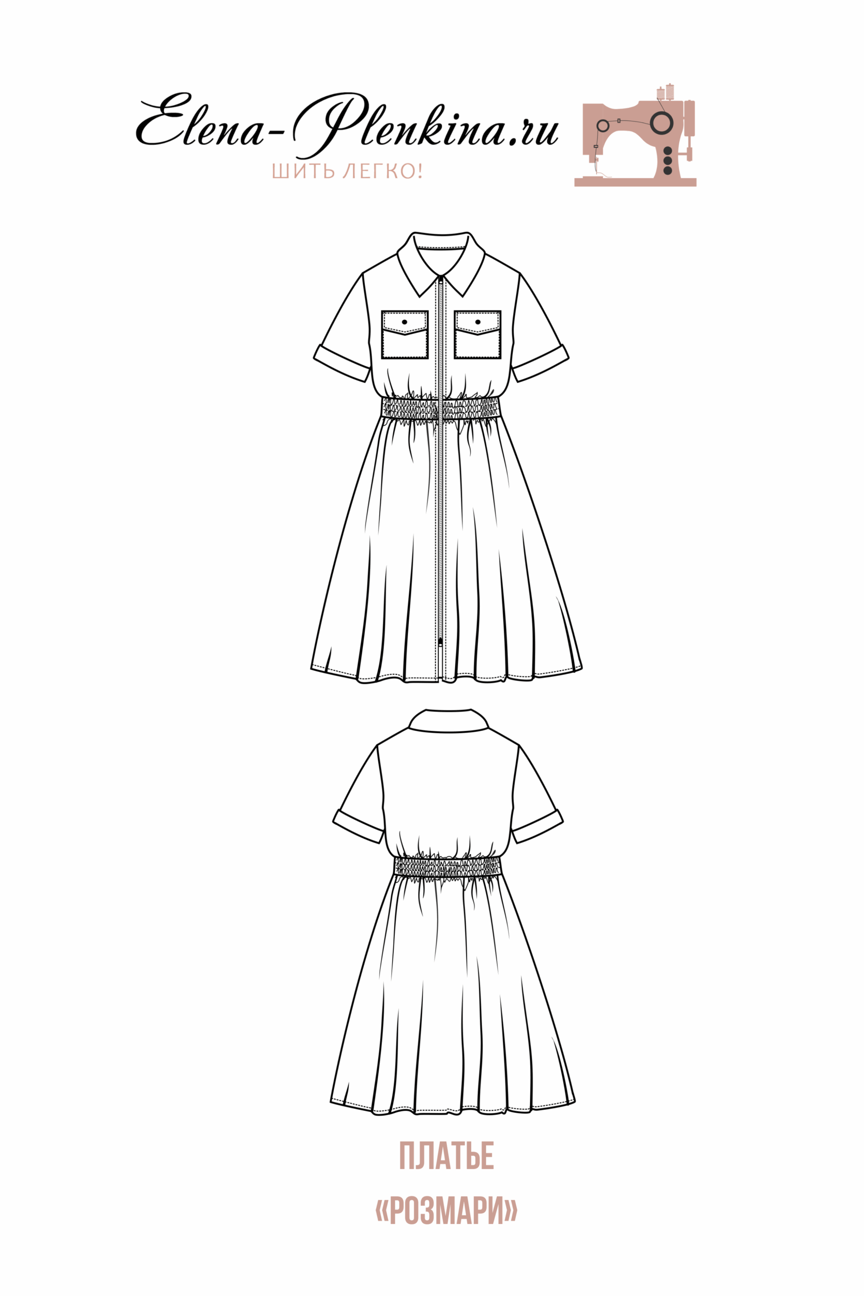 Женское платье среднего объема, отрезное по линии талии, юбка трапецивидного силуэта, на талии отрезной двойной пояс с широкой эластичной тесьмой внутри, на поясе установлены люверсы, через которые продета шляпная резинка с фиксаторами, накладные нагрудные карманы с клапанами, короткий втачной рукав с отворотом по низу рукава, длина изделия до колена.