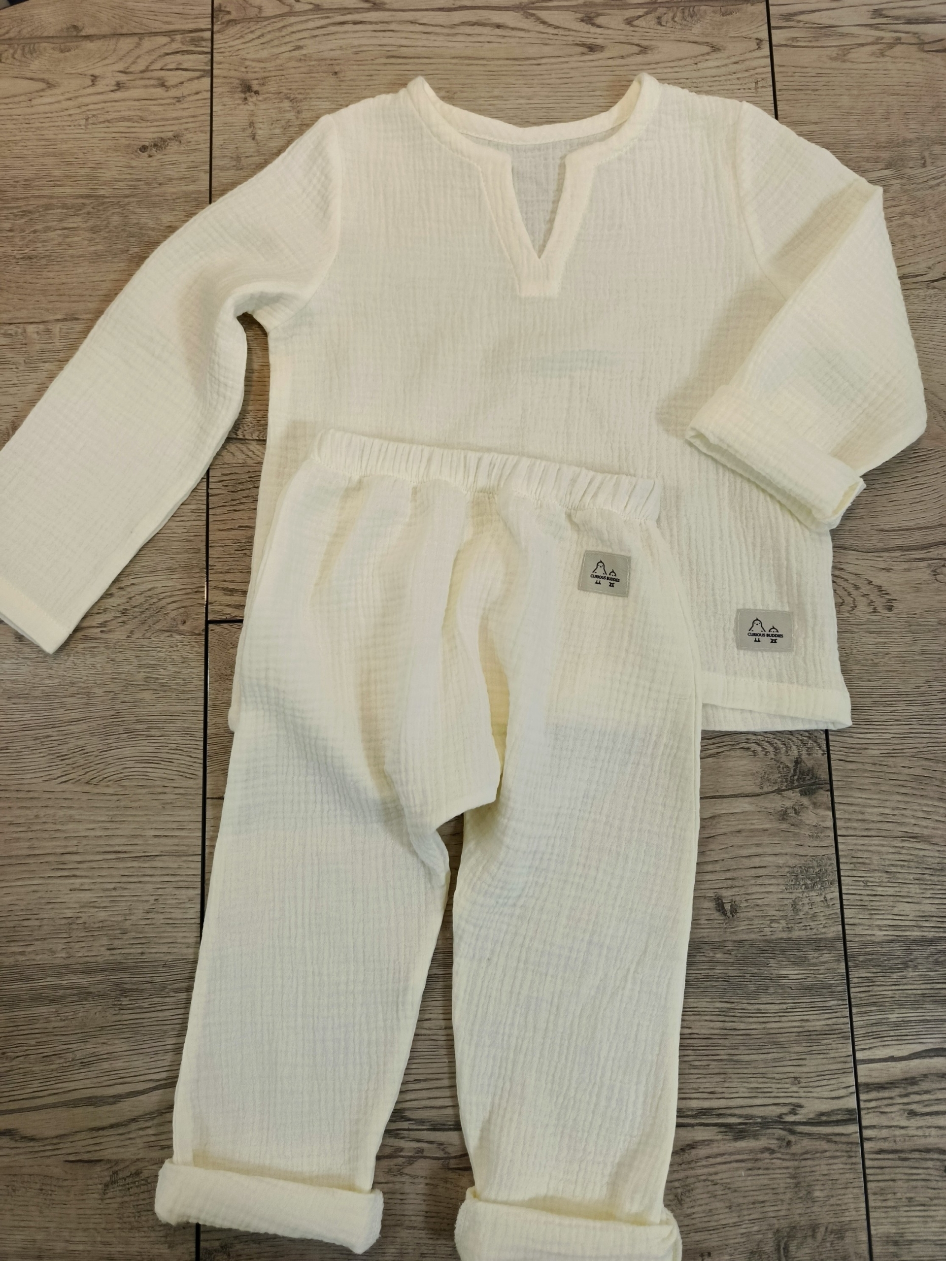 Шила из муслина, на заказ. Взяла на рост побольше, знаю, что псосле стирки ткань даст усадку.