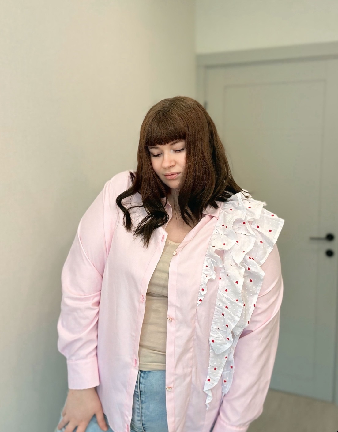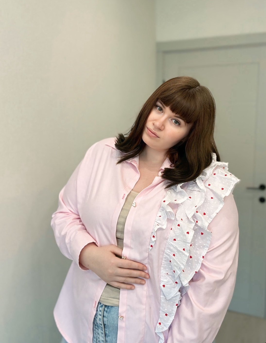 Модель Елена, рубашка 44 размера рост 170 см, реальный размер (на момент фотосессии) 44 рост 167 см. Параметры тела: ОГ 87 см, ОТ 72 см, ОБ 95 см. Размер выбран по обхвату груди. Рубашка сшита из джинсовой ткани, рюши и клапан кармана из рубашечного поплина.