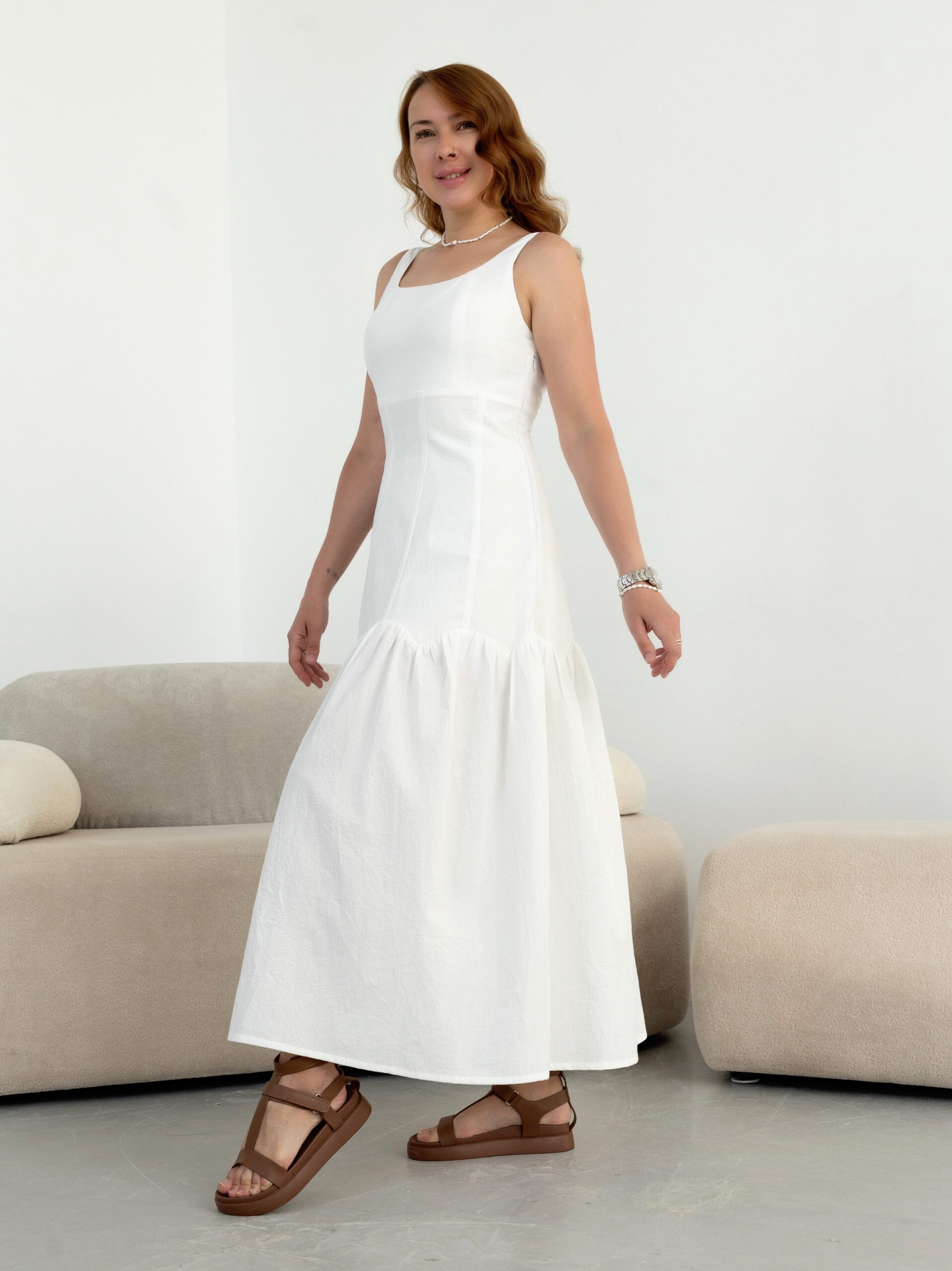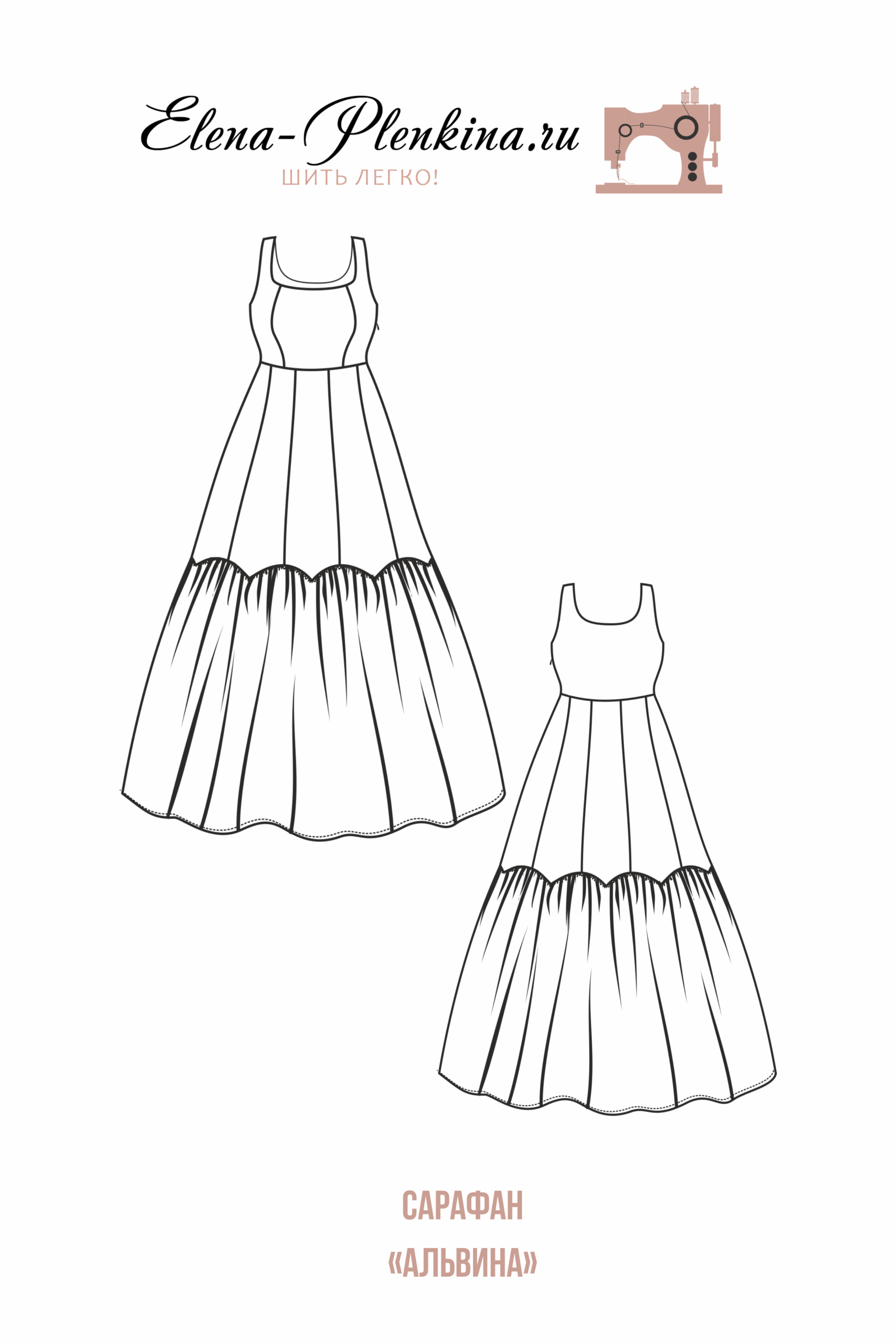 Женский сарафан с лифом малого объема, прилегающего силуэта, нагрудные вытачки по переду лифа переведены в рельефы, отрезной по линии талии, линия талии завышена, верхняя часть юбки с вертикальными рельефами и расширенная к низу, нижняя часть юбки на сборке, вырез горловины переда и спинки глубокий формы «каре», застежка на потайную молнию в боковом шве, сарафан на подкладке, длина сарафана макси.