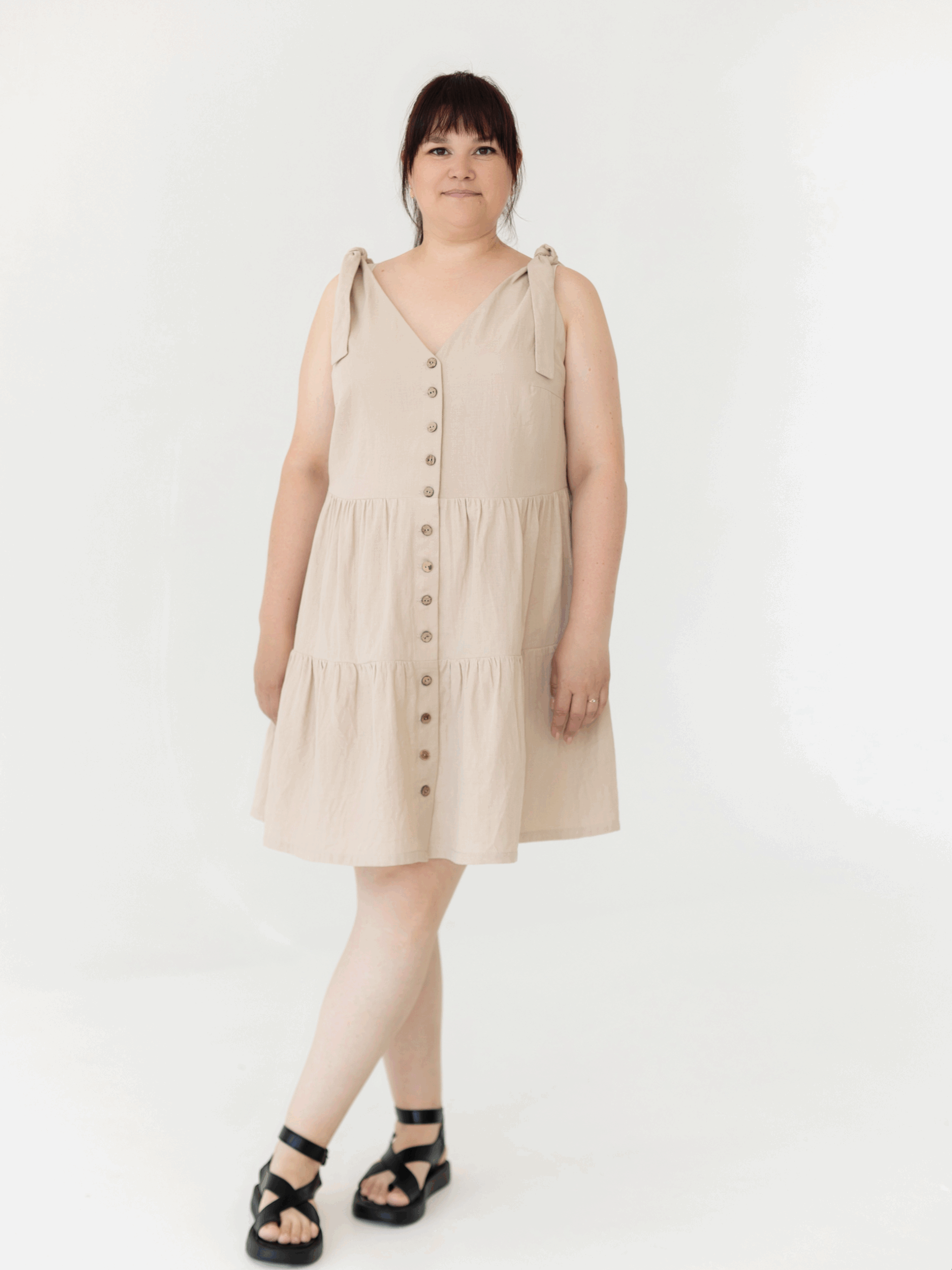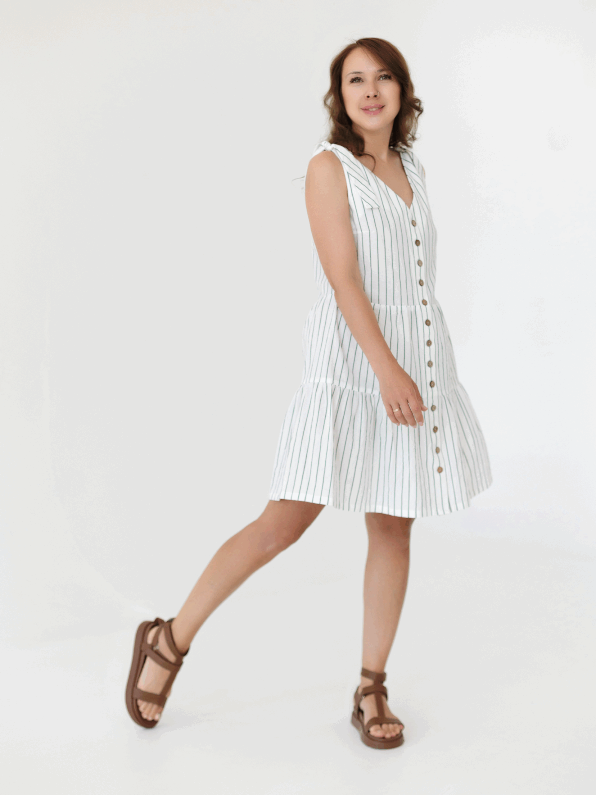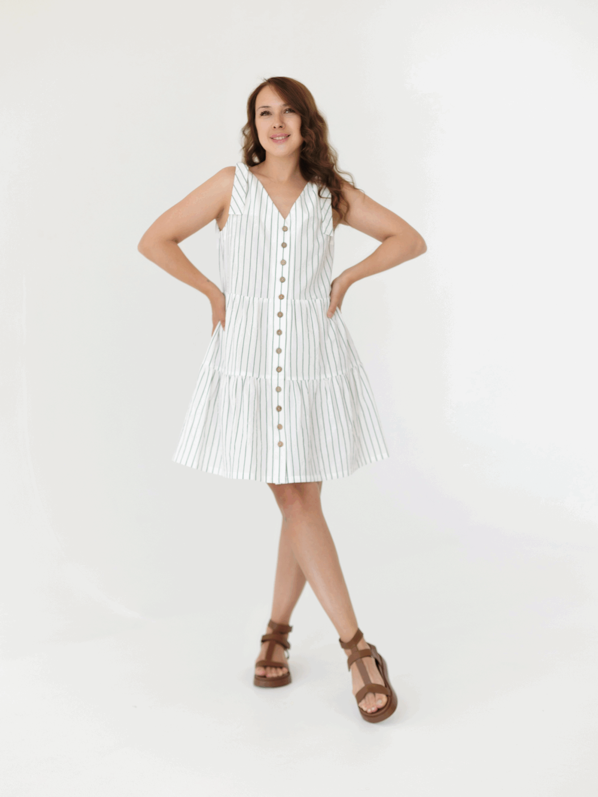 Как только увидела этот сарафан, тут же купила. Прям «моё». Шить легко, ничего не меняла, только количество пуговиц. На объем груди 100 взяла 48 размер, не прогадала. Рекомендую к пошиву