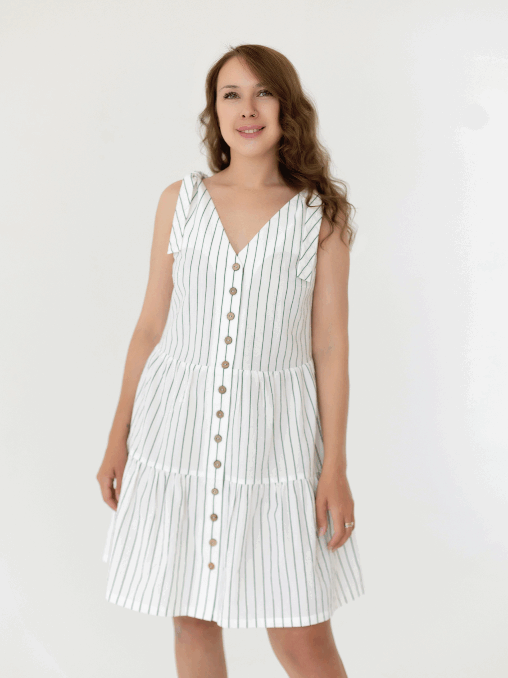 Женский сарафан среднего объема, с лифом полуприлегающего силуэта, отрезной по линии талии, на полочках нагрудные вытачки, переведенные в боковые швы, горловина переда и спинки V-образной формы, широкие бретели, переходящие в завязки на плечах, на полочках центральная застежка на пробивные петли и пришивные пуговицы, юбка состоит из двух ярусов на сборке, длина сарафана выше колена.