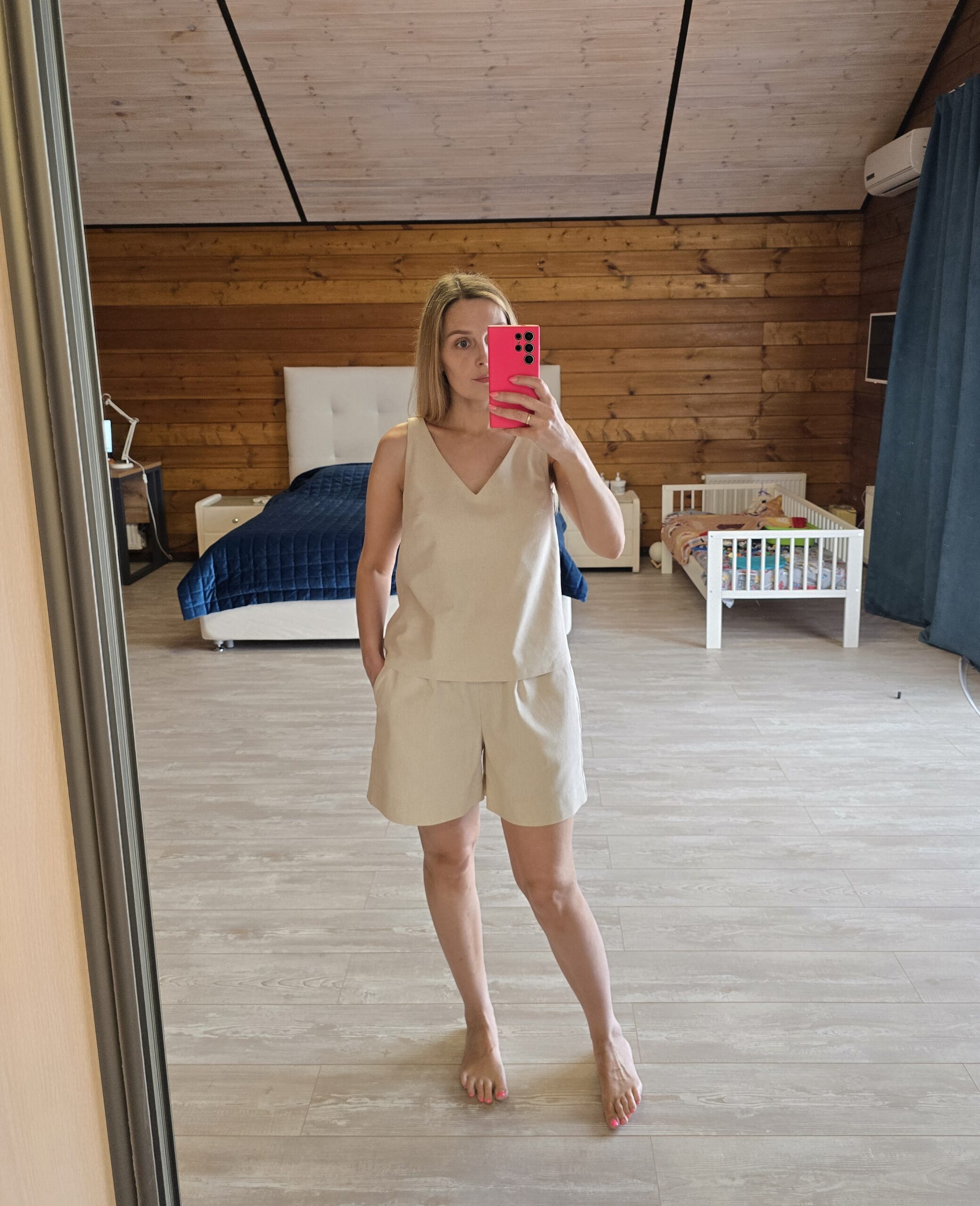 Не смогла найти полностью устаивающий костюм шорты и рубашка, но нашла отличные выкройки! Сшила из ткани лён-хлопок-вискоза. Идеально Очень комфортная модель. Идеальная длина ( на мой рост 160 ничего не меняла)