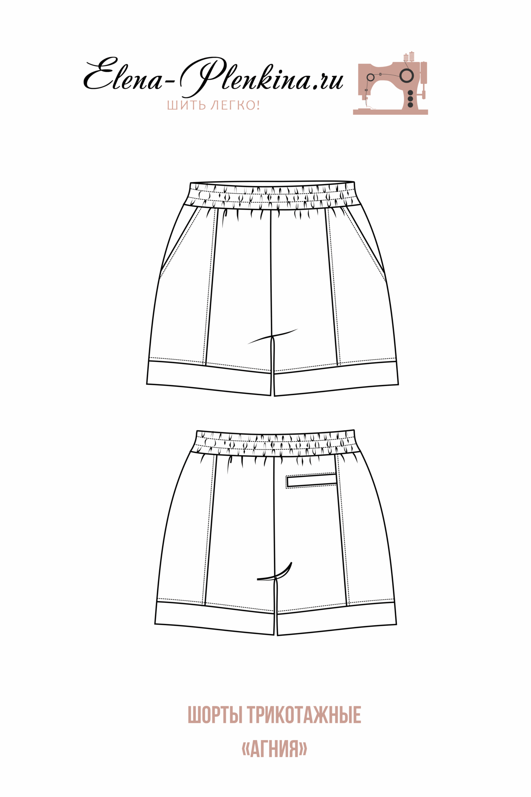 Женские трикотажные шорты среднего объема, на передних половинках вертикальные подрезы и карманы с отрезным бочком, на задних половинках вертикальные подрезы и один карман с листочкой, верх шорт оформлен двойным притачным поясом из основного трикотажа с широкой резинкой внутри, пояс с резинкой отстрочены двумя параллельными строчками, по низу шорт двойные притачные манжеты из основного трикотажа.