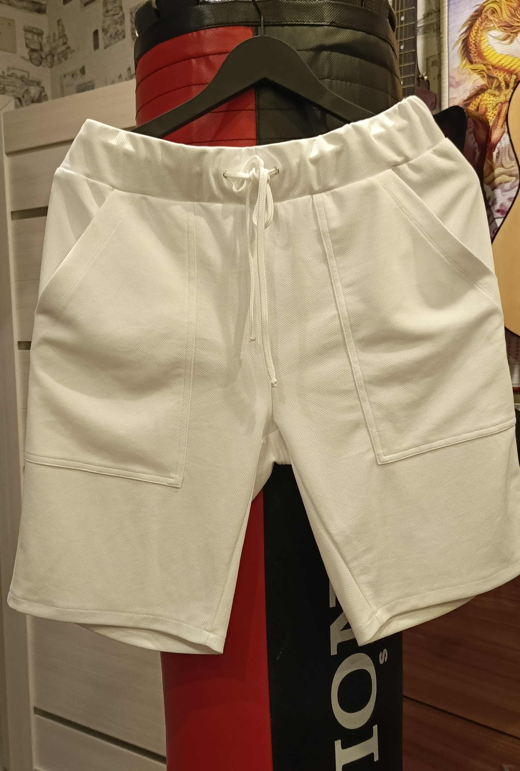 Мужские трикотажные шорты среднего объема, средняя посадка, верх шорт оформлен притачным поясом из кашкорсе/рибаны с лайкрой, в пояс вставлен шнур, для которого в поясе установлены люверсы, на передней части накладные карманы, низ шорт в подгибку и отстрочку на распошивальной машине.
