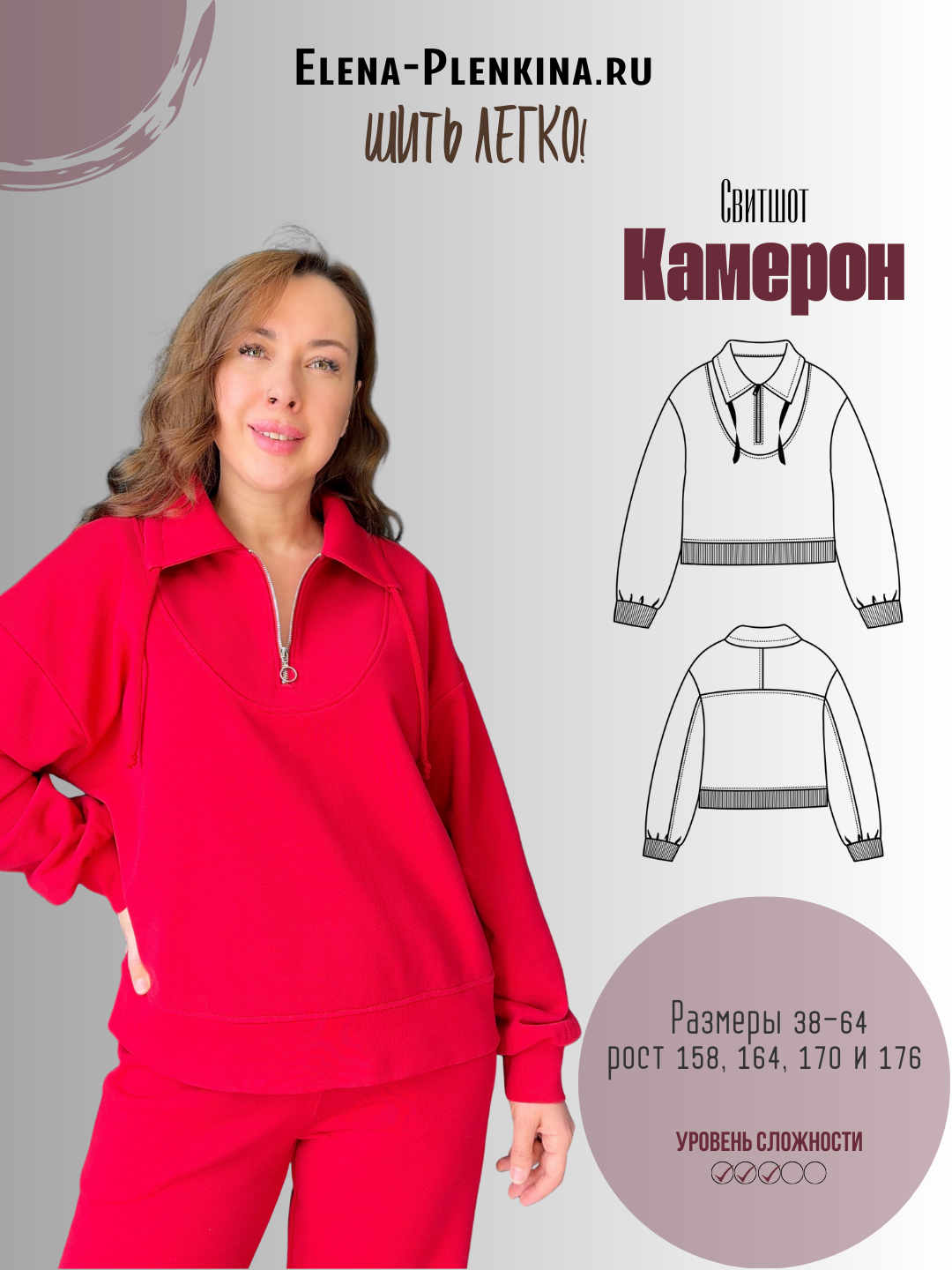Выкройка представлена в размерах 38-64 на рост 158, 164, 170 и 176 см.