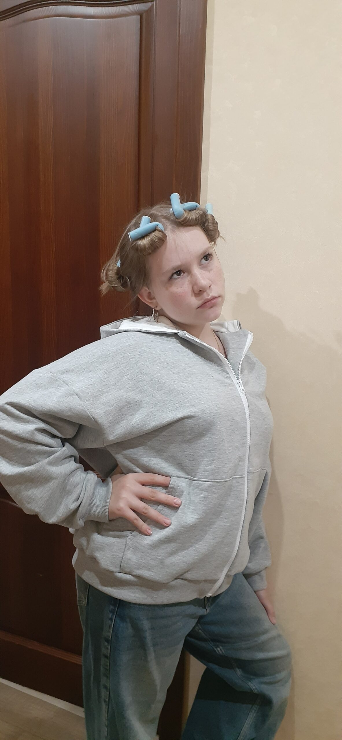 Модель Таисия, толстовка на рост 146-76, реальный рост на момент фотосессии 146 см, обхват груди 78 см, обхват талии 73 см, обхват бедер 81 см. Сшита из футера трехнитки петля, плотность – 340 гр. Также на Таисии брюки по выкройке “Полина”.