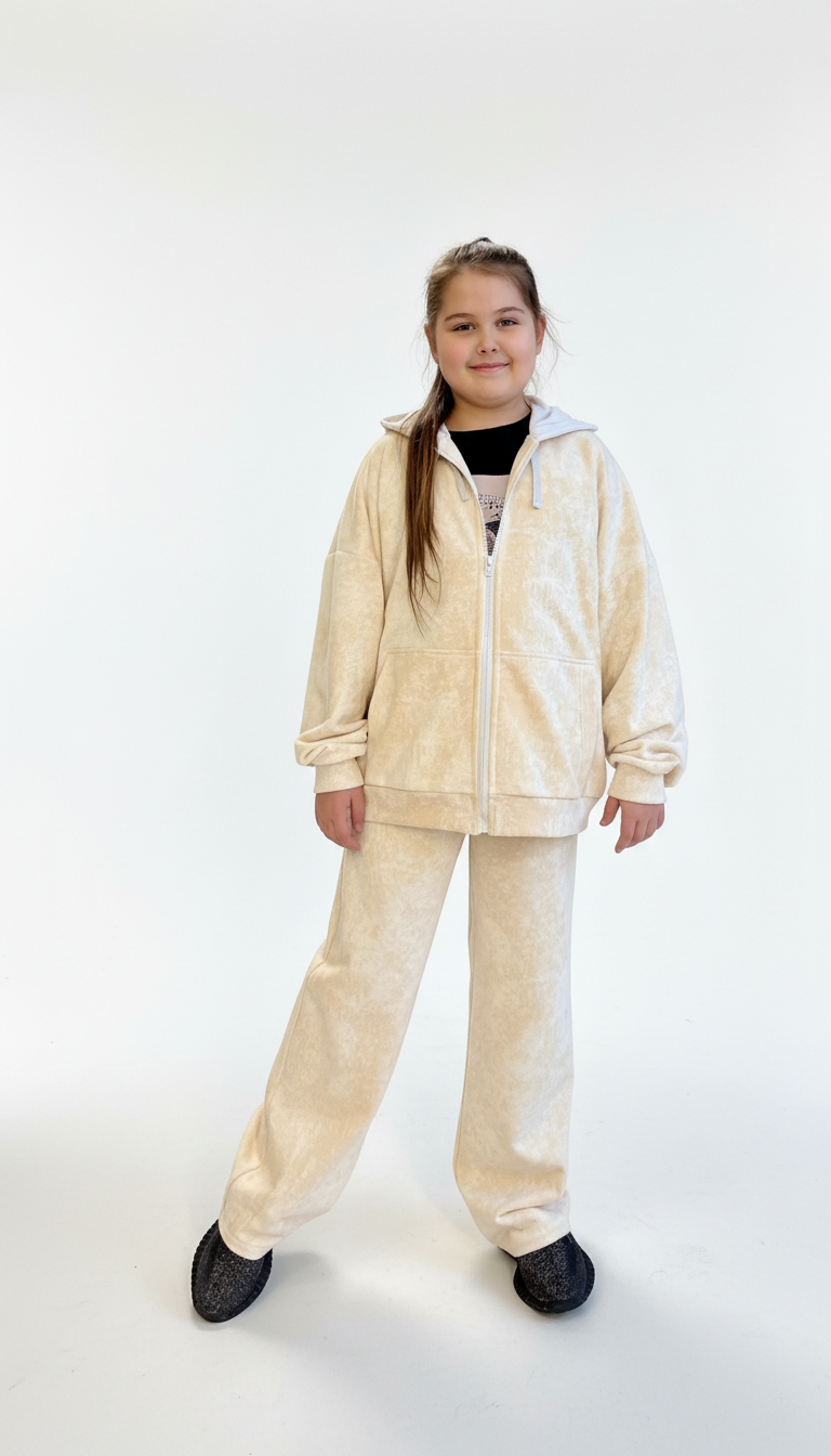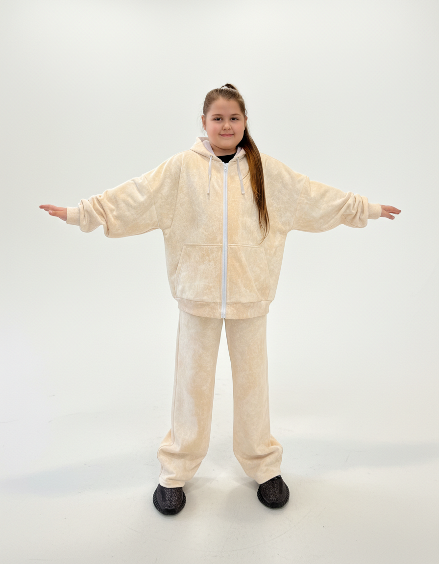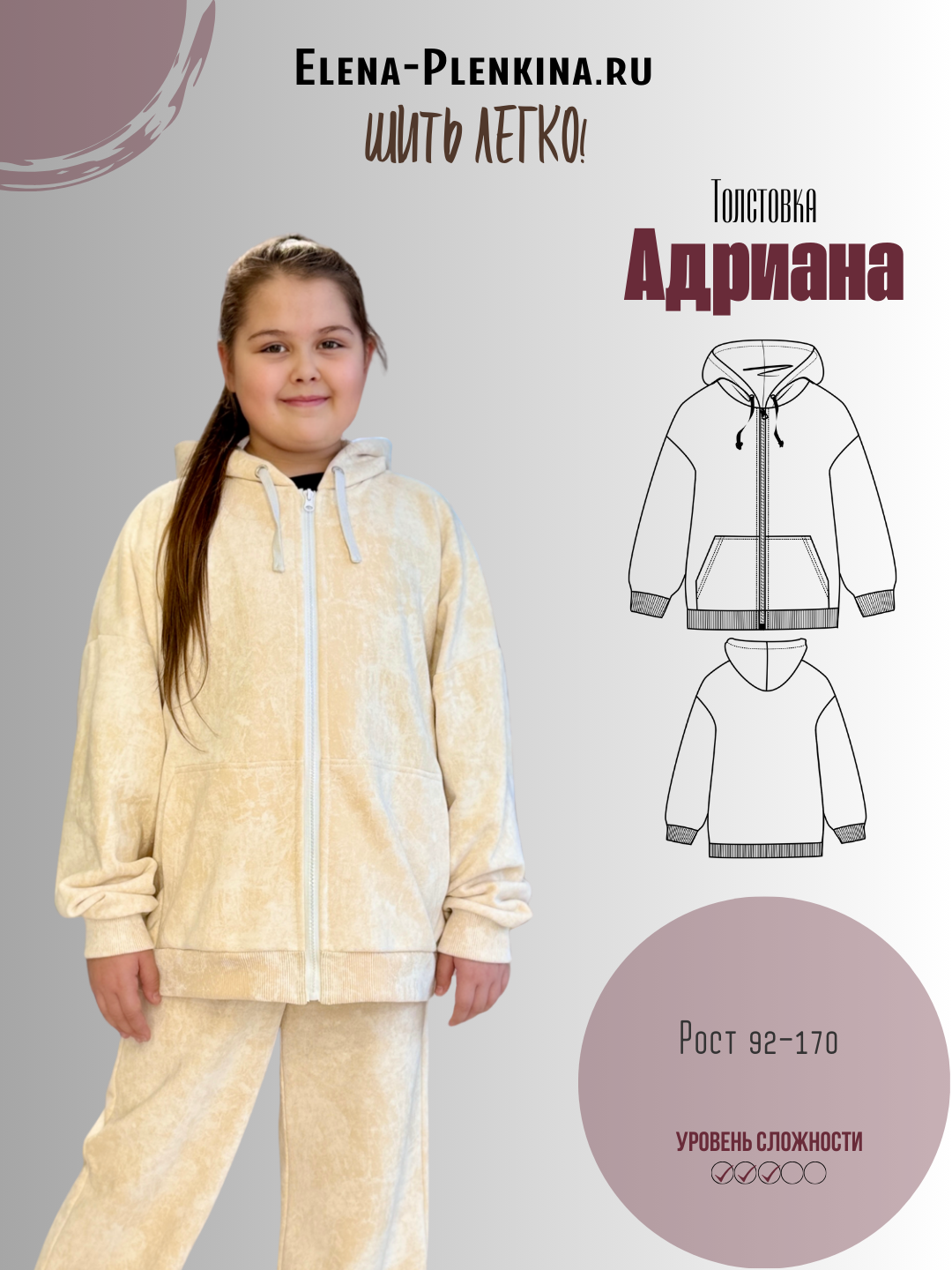 Модель Таисия, толстовка на рост 146-76, реальный рост на момент фотосессии 146 см, обхват груди 78 см, обхват талии 73 см, обхват бедер 81 см. Сшита из футера трехнитки петля, плотность – 340 гр. Также на Таисии брюки по выкройке «Полина».