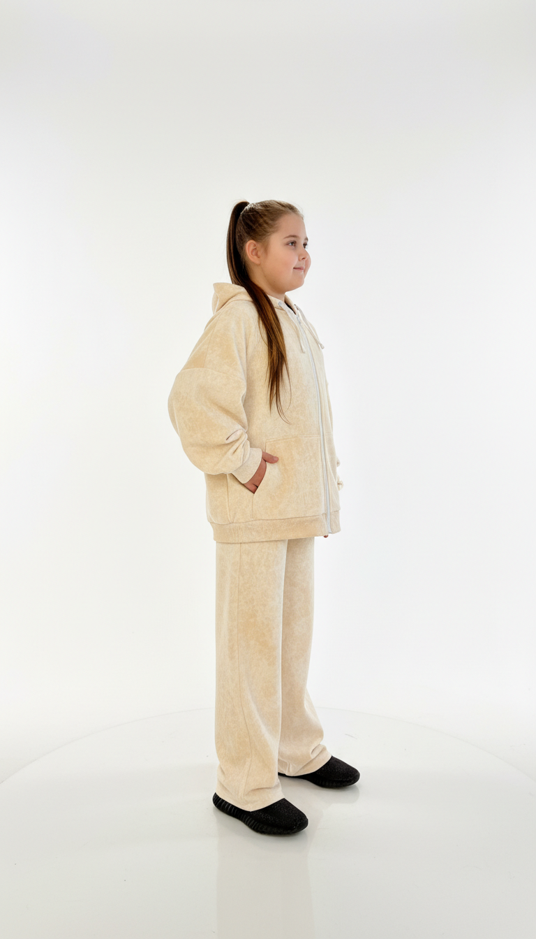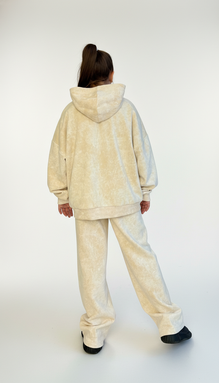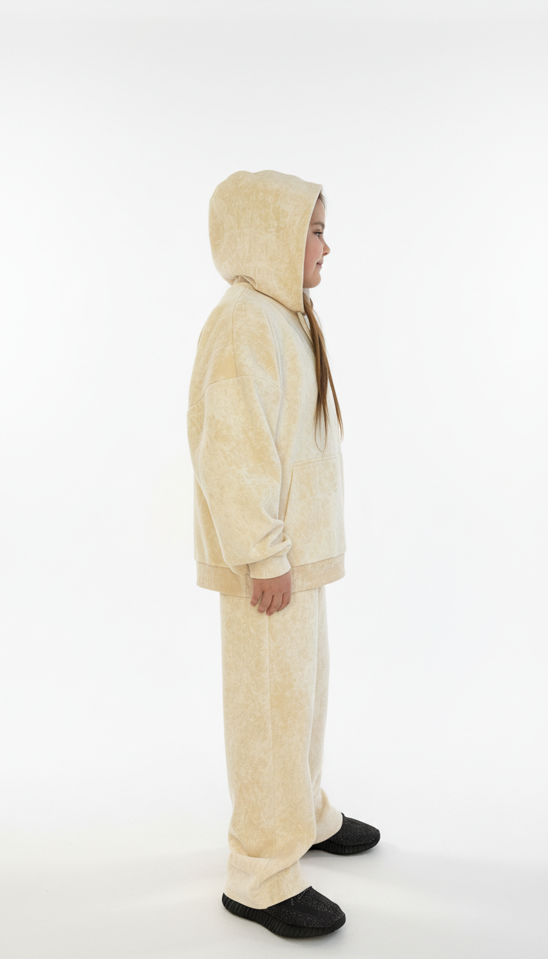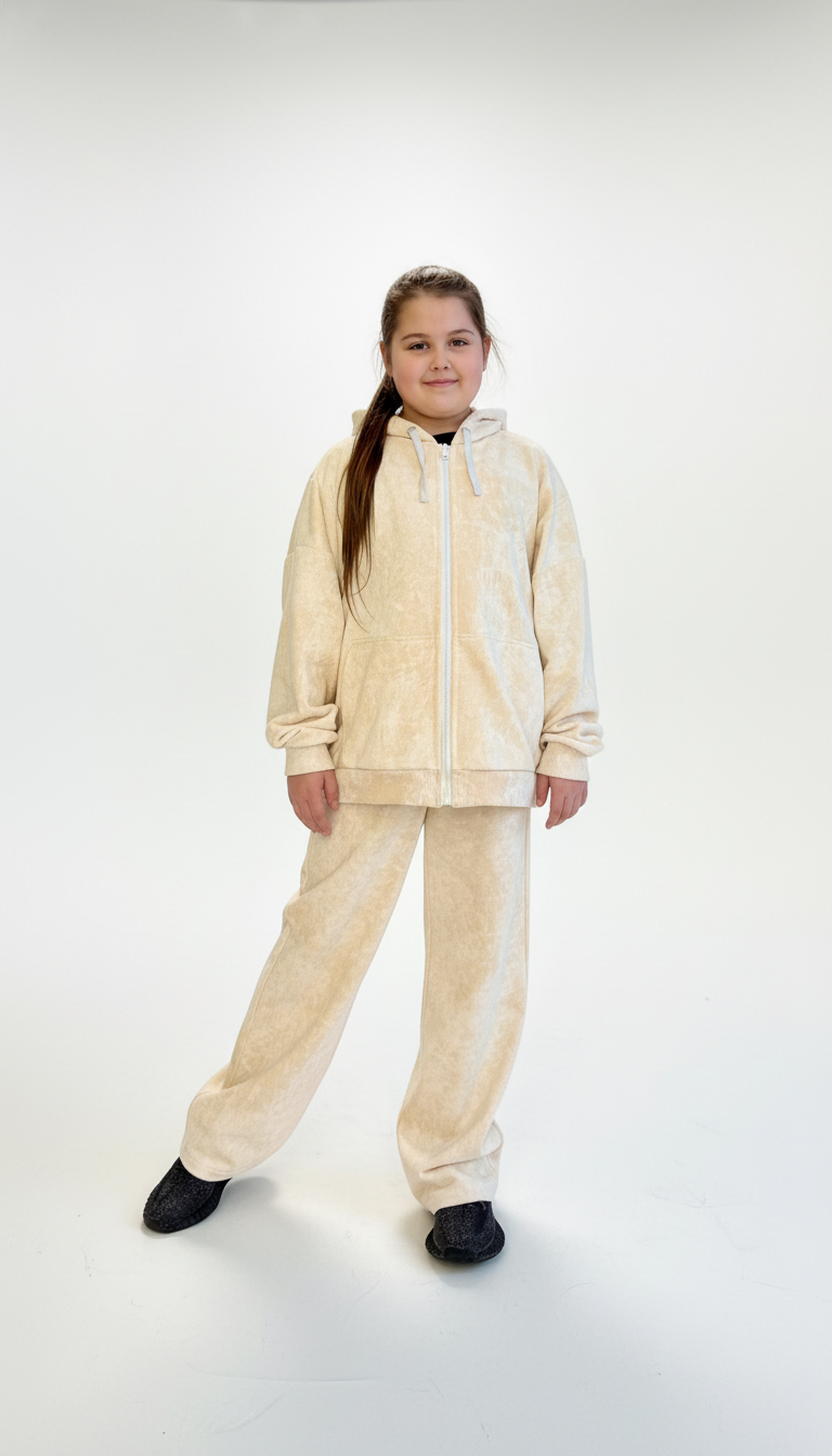 Модель Таисия, толстовка на рост 146-76, реальный рост на момент фотосессии 146 см, обхват груди 78 см, обхват талии 73 см, обхват бедер 81 см. Сшита из футера трехнитки петля, плотность – 340 гр. Также на Таисии брюки по выкройке «Полина».