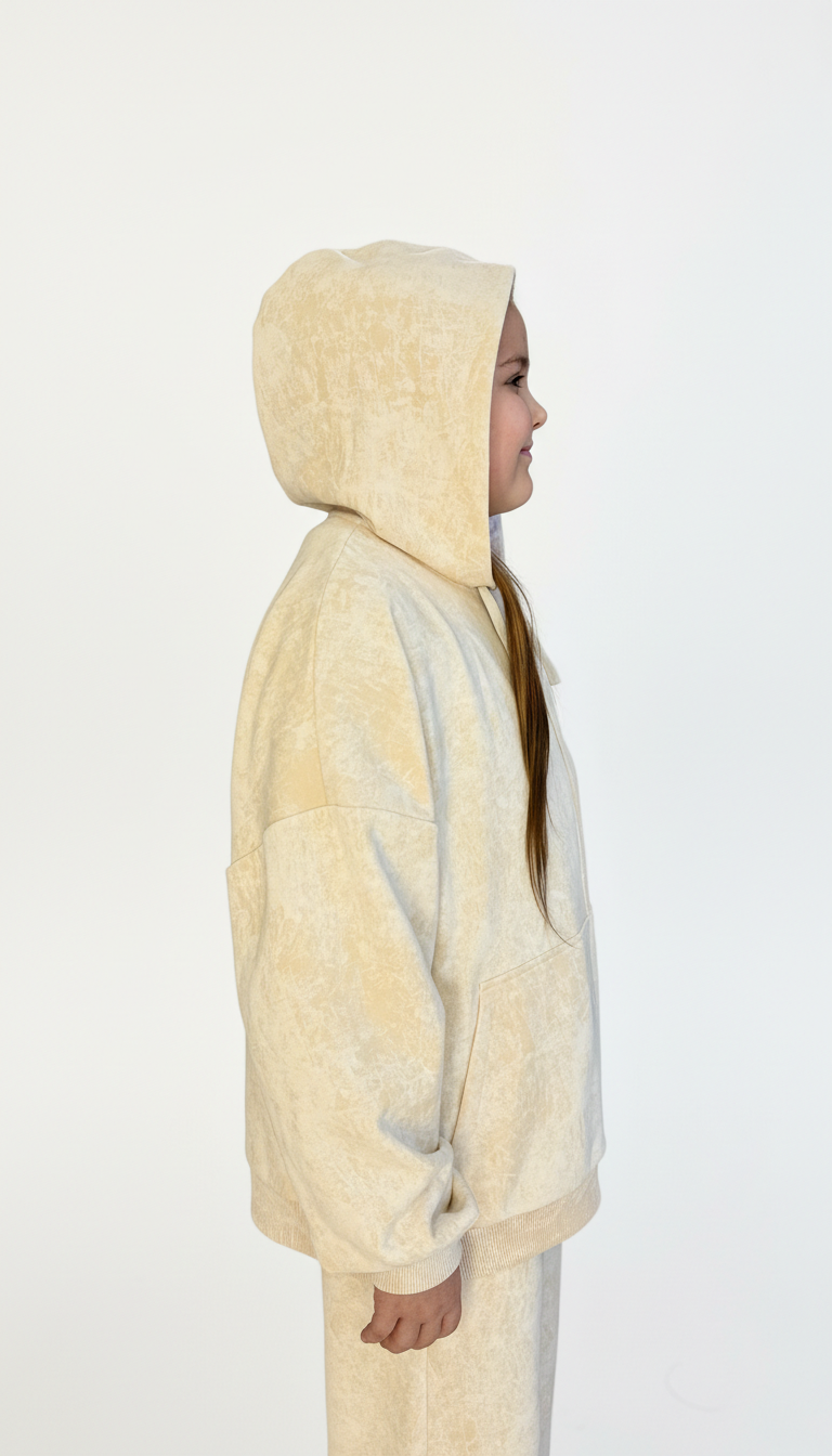 Детская толстовка свободного кроя, прямого силуэта, линия плеча спущена, длинный рукав, низ рукава оформлен двойной притачной манжетой, центральная застежка на разъемную молнию, на полочках накладные карманы, низ изделия оформлен двойной притачной обтачкой, горловина округлой формы и оформлена одношовным двойным капюшоном, по караю капюшона кулиска с люверсами, через которые продет шнур, длина изделия ниже линии бедер.