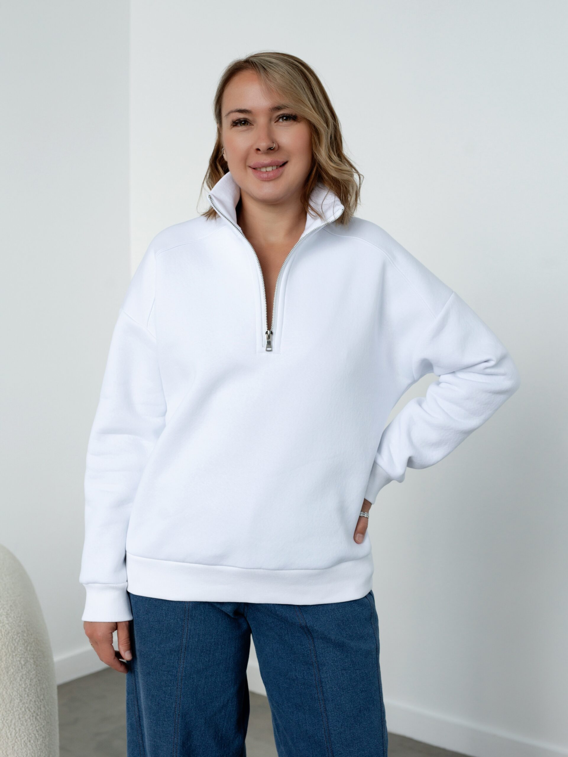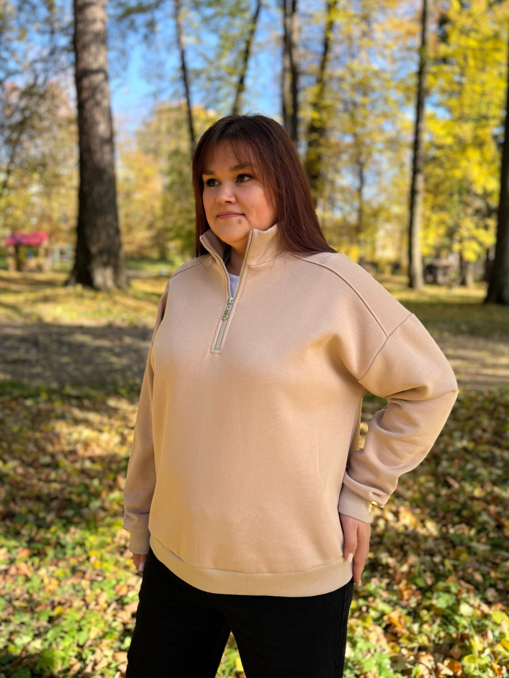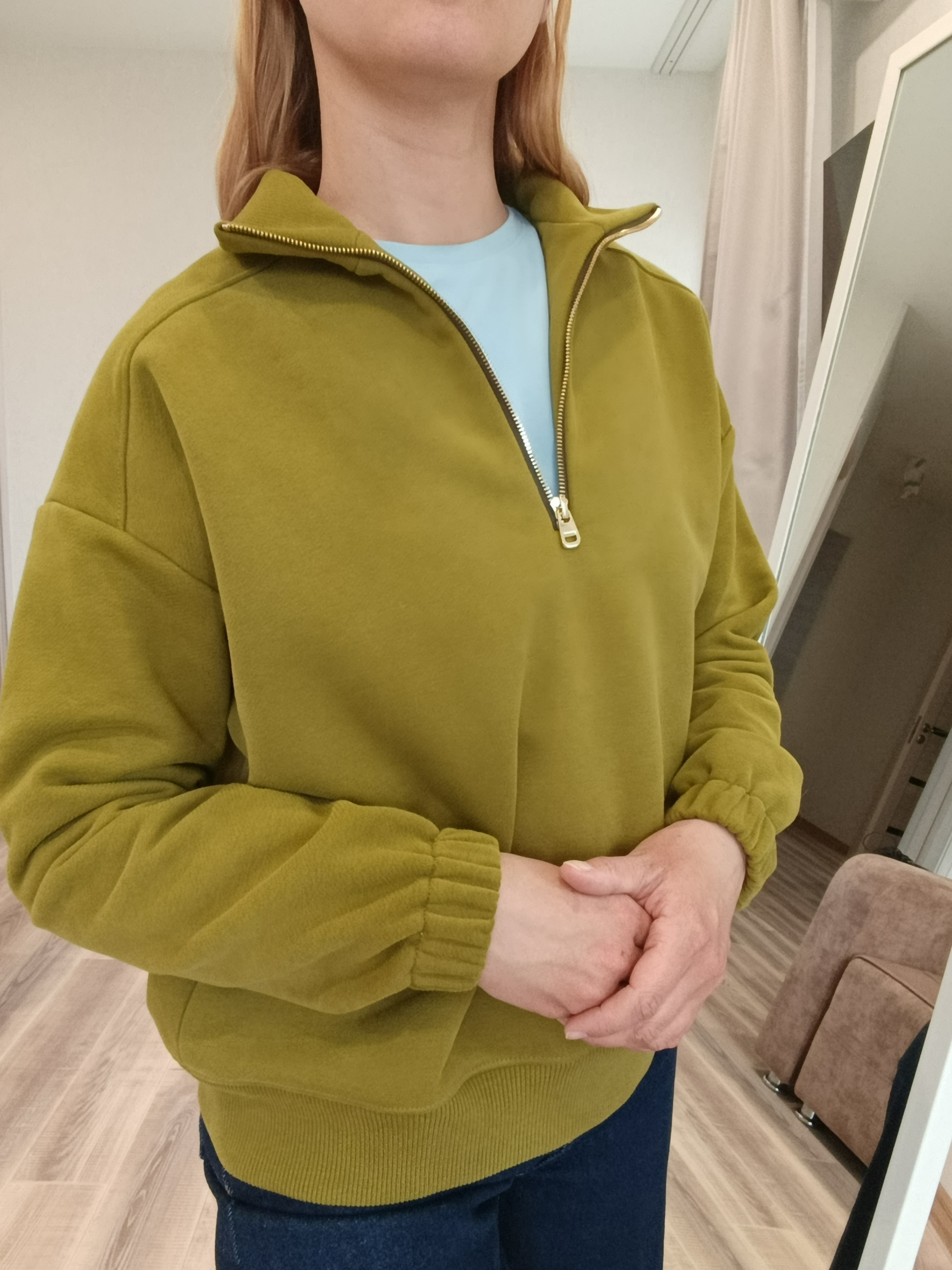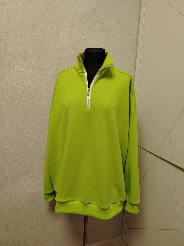 Женская толстовка свободного кроя, прямого силуэта, линия плеча спущена, длинный рукав, по низу рукава манжета из кашкорсе/рибаны с лайкрой, по спинке кокетка, переходящая на сторону переда, горловина округлой формы и оформлена воротником стойкой из основного трикотажа, по центру переда застежка на короткую не разъемную молнию, низ изделия оформлен манжетой из кашкорсе/рибаны с лайкрой.