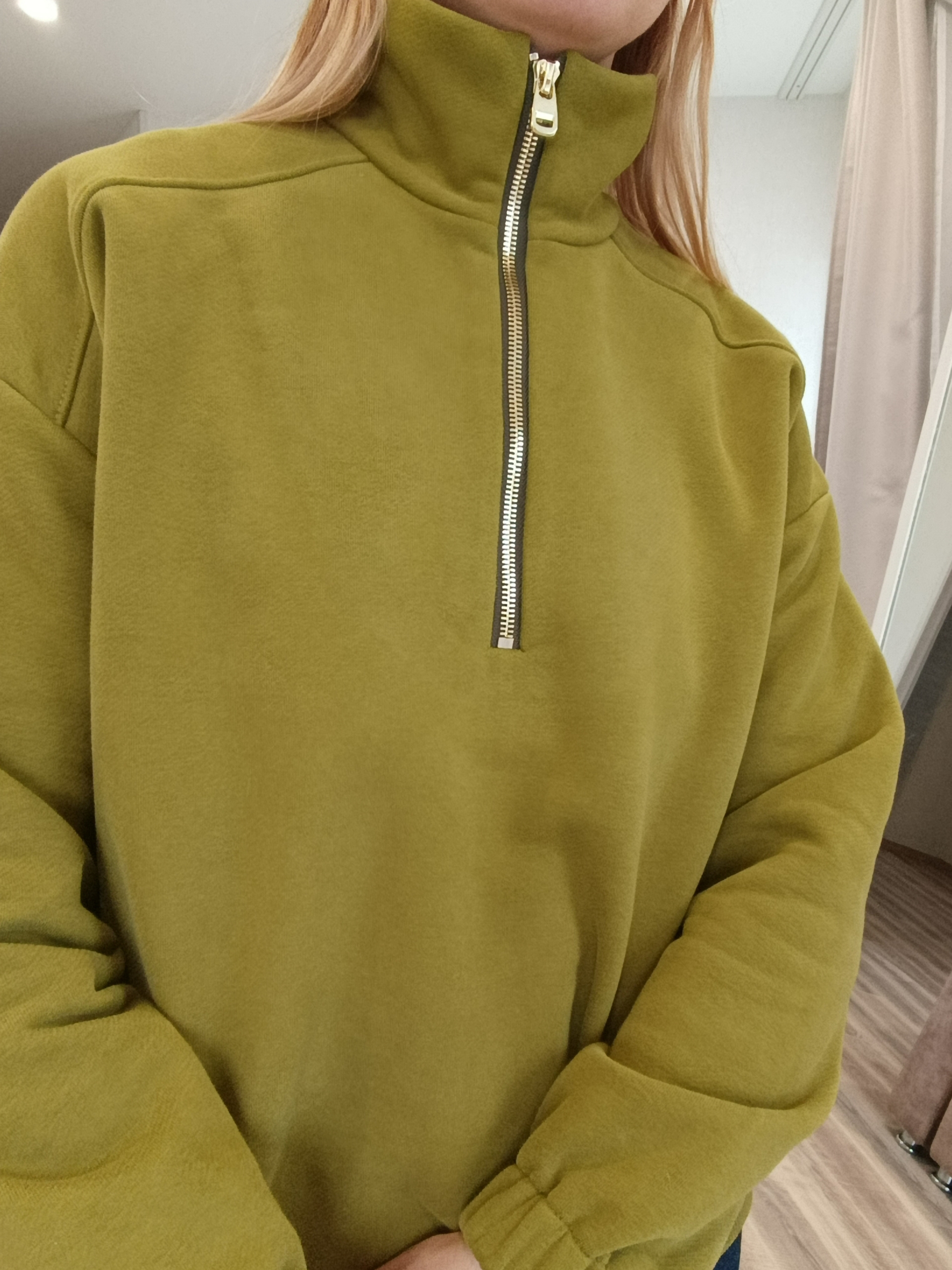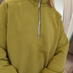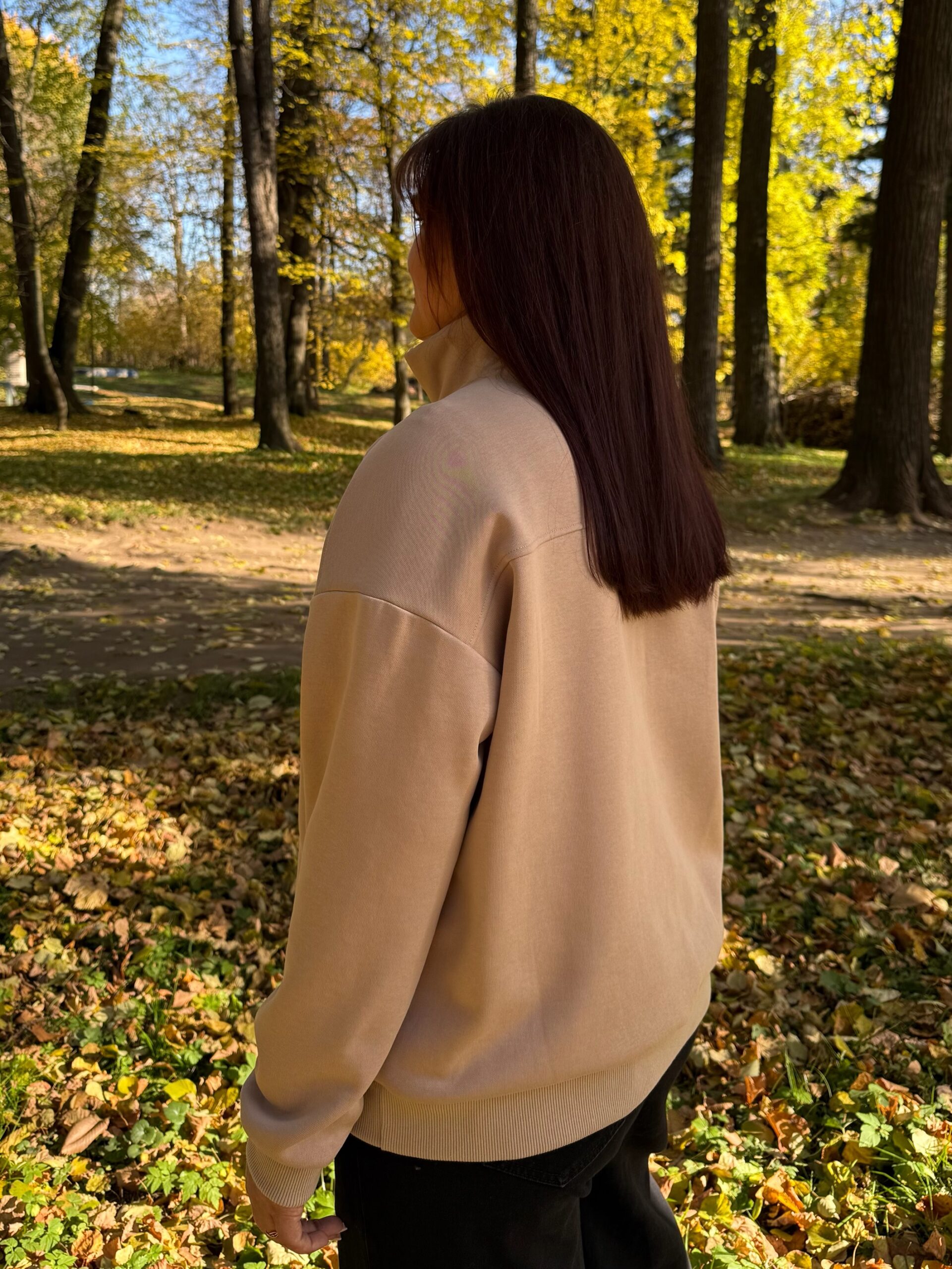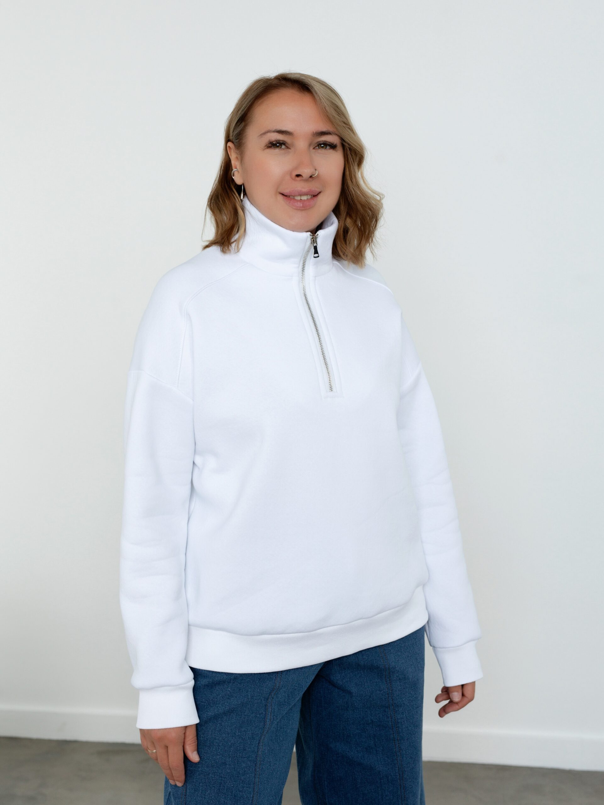 Женская толстовка свободного кроя, прямого силуэта, линия плеча спущена, длинный рукав, по низу рукава манжета из кашкорсе/рибаны с лайкрой, по спинке кокетка, переходящая на сторону переда, горловина округлой формы и оформлена воротником стойкой из основного трикотажа, по центру переда застежка на короткую не разъемную молнию, низ изделия оформлен манжетой из кашкорсе/рибаны с лайкрой.