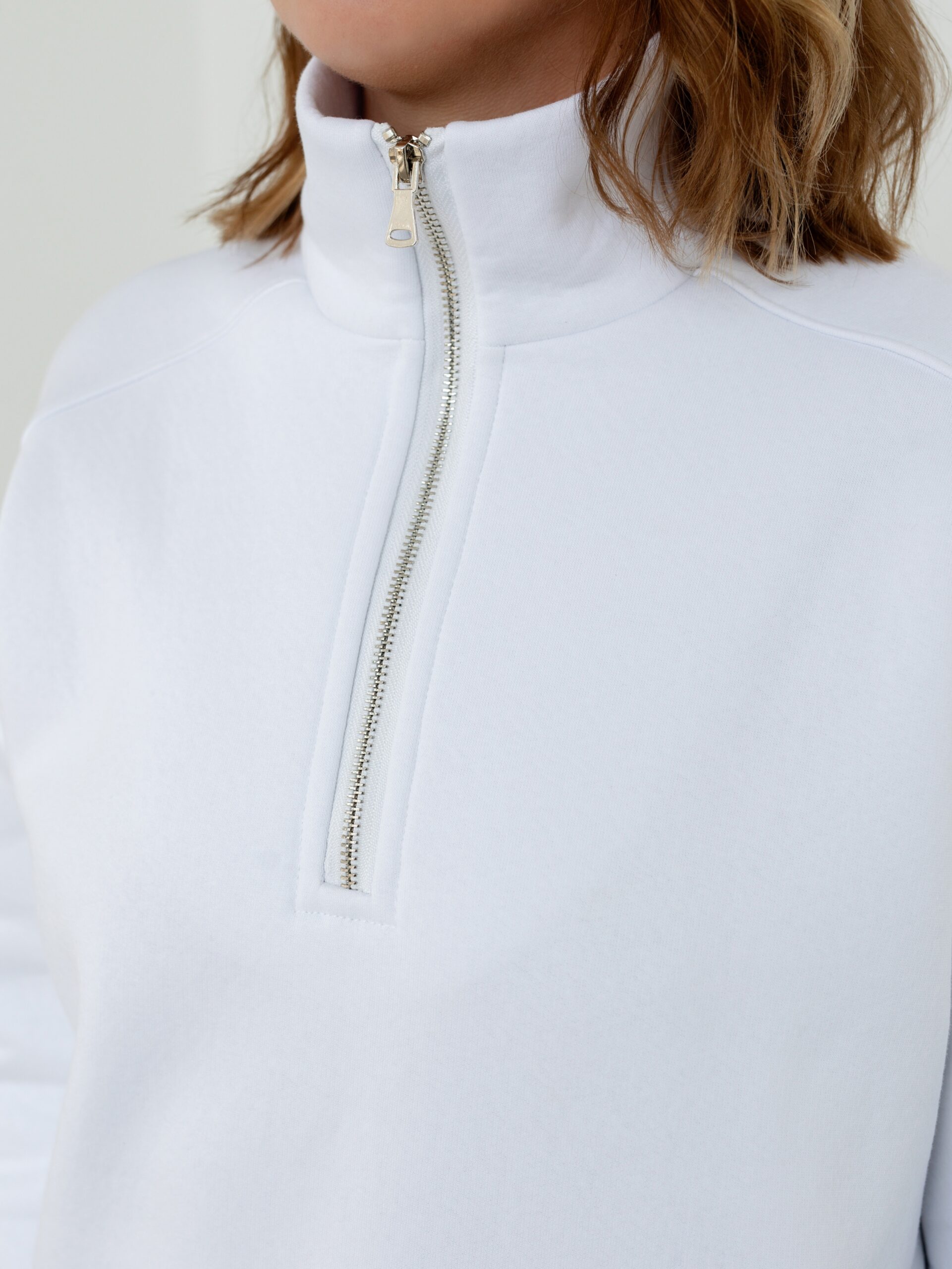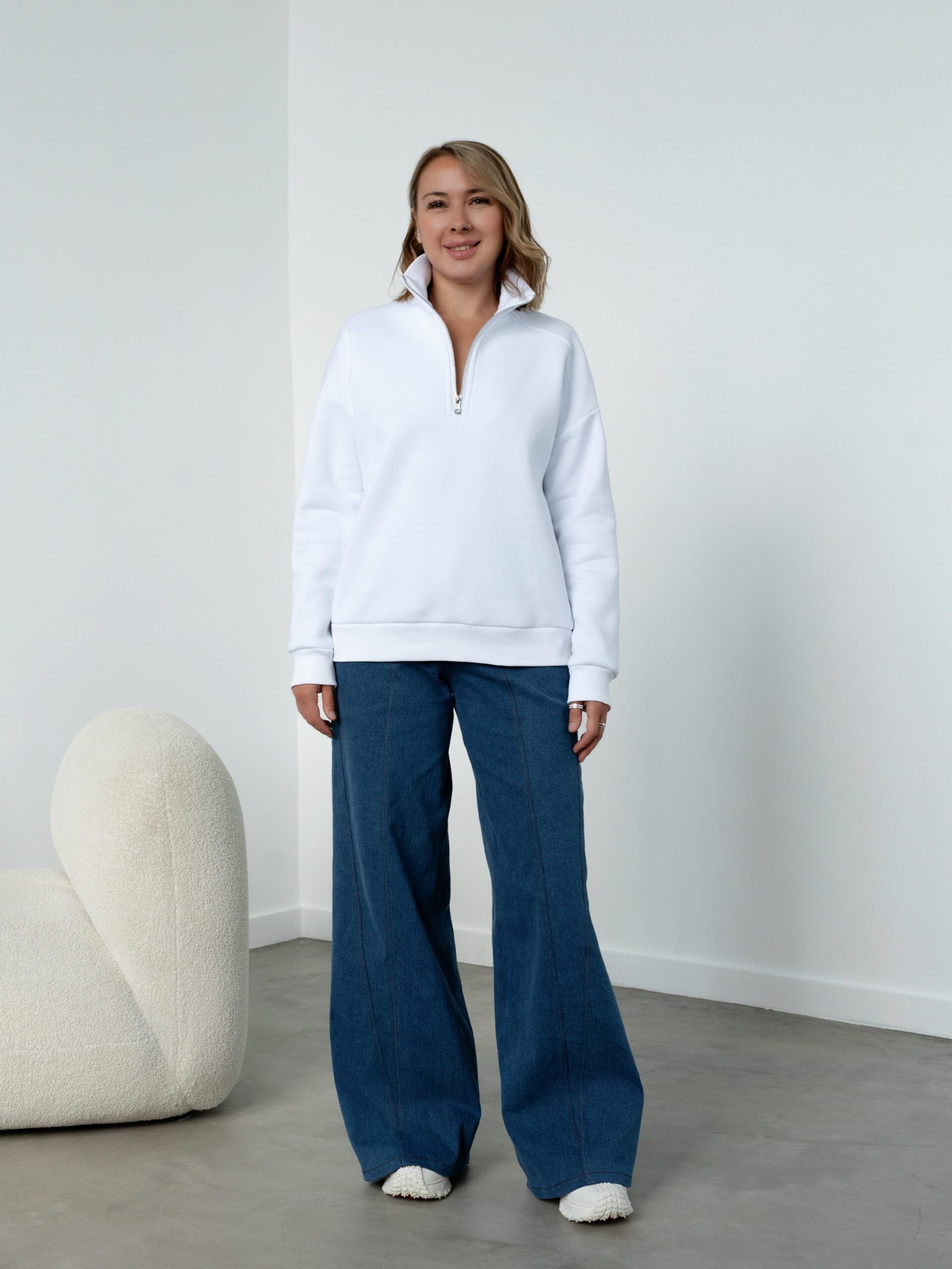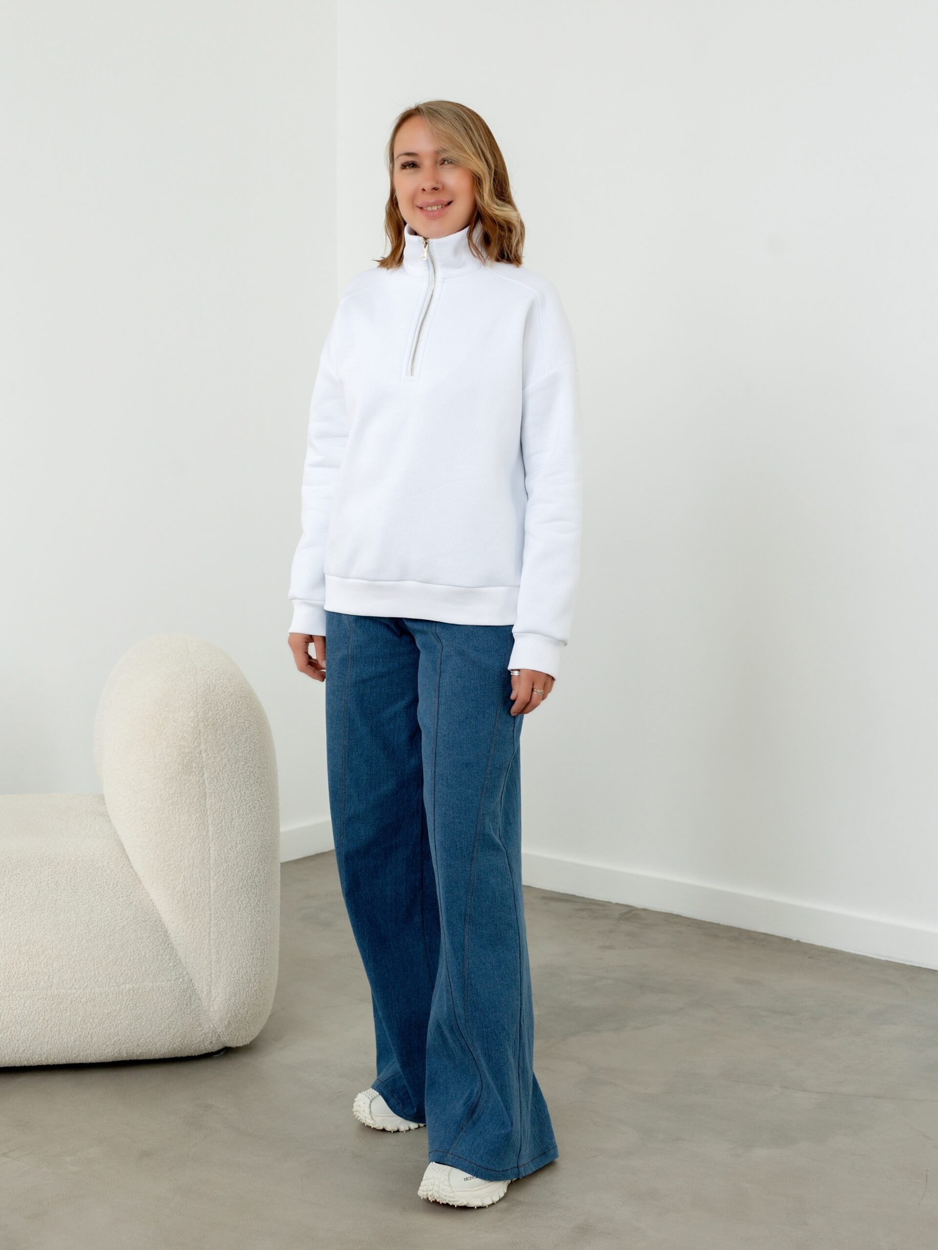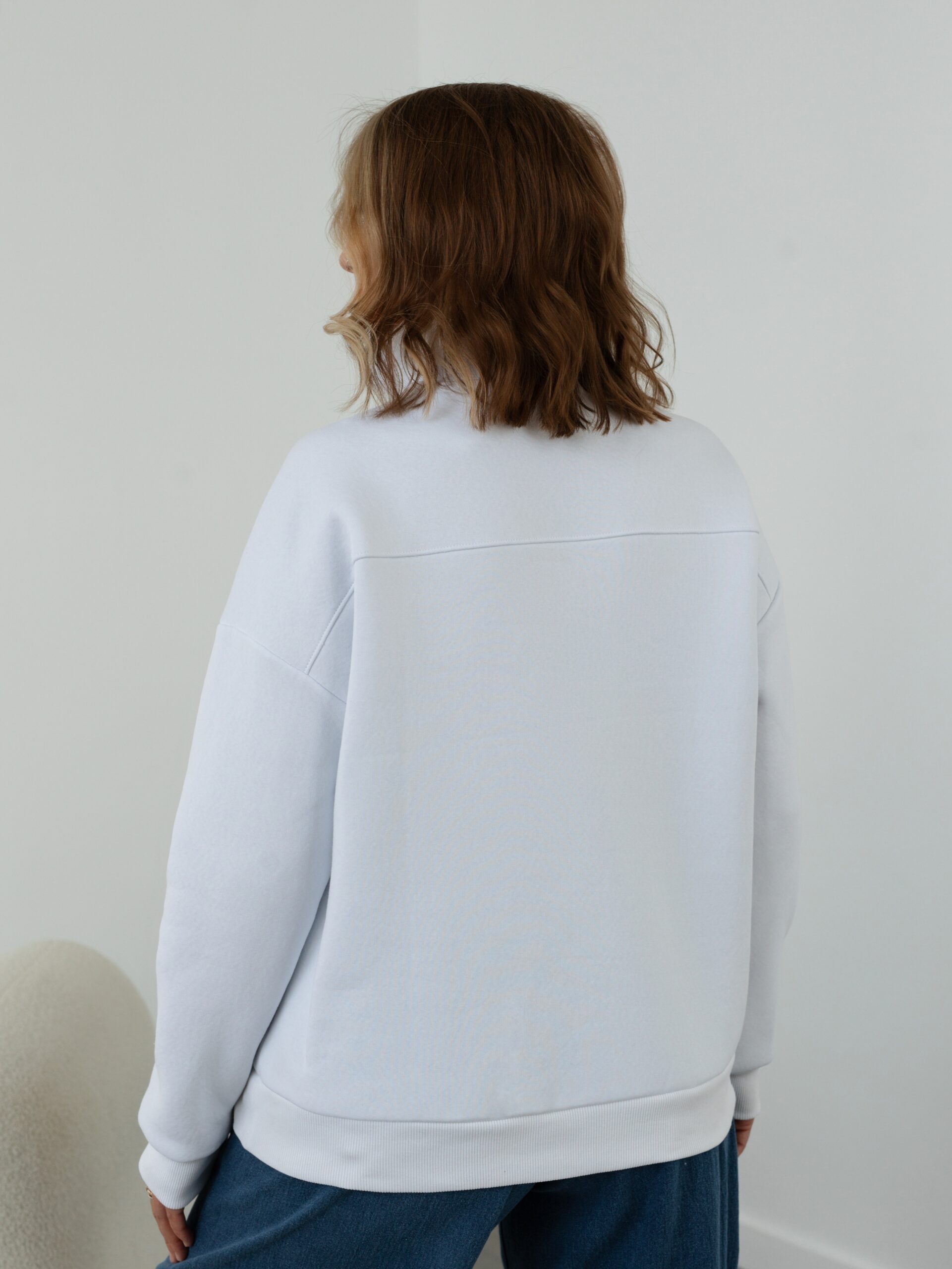 Женская толстовка свободного кроя, прямого силуэта, линия плеча спущена, длинный рукав, по низу рукава манжета из кашкорсе/рибаны с лайкрой, по спинке кокетка, переходящая на сторону переда, горловина округлой формы и оформлена воротником стойкой из основного трикотажа, по центру переда застежка на короткую не разъемную молнию, низ изделия оформлен манжетой из кашкорсе/рибаны с лайкрой.