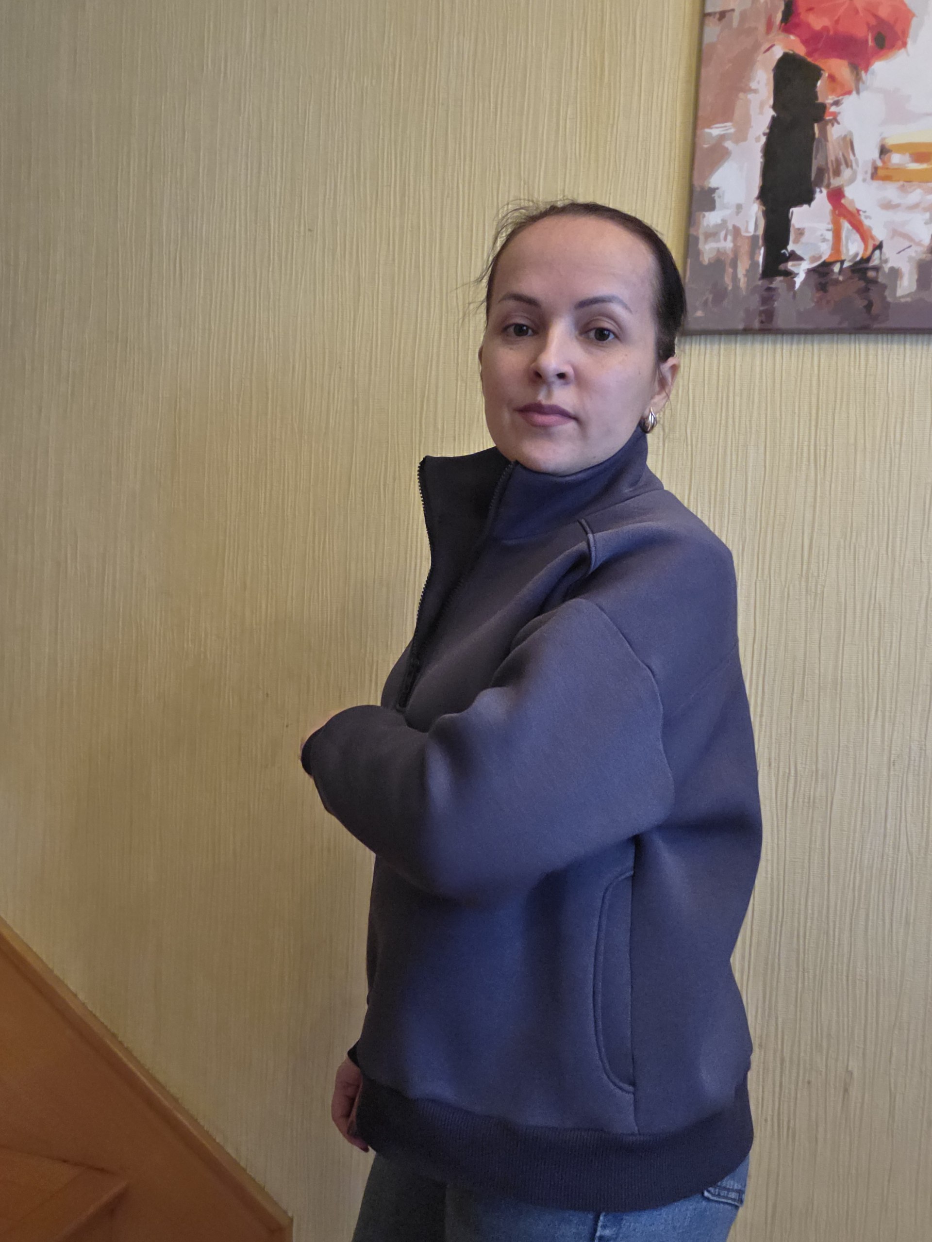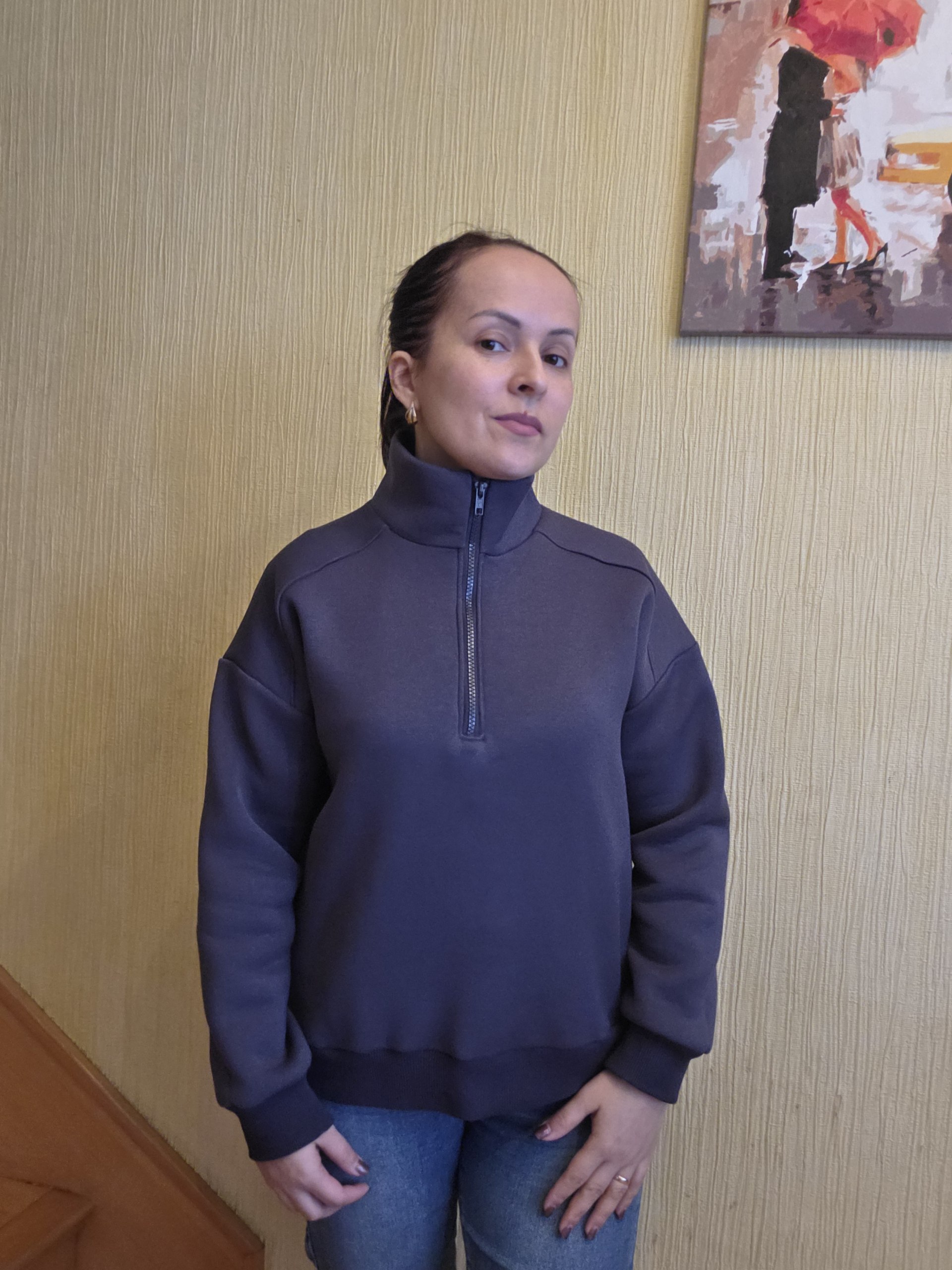 Модель Елена, толстовка 44 размера рост 170 см, реальный размер (на момент фотосессии) 44 рост 167 см. Параметры тела: ОГ 88 см, ОТ 74 см, ОБ 98 см. Размер выбран по обхвату груди. Сшита из футера трехнитки с начесом плотностью 330 гр/м2, состав: 65% хлопок, 35% пэ. Также на Елене джинсы по выкройке «Имоджен».