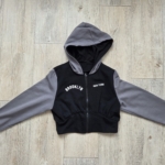 Женская укороченная толстовка среднего объема, прямого силуэта, длинный рукав, низ рукава оформлен двойной притачной манжетой из кашкорсе, низ толстовки оформлен двойным притачным поясом, центральная застежка на разъемную молнию, горловина оформлена одношовным капюшоном на подкладке, по краю капюшона кулиска с люверсами, через которые продет шнур, длина толстовки чуть ниже линии талии.