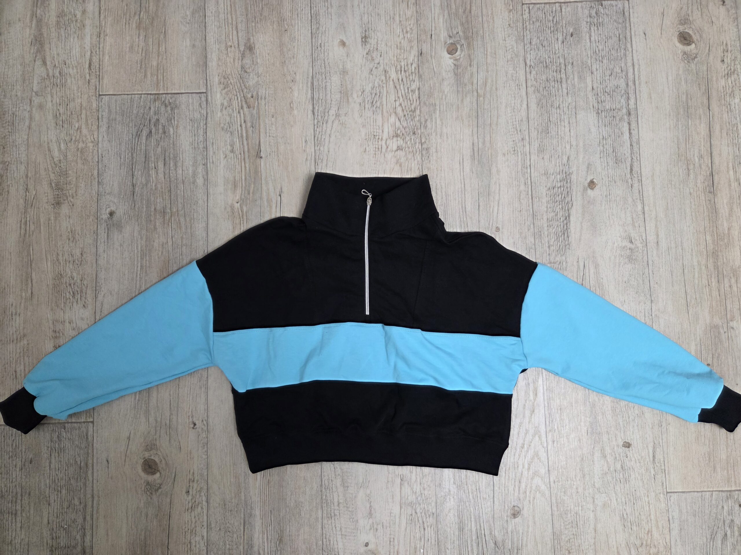 Женская толстовка свободного кроя прямого силуэта, линия плеча спущена, длинный рукав, по низу рукава двойная притачная манжета из кашкорсе, на передней части горизонтальные и вертикальные подрезы, по центру переда пришита короткая неразъемная молния, горловина оформлена воротником стойкой из основного трикотажа, два варианта длины толстовки: ниже линии талии и ниже линии бедер, по низу изделия двойная притачная манжета из кашкорсе.